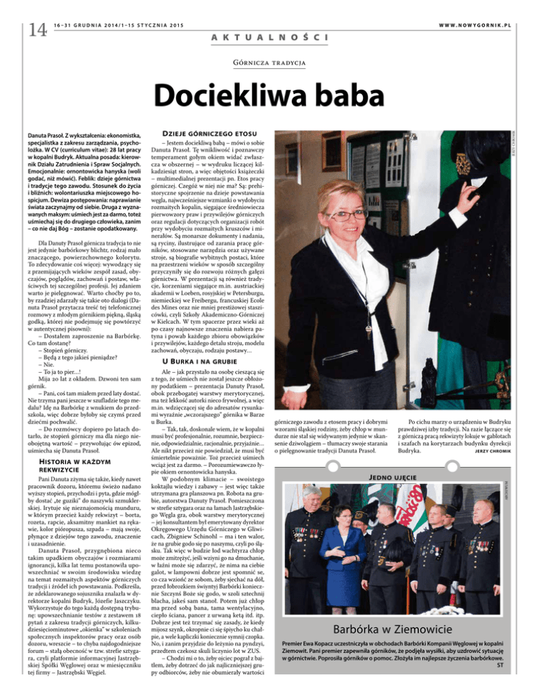 14 W W W.NOW YGORNIK.PL 16 –31 G R U D N I A 2 014 /1–15 S T YC Z N I A 2 015 A K T U A L N O Ś C I Górnicza tradycja Dociekliwa baba Dla Danuty Prasoł górnicza tradycja to nie jest jedynie barbórkowy blichtr, rodzaj mało znaczącego, powierzchownego kolorytu. To zdecydowanie coś więcej: wywodzący się z przemijających wieków zespół zasad, obyczajów, poglądów, zachowań i postaw, właściwych tej szczególnej profesji. Jej zdaniem warto je pielęgnować. Warto choćby po to, by rzadziej zdarzały się takie oto dialogi (Danuta Prasoł przytacza treść tej telefonicznej rozmowy z młodym górnikiem piękną, śląską godką, której nie podejmuję się powtórzyć w autentycznej pisowni): – Dostałem zaproszenie na Barbórkę. Co tam dostanę? – Stopień górniczy. – Będą z tego jakieś pieniądze? – Nie. – To ja to pier…! Mija 20 lat z okładem. Dzwoni ten sam górnik. – Pani, coś tam miałem przed laty dostać. Nie trzyma pani jeszcze w szufladzie tego medalu? Idę na Barbórkę z wnukiem do przedszkola, więc dobrze byłoby się czymś przed dziećmi pochwalić. – Do rozmówcy dopiero po latach dotarło, że stopień górniczy ma dla niego nieobojętną wartość – przywołując ów epizod, uśmiecha się Danuta Prasoł. H istoria w każdym rekwizycie Pani Danuta zżyma się także, kiedy nawet pracownik dozoru, któremu świeżo nadano wyższy stopień, przychodzi i pyta, gdzie mógłby dostać „te guziki” do naszywki szmuklerskiej. Irytuje się nieznajomością munduru, w którym przecież każdy rekwizyt – borta, rozeta, rapcie, aksamitny mankiet na rękawie, kolor pióropusza, szpada – mają swoje, płynące z dziejów tego zawodu, znaczenie i uzasadnienie. Danuta Prasoł, przygnębiona nieco takim upadkiem obyczajów i rozmiarami ignorancji, kilka lat temu postanowiła upowszechniać w swoim środowisku wiedzę na temat rozmaitych aspektów górniczych tradycji i źródeł ich powstawania. Podkreśla, że zdeklarowanego sojusznika znalazła w dyrektorze kopalni Budryk, Józefie Jaszczyku. Wykorzystuje do tego każdą dostępną trybunę: upowszechnianie testów z zestawem 18 pytań z zakresu tradycji górniczych, kilkudziesięciominutowe „okienka” w szkoleniach społecznych inspektorów pracy oraz osób dozoru, wreszcie – to chyba najdogodniejsze forum – stałą obecność w tzw. strefie sztygara, czyli platformie informacyjnej Jastrzębskiej Spółki Węglowej oraz w miesięczniku tej firmy – Jastrzębski Węgiel. JERZY CHROMIK D zieje górniczego etosu – Jestem dociekliwą babą – mówi o sobie Danuta Prasoł. Tę wnikliwość i poznawczy temperament gołym okiem widać zwłaszcza w obszernej – w wydruku liczącej kilkadziesiąt stron, a więc objętości książeczki – multimedialnej prezentacji pn. Etos pracy górniczej. Czegóż w niej nie ma? Są: prehistoryczne spojrzenie na dzieje powstawania węgla, najwcześniejsze wzmianki o wydobyciu rozmaitych kopalin, sięgające średniowiecza pierwowzory praw i przywilejów górniczych oraz regulacji dotyczących organizacji robót przy wydobyciu rozmaitych kruszców i minerałów. Są monarsze dokumenty i nadania, są ryciny, ilustrujące od zarania pracę górników, stosowane narzędzia oraz używane stroje, są biografie wybitnych postaci, które na przestrzeni wieków w sposób szczególny przyczyniły się do rozwoju różnych gałęzi górnictwa. W prezentacji są również tradycje, korzeniami sięgające m.in. austriackiej akademii w Loeben, rosyjskiej w Petersburgu, niemieckiej we Freibergu, francuskiej Ecole des Mines oraz nie mniej prestiżowej staszicówki, czyli Szkoły Akademiczno-Górniczej w Kielcach. W tym spacerze przez wieki aż po czasy najnowsze znaczenia nabiera patyna i powab każdego zbioru obowiązków i przywilejów, każdego detalu stroju, modelu zachowań, obyczaju, rodzaju postawy… U B urka i na grubie Ale – jak przystało na osobę cieszącą się z tego, że uśmiech nie został jeszcze obłożony podatkiem – prezentacja Danuty Prasoł, obok przebogatej warstwy merytorycznej, ma też lekkość autorki nieco frywolnej, a więc m.in. wdzięczącej się do adresatów rysunkami wyraźnie „wczorajszego” górnika w Barze u Burka. – Tak, tak, doskonale wiem, że w kopalni musi być profesjonalnie, rozumnie, bezpiecznie, odpowiedzialnie, racjonalnie, przyjaźnie… Ale nikt przecież nie powiedział, że musi być śmiertelnie poważnie. Toż przecież uśmiech wciąż jest za darmo. – Porozumiewawczo łypie okiem ornontowicka hanyska. W podobnym klimacie – swoistego koktajlu wiedzy i zabawy – jest więc także utrzymana gra planszowa pn. Robota na grubie, autorstwa Danuty Prasoł. Pomieszczona w strefie sztygara oraz na łamach Jastrzębskiego Węgla gra, obok warstwy merytorycznej – jej konsultantem był emerytowany dyrektor Okręgowego Urzędu Górniczego w Gliwicach, Zbigniew Schinohl – ma i ten walor, że na grubie godo się po naszymu, czyli po śląsku. Tak więc w budzie łod wachtyrza chłop może zmitrężyć, jeśli wziyni go na dmuchanie, w łaźni może się zdarzyć, że nima na ciebie galot, w lampowni dobrze jest spomnić se, co cza wziońć ze sobom, żeby sjechać na dół, przed łobrozkiem świyntyj Barbórki koniecznie Szczynś Boże się godo, w szoli sztechnij blacha, jakeś sam stanoł. Potem już chłop ma przed sobą bana, tama wentylacyjno, ciepło ściana, pancer z urwaną ketą itd. itp. Dobrze jest też trzymać się zasady, że kiedy mijosz szynk, okropnie ci się śpiycho ku chałpie, a wele kapliczki koniecznie symnij czopka. No, i zanim przyjdzie do leżynio na pyndzyi, przedtem czekosz skuli liczynio lot w ZUS. – Chodzi mi o to, żeby ojciec pograł z bajtlem, żeby dotrzeć do jak najliczniejszej grupy odbiorców, żeby nie obumierały wartości górniczego zawodu z etosem pracy i dobrymi wzorami śląskiej rodziny, żeby chłop w mundurze nie stał się widywanym jedynie w skansen