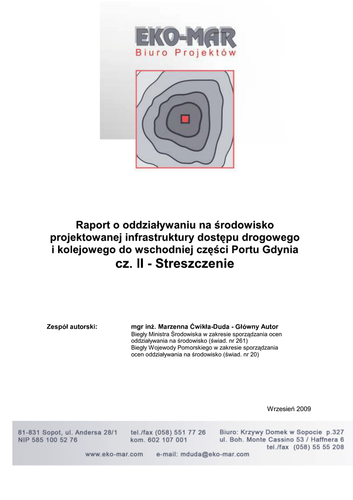 Biegły Ministra Środowiska w zakresie sporządzania ocen oddziaływania na środowisko (świad. nr 261) Biegły Wojewody Pomorskiego w zakresie sporządzania ocen oddziaływania na środowisko (świad. nr 20) Wrzesień 2009 3 „ ” - został wykonany w celu uzyskania decyzji o środowiskowych uwarunkowaniach dla przedsięwzięcia polegającego na: • Budowie odcinka ulicy Polskiej (ok. 0,4 km) pomiędzy wybudowanym rondem (skrzyżowanie ul. Polskiej z ul. Chrzanowskiego) a Placem Gombrowicza (przy budynku Dworca Morskiego) wraz z przebudową tego placu i parkingu w tym rejonie projektowany odcinek ulicy Polskiej zostanie przesunięty na południe (w kierunku torów kolejowych) w stosunku do stanu istniejącego (istniejący odcinek ulicy Polskiej zostanie rozebrany) • Budowie nawierzchni drogowej w II strefie Nb. Polskiego na odcinku od ul. Rotterdamskiej do magazynu 2 – przewiduje się dwie ścieżki dla potrzeb przyszłej suwnicy bramowej* oraz dwie drogi technologiczne – ładunkową i powrotną. • Budowie parkingu samochodów osobowych na 149 miejsc postojowych pomiędzy pasami ulicy Polskiej (w rejonie nr 9, 13) oraz drogi komunikacyjnej łączącej obydwa pasy ulicy Polskiej (parking przewidziano na terenie po budynkach przewidzianych do rozbiórki). • Przebudowie i modernizacji infrastruktury kolejowej – na odcinku od placu składowego nr VIII w II strefie Nb. Polskiego do ok. 200 m za ulicą Celną w kierunku Al. Solidarności • Rozbiórce obiektów kubaturowych w rejonie lokalizacji przedsięwzięcia oraz niezbędnej rozbiórce, przebudowie i budowie odcinków sieci (energetycznych, teletechnicznych, wodociągowej, ciepłowniczej, oświetleniowej oraz kanalizacji sanitarnej i deszczowej) W raporcie uwzględniono oprócz ww. przedsięwzięcia szerszy zakres tzn. powiązane z przedsięwzięciem elementy układu komunikacyjnego umożliwiające dostęp do wschodniej części portu (na wykonanie których zostały wydane stosowne decyzje i pozwolenia). Raport obejmuje całą ulicę Polską, a zatem zarówno planowane przedsięwzięcie (tj. odcinek od skrzyżowania z ul. Chrzanowskiego do Dworca Morskiego), jak również dalszą część ul. * Suwnica bramowa jest urządzeniem dźwigowym i transportowym, składającym się z pomostu zawieszonego na dwóch bocznych mostach. Konstrukcja nośna suwnicy bramowej porusza się po torowisku ułożonym na poziomie gruntu. Biuro Projektów EKO-MAR 4 Polskiej od skrzyżowania z ul. Chrzanowskiego do skrzyżowania z ul. Janka Wiśniewskiego. Raport uwzględnia również ulicę Chrzanowskiego i ulicę Wendy. Ponadto dwa parkingi przy ulicy Chrzanowskiego: parking samochodów ciężarowych w rejonie Chrzanowskiego nr 6 i 8 (130 miejsc) oraz parking samochodów osobowych w rejonie Chrzanowskiego nr 3/5 przy budynku przychodni zdrowia (60 miejsc). W raporcie uwzględniono również dwa małe parkingi samochodów osobowych w rejonie skrzyżowania ul. Polskiej z ul. Celną - przy Celnej 5 (33 miejsca) i Polskiej 39 A (31 miejsc). Zgodnie z ustawą z dnia 3 października 2008 roku o udostępnianiu informacji o środowisku i jego ochronie, udziale społeczeństwa o ochronie środowiska oraz o ocenach oddziaływania na środowisko (Dz. U. Nr 199, poz. 1227 ze zm.) uzyskanie decyzji o środowiskowych uwarunkowaniach jest wymagane dla przedsięwzięć mogących znacząco oddziaływać na środowisko wymienionych w rozporządzeniu Rady Ministrów z dnia 9 listopada 2004 roku w sprawie określenia rodzajów przedsięwzięć mogących znacząco oddziaływać na środowisko oraz szczegółowych uwarunkowań związanych z kwalifikowaniem przedsięwzięcia do sporządzenia raportu o oddziaływaniu na środowisko (Dz. U. Nr 257, poz. 2573 ze zm.). W związku z różnicami interpretacji przepisów dotyczących kwalifikacji przedsięwzięcia, po konsultacji z Regionalną Dyrekcją Ochrony Środowiska w Gdańsku przyjęto, że planowane przedsięwzięcie jako infrastruktura portowa jest zaliczone do przedsięwzięć „zawsze znacząco oddziaływujących na środowisko” wymienionych w par. 2 ust. 1 - pkt 32 „porty lub przystanie morskie, w rozumieniu ustawy z dnia 20 grudnia 1996 roku o portach i przystaniach morskich (...)”. Inna interpretacja przepisów dotyczących kwalifikacji przedsięwzięcia na podstawie ww. rozporządzenia również zalicza inwestycję do przedsięwzięć „zawsze znacząco oddziaływujących na środowisko” na podstawie § 2 ust. 2 pkt 1a (przedsięwzięcie realizowane na terenie portu morskiego wymienionego w § 2 ust.1 pkt 32) wymienione w § 3 ust. 1 pkt 56) „drogi publiczne o nawierzchni utwardzonej ...”. Dla przedsięwzięć „zawsze znacząco oddziaływujących na środowisko” przeprowadzenie oceny oddziaływania na środowisko jest wymagane, a obowiązek sporządzenia raportu jest obligatoryjny. Zgodnie z Załącznikiem II Dyrektywy 85/337/EWG z dnia 27 czerwca 1985 r w sprawie oceny wpływu wywieranego przez niektóre publiczne i prywatne przedsięwzięcia na środowisko (Dz.U. UE L z dnia 5 lipca 1985 r. z późniejszymi zmianami) omawiane przedsięwzięcie jako przedsięwzięcie infrastrukturalne (pkt.10. ppkt. e „budowa dróg, portów i urządzeń portowych ...”) podlega ocenie zgodnie z art. 5 − 10 Dyrektywy, jeżeli Państwa Członkowskie uznają, że wymóg taki wynika z cech tych przedsięwzięć. Biuro Projektów EKO-MAR 5 Należy podkreślić, że „Raport o oddziaływaniu na środowisko infrastruktury dostępu drogowego i kolejowego do wschodniej części Portu Gdynia” będzie wchodził w skład dokumentacji Zarządu Morskiego Portu Gdynia S.A. ubiegającego się o dofinansowanie ze środków UE przedsięwzięcia: „Infrastruktura dostępu drogowego i kolejowego do wschodniej części Portu Gdynia” − inwestycja w ramach projektu ujętego, jako podstawowy, pod numerem POIiŚ 7.2−2 na liście projektów indywidualnych (MP nr 58/2008 Poz. 521 z dnia 13 sierpnia 2008) w ramach Pr