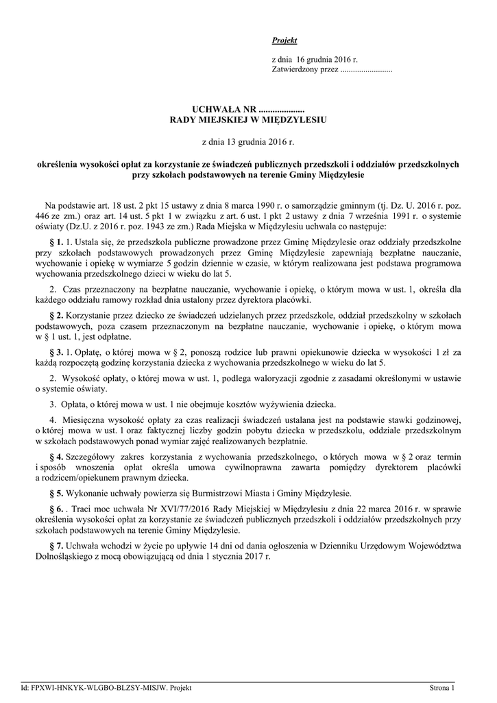 Projekt z dnia 16 grudnia 2016 r. Zatwierdzony przez ......................... UCHWAŁA NR .................... RADY MIEJSKIEJ W MIĘDZYLESIU z dnia 13 grudnia 2016 r. określenia wysokości opłat za korzystanie ze świadczeń publicznych przedszkoli i oddziałów przedszkolnych przy szkołach podstawowych na terenie Gminy Międzylesie Na podstawie art. 18 ust. 2 pkt 15 ustawy z dnia 8 marca 1990 r. o samorządzie gminnym (tj. Dz. U. 2016 r. poz. 446 ze zm.) oraz art. 14 ust. 5 pkt 1 w związku z art. 6 ust. 1 pkt 2 ustawy z dnia 7 września 1991 r. o systemie oświaty (Dz.U. z 2016 r. poz. 1943 ze zm.) Rada Miejska w Międzylesiu uchwala co następuje: § 1. 1. Ustala się, że przedszkola publiczne prowadzone przez Gminę Międzylesie oraz oddziały przedszkolne przy szkołach podstawowych prowadzonych przez Gminę Międzylesie zapewniają bezpłatne nauczanie, wychowanie i opiekę w wymiarze 5 godzin dziennie w czasie, w którym realizowana jest podstawa programowa wychowania przedszkolnego dzieci w wieku do lat 5. 2. Czas przeznaczony na bezpłatne nauczanie, wychowanie i opiekę, o którym mowa w ust. 1, określa dla każdego oddziału ramowy rozkład dnia ustalony przez dyrektora placówki. § 2. Korzystanie przez dziecko ze świadczeń udzielanych przez przedszkole, oddział przedszkolny w szkołach podstawowych, poza czasem przeznaczonym na bezpłatne nauczanie, wychowanie i opiekę, o którym mowa w § 1 ust. 1, jest odpłatne. § 3. 1. Opłatę, o której mowa w § 2, ponoszą rodzice lub prawni opiekunowie dziecka w wysokości 1 zł za każdą rozpoczętą godzinę korzystania dziecka z wychowania przedszkolnego w wieku do lat 5. 2. Wysokość opłaty, o której mowa w ust. 1, podlega waloryzacji zgodnie z zasadami określonymi w ustawie o systemie oświaty. 3. Opłata, o której mowa w ust. 1 nie obejmuje kosztów wyżywienia dziecka. 4. Miesięczna wysokość opłaty za czas realizacji świadczeń ustalana jest na podstawie stawki godzinowej, o której mowa w ust. 1 oraz faktycznej liczby godzin pobytu dziecka w przedszkolu, oddziale przedszkolnym w szkołach podstawowych ponad wymiar zajęć realizowanych bezpłatnie. § 4. Szczegółowy zakres korzystania z wychowania przedszkolnego, o których mowa w § 2 oraz termin i sposób wnoszenia opłat określa umowa cywilnoprawna zawarta pomiędzy dyrektorem placówki a rodzicem/opiekunem prawnym dziecka. § 5. Wykonanie uchwały powierza się Burmistrzowi Miasta i Gminy Międzylesie. § 6. . Traci moc uchwała Nr XVI/77/2016 Rady Miejskiej w Międzylesiu z dnia 22 marca 2016 r. w sprawie określenia wysokości opłat za korzystanie ze świadczeń publicznych przedszkoli i oddziałów przedszkolnych przy szkołach podstawowych na terenie Gminy Międzylesie. § 7. Uchwała wchodzi w życie po upływie 14 dni od dania ogłoszenia w Dzienniku Urzędowym Województwa Dolnośląskiego z mocą obowiązującą od dnia 1 stycznia 2017 r. Id: FPXWI-HNKYK-WLGBO-BLZSY-MISJW. Projekt Strona 1 Uzasadnienie Na podstawie art. 2 pkt 1 ustawy z dnia 1 grudnia 2016 r. o zmianie ustawy o dochodach jednostek samorządu terytorialnego oraz niektórych innych ustaw (Dz.U. 2016 r. poz.1985) w ustawie o systemie oświaty wprowadzona została zmiana art. 14 ust. 5 pkt 1 in principio nowe brzemiennie: ”określa wysokość opłat za korzystanie z wychowania przedszkolnego dzieci w wieku do lat 5 w prowadzonych przez gminę”, dotychczasowy zapis „określa wysokość opłat za korzystanie z wychowania przedszkolnego w prowadzonych przez gminę”. Zgodnie z art. 5 ustawy z dnia 1 grudnia 2016 r. przepisy stosuje się po raz pierwszy do ustalenia na rok 2017 części oświatowej subwencji ogólnej dla jednostek samorządu terytorialnego oraz ustawy budżetowej i uchwał budżetowych na rok 2017. Zmiana ta jest spowodowana przekazywaniem od 1 stycznia 2017 r. dla jst części oświatowej subwencji za dzieci 6-letnie korzystające z wychowania przedszkolnego. Zgodnie z art. 4 ust. 1 ustawy z 20 lipca 2000 r. o ogłaszaniu aktów normatywnych i niektórych innych aktów prawnych (Dz.U. z 2016 r. poz. 296 ze zm.) akty normatywne, zawierające przepisy powszechnie obowiązujące, ogłaszane w dziennikach urzędowych wchodzą w życie po upływie czternastu dni od dnia ich ogłoszenia chyba, że dany akt normatywny określa termin dłuższy. Przepisy powołanej ustawy nie wyłączają możliwości nadania aktowi normatywnemu wstecznej mocy obowiązującej, jeżeli zasady demokratycznego państwa prawnego nie stoją temu na przeszkodzie (art. 5 ustawy z 20 lipca 2000 r.). Podjęta uchwała działa na korzyść rodziców, a czas dany gminom na dostosowanie regulacji jest zbyt krótki. Zatem nadana moc wsteczna jest jak najbardziej dopuszczalna. Id: FPXWI-HNKYK-WLGBO-BLZSY-MISJW. Projekt Strona 1