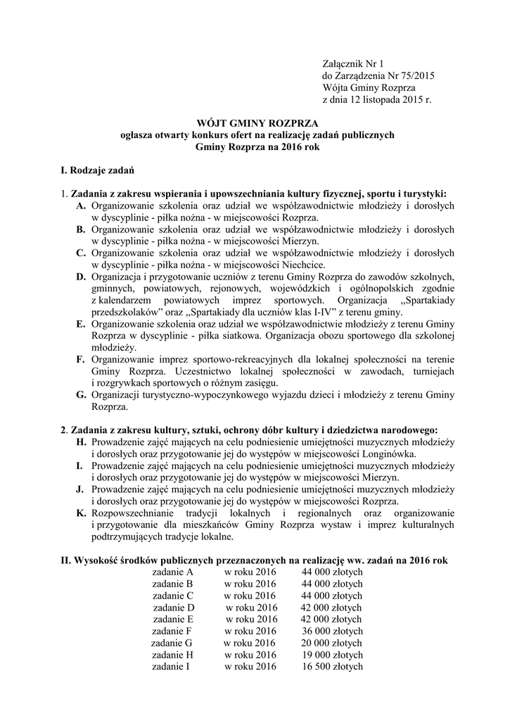 Załącznik Nr 1 do Zarządzenia Nr 75/2015 Wójta Gminy Rozprza z dnia 12 listopada 2015 r. WÓJT GMINY ROZPRZA ogłasza otwarty konkurs ofert na realizację zadań publicznych Gminy Rozprza na 2016 rok I. Rodzaje zadań 1. Zadania z zakresu wspierania i upowszechniania kultury fizycznej, sportu i turystyki: A. Organizowanie szkolenia oraz udział we współzawodnictwie młodzieży i dorosłych w dyscyplinie - piłka nożna - w miejscowości Rozprza. B. Organizowanie szkolenia oraz udział we współzawodnictwie młodzieży i dorosłych w dyscyplinie - piłka nożna - w miejscowości Mierzyn. C. Organizowanie szkolenia oraz udział we współzawodnictwie młodzieży i dorosłych w dyscyplinie - piłka nożna - w miejscowości Niechcice. D. Organizacja i przygotowanie uczniów z terenu Gminy Rozprza do zawodów szkolnych, gminnych, powiatowych, rejonowych, wojewódzkich i ogólnopolskich zgodnie z kalendarzem powiatowych imprez sportowych. Organizacja ,,Spartakiady przedszkolaków” oraz ,,Spartakiady dla uczniów klas I-IV” z terenu gminy. E. Organizowanie szkolenia oraz udział we współzawodnictwie młodzieży z terenu Gminy Rozprza w dyscyplinie - piłka siatkowa. Organizacja obozu sportowego dla szkolonej młodzieży. F. Organizowanie imprez sportowo-rekreacyjnych dla lokalnej społeczności na terenie Gminy Rozprza. Uczestnictwo lokalnej społeczności w zawodach, turniejach i rozgrywkach sportowych o różnym zasięgu. G. Organizacji turystyczno-wypoczynkowego wyjazdu dzieci i młodzieży z terenu Gminy Rozprza. 2. Zadania z zakresu kultury, sztuki, ochrony dóbr kultury i dziedzictwa narodowego: H. Prowadzenie zajęć mających na celu podniesienie umiejętności muzycznych młodzieży i dorosłych oraz przygotowanie jej do występów w miejscowości Longinówka. I. Prowadzenie zajęć mających na celu podniesienie umiejętności muzycznych młodzieży i dorosłych oraz przygotowanie jej do występów w miejscowości Mierzyn. J. Prowadzenie zajęć mających na celu podniesienie umiejętności muzycznych młodzieży i dorosłych oraz przygotowanie jej do występów w miejscowości Rozprza. K. Rozpowszechnianie tradycji lokalnych i regionalnych oraz organizowanie i przygotowanie dla mieszkańców Gminy Rozprza wystaw i imprez kulturalnych podtrzymujących tradycje lokalne. II. Wysokość środków publicznych przeznaczonych na realizację ww. zadań na 2016 rok zadanie A w roku 2016 44 000 złotych zadanie B w roku 2016 44 000 złotych zadanie C w roku 2016 44 000 złotych zadanie D w roku 2016 42 000 złotych zadanie E w roku 2016 42 000 złotych zadanie F w roku 2016 36 000 złotych zadanie G w roku 2016 20 000 złotych zadanie H w roku 2016 19 000 złotych zadanie I w roku 2016 16 500 złotych zadanie J zadanie K w roku 2016 w roku 2016 16 500 złotych 20 000 złotych Zastrzega się możliwość zmiany wysokości środków publicznych na poszczególne zadania w przypadku stwierdzenia, że zadanie można zrealizować mniejszym kosztem. III. Zasady przyznawania dotacji 1. Zlecenie zadania i udzielenie dotacji następuje z zastosowaniem przepisów art. 16 ustawy z dnia 24 kwietnia 2003 roku o działalności pożytku publicznego i o wolontariacie. 2. Wysokość dotacji może być niższa niż wnioskowana w ofercie. W takim przypadku oferentowi przysługuje prawo negocjowania zmniejszenia zakresu rzeczowego zadania lub rezygnacji z jego realizacji. 3. Złożenie oferty nie jest równoznaczne z przyznaniem dotacji. 4. Wójt Gminy Rozprza może odmówić podmiotowi wyłonionemu w konkursie przyznania dotacji i podpisania umowy w przypadku, gdy okaże sie, iż podmiot lub jego reprezentanci utracą zdolność do czynności prawnych, zostaną ujawnione nieznane wcześniej okoliczności podważające wiarygodność merytoryczną lub finansową oferenta. 5. Szczegółowe i ostateczne warunki realizacji, finansowania i rozliczania zadania reguluje umowa zawarta między oferentem a Gminą Rozprza. IV. Termin i warunki realizacji zadań: 1. Termin realizacji zadań 1) z zakresu wspierania i upowszechniania kultury fizycznej, sportu i turystyki: od dnia 2.01.2016 r. do dnia 31.12.2016 r. 2) z zakresu kultury, sztuki, ochrony dóbr kultury i dziedzictwa narodowego: od dnia 2.01.2016 r. do dnia 31.12.2016 r. 2. Zlecenie realizacji zadań publicznych Gminy Rozprza na 2016 rok nastąpi poprzez powierzenie organizacjom pozarządowym oraz podmiotom wymienionym w art. 3 ust. 3 ustawy z dnia 24 kwietnia 2003 roku o działalności pożytku publicznego i o wolontariacie wykonywania zadania wraz z udzieleniem dotacji na jego finansowanie. 3. Szczegółowe warunki realizacji, finansowania i rozliczania będzie regulować umowa zawarta pomiędzy Gminą Rozprza a Oferentem, którego oferta zostanie wybrana. V. Termin i miejsce składania ofert: Oferty należy składać w/g wzoru określonego w Rozporządzeniu Ministra Pracy i Polityki Społecznej z dnia 15 grudnia 2010 r. w sprawie wzoru oferty i ramowego wzoru umowy dotyczących realizacji zadania publicznego oraz wzoru sprawozdania z wykonania zadania (Dz. U. z 2011 r. Nr 6, poz. 25) wraz z załącznikami pod rygorem odrzucenia oferty, w formie pisemnej, w zamkniętej kopercie z napisem ,,Oferta na realizację zadania publicznego w 2016/ nazwa zadania/numer zadania zgodny z numeracją zawartą w ogłoszeniu” w Urzędzie Gminy w Rozprzy, Al. 900-lecia 3 (pok. nr 13), w terminie do dnia 7.12.2015 r. do godz. 1530. Koperta zawierać musi dane identyfikacyjne oferenta (pieczęć lub odręcznie zapisana nazwa i adres organizacji). Otwarcie ofert nastąpi dnia 8.12.2015 r. o godz. 1000 w sali nr 13 UG w Rozprzy. Do oferty należy dołączyć: 1. Kopia aktualnego odpisu z Krajowego Rejestru Sądowego, innego rejestru lub ewidencji stanowiący o podstawie prawnej działalności oferenta (aktualny oznacza, że wszystkie dane są zgodne za stanem faktycznym na dzień składania oferty). 2. W przypadku wyboru innego sposobu reprezentacji podmiotów składaj