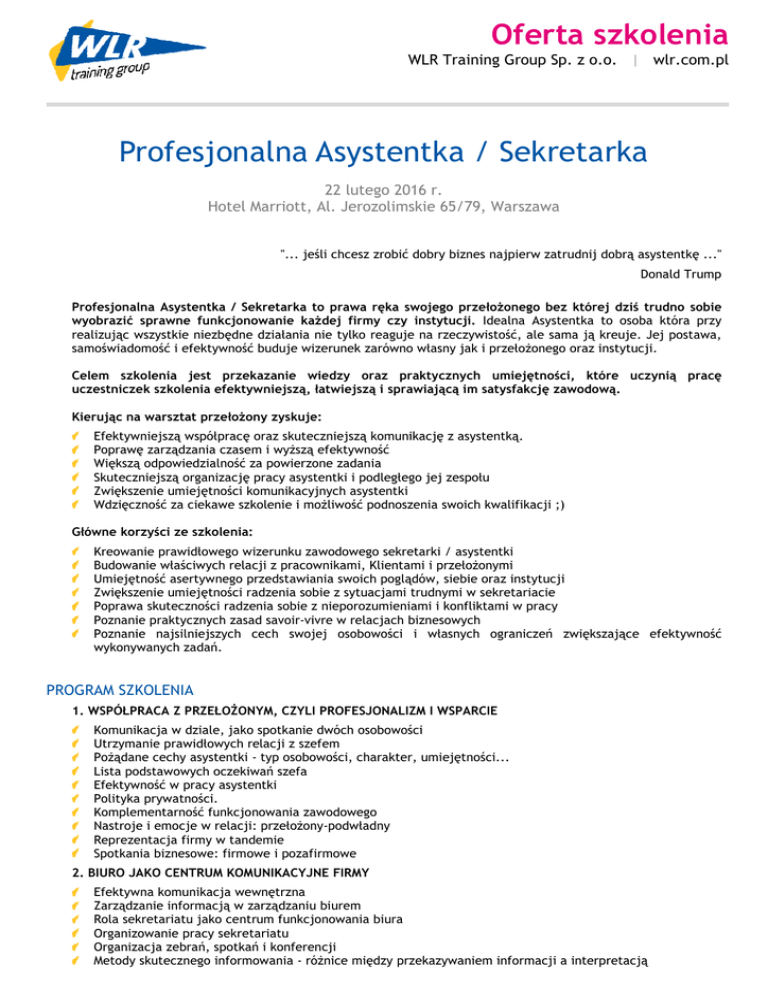 Oferta szkolenia WLR Training Group Sp. z o.o. | wlr.com.pl Profesjonalna Asystentka / Sekretarka 22 lutego 2016 r. Hotel Marriott, Al. Jerozolimskie 65/79, Warszawa "... jeśli chcesz zrobić dobry biznes najpierw zatrudnij dobrą asystentkę ..." Donald Trump Profesjonalna Asystentka / Sekretarka to prawa ręka swojego przełożonego bez której dziś trudno sobie wyobrazić sprawne funkcjonowanie każdej firmy czy instytucji. Idealna Asystentka to osoba która przy realizując wszystkie niezbędne działania nie tylko reaguje na rzeczywistość, ale sama ją kreuje. Jej postawa, samoświadomość i efektywność buduje wizerunek zarówno własny jak i przełożonego oraz instytucji. Celem szkolenia jest przekazanie wiedzy oraz praktycznych umiejętności, które uczynią pracę uczestniczek szkolenia efektywniejszą, łatwiejszą i sprawiającą im satysfakcję zawodową. Kierując na warsztat przełożony zyskuje: Efektywniejszą współpracę oraz skuteczniejszą komunikację z asystentką. Poprawę zarządzania czasem i wyższą efektywność Większą odpowiedzialność za powierzone zadania Skuteczniejszą organizację pracy asystentki i podległego jej zespołu Zwiększenie umiejętności komunikacyjnych asystentki Wdzięczność za ciekawe szkolenie i możliwość podnoszenia swoich kwalifikacji ;) Główne korzyści ze szkolenia: Kreowanie prawidłowego wizerunku zawodowego sekretarki / asystentki Budowanie właściwych relacji z pracownikami, Klientami i przełożonymi Umiejętność asertywnego przedstawiania swoich poglądów, siebie oraz instytucji Zwiększenie umiejętności radzenia sobie z sytuacjami trudnymi w sekretariacie Poprawa skuteczności radzenia sobie z nieporozumieniami i konfliktami w pracy Poznanie praktycznych zasad savoir-vivre w relacjach biznesowych Poznanie najsilniejszych cech swojej osobowości i własnych ograniczeń zwiększające efektywność wykonywanych zadań. PROGRAM SZKOLENIA 1. WSPÓŁPRACA Z PRZEŁOŻONYM, CZYLI PROFESJONALIZM I WSPARCIE Komunikacja w dziale, jako spotkanie dwóch osobowości Utrzymanie prawidłowych relacji z szefem Pożądane cechy asystentki - typ osobowości, charakter, umiejętności... Lista podstawowych oczekiwań szefa Efektywność w pracy asystentki Polityka prywatności. Komplementarność funkcjonowania zawodowego Nastroje i emocje w relacji: przełożony-podwładny Reprezentacja firmy w tandemie Spotkania biznesowe: firmowe i pozafirmowe 2. BIURO JAKO CENTRUM KOMUNIKACYJNE FIRMY Efektywna komunikacja wewnętrzna Zarządzanie informacją w zarządzaniu biurem Rola sekretariatu jako centrum funkcjonowania biura Organizowanie pracy sekretariatu Organizacja zebrań, spotkań i konferencji Metody skutecznego informowania - różnice między przekazywaniem informacji a interpretacją 3. OBSŁUGA KLIENTA Znaczenie pierwszego wrażenia Rola indywidualnego podejścia do klienta Strategie otwarcia rozmowy i przełamywanie lodów Nawiązywanie kontaktu i podtrzymywanie relacji Określenie i zrozumienie potrzeb klienta Trójkąt potrzeb Klienta Struktura rozmowy telefonicznej Budowanie atmosfery w rozmowie telefonicznej Ograniczenia telefonu i ich wpływ na postawę rozmówców Nawiązanie dobrego kontaktu przez telefon 4. ETYKIETA BIZNESOWA I SAVOIR VIVRE W PRACY ASYSTENTKI / SEKRETARKI Zasady pierwszeństwa w kontaktach biznesowych Przedstawianie, anonsowanie, umawianie - jak nie popełnić faux pas Wymiana wizytówek, powitania, tytułowanie 5. BUDOWA WIZERUNKU I DOSKONALENIE IMAGE PROFESJONALNEJ ASYSTENTKI / SEKRETARKI Strefy odległości w kontaktach interpersonalnych Komunikacja niewerbalna a typy uścisków dłoni i ich znaczenie jak uniknąć gafy cmok nonsens i gesty kulturowe 6. DRESS CODE I ELEGANCJA W UBIORZE - CO I KIEDY NOSIĆ? Ubiór w biznesie - sztuka autoprezentacji Dobór garderoby i fryzury w zależności od typu urody Prawidłowy dobór stroju i dodatków, Fryzura, makijaż, biżuteria Podstawowe uchybienia w wyglądzie kobiety, Podstawowe uchybienia w wyglądzie mężczyzny. Typy strojów i zasady ich doboru, wskazania elegancji Dobór typu stroju w biznesie: business dress, business casual, casual; dodatki Idealny ubiór do biura oraz na spotkania Wskazówki dotyczące doboru stroju Strój nieformalny czy ubranie wyjściowe? 7. TRENING ASERTYWNOŚCI I KOMUNIKACJA W PRACY Istota i zasady asertywności i prawa asertywności w sytuacji zawodowej w zawodzie asystentki. konstruktywne wyrażanie swojego zdania bez wywoływania konfliktu; Asertywność jako sztuka respektowania granic i budowania pozytywnej samooceny Radzenie sobie w trudnych sytuacjach z klientami wewnętrznymi i zewnętrznymi. Porozumienie z trudnymi klientami (rozpoznawanie charakteru rozmówcy, adekwatny przekaz i odbiór informacji, dostosowanie strategii bezpośredniej do rozmówcy). 8. SKUTECZNA KOMUNIKACJA W SEKRETARIACIE A OSOBOWOŚĆ Profil osobowościowy asystentki a skuteczność w działaniach Jak rozpoznawać typy osobowościowe rozmówców Wywieranie wpływu na osoby o różnych stylach społecznych - czterostrefowy model zachowań Samopostrzeganie i ocena innych w zależności od typu osobowości SWOT, czyli silne i słabe strony poszczególnych modeli zachowań 9. PROFIL SKUTECZNEJ ASYSTENTKI / SEKRETARKI Analiza własnego stylu komunikacji i pracy na podstawie TESTU OSOBOWOŚCI TTI Ltd. INSIGHTS Analysen by SCHEELEN Instutut fur Managementberatug und Bildungsmarketing. Indywidualny feedback na podstawie, którego każda z uczestniczek określi swoje mocne i słabe strony, a także cechy i umiejętności niezbędne w skutecznym realizowaniu zadań asystenckich. HARMONOGRAM 09:45 10:00 11:30 11:45 13:30 14:00 16:00 - 10:00 - 11:30 - 11:45 - 13:30 - 14:00 - 16:00 Rejestracja i przywitanie uczestników Szkolenie Przerwa kawowa Szkolenie Lunch Szkolenie Zakończenie szkolenia PRELEGENT Piotr T. Ruta Trener, coach, konsultant, negocjator, doradca i mówca motywacyjny z ponad 20 letnim doświadczeniem. Wykładowca na Studiach Po