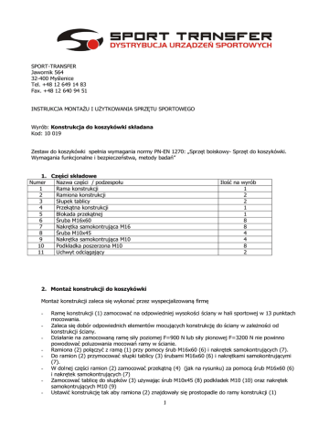 SPORT-TRANSFER Jawornik 564 32-400 Myślenice Tel. +48 12 649 14 83 Fax. +48 12 640 94 51 INSTRUKCJA MONTAŻU I UŻYTKOWANIA SPRZĘTU SPORTOWEGO Wyrób: Konstrukcja do koszykówki składana Kod: 10 019 Zestaw do koszykówki spełnia wymagania normy PN-EN 1270: „Sprzęt boiskowy- Sprzęt do koszykówki. Wymagania funkcjonalne i bezpieczeństwa, metody badań” 1. Części składowe Numer Nazwa części / podzespołu 1 Rama konstrukcji 2 Ramiona konstrukcji 3 Słupek tablicy 4 Przekątna konstrukcji 5 Blokada przekątnej 6 Śruba M16x60 7 Nakrętka samokontrująca M16 8 Śruba M10x45 9 Nakrętka samokontrująca M10 10 Podkładka poszerzona M10 11 Uchwyt odciągający Ilość na wyrób 1 2 2 1 1 8 8 4 4 8 2 2. Montaż konstrukcji do koszykówki Montaż konstrukcji zaleca się wykonać przez wyspecjalizowaną firmę - Ramę konstrukcji (1) zamocować na odpowiedniej wysokości ściany w hali sportowej w 13 punktach mocowania. Zaleca się dobór odpowiednich elementów mocujących konstrukcję do ściany w zależności od konstrukcji ściany. Działanie na zamocowaną ramę siły poziomej F=900 N lub siły pionowej F=3200 N nie powinno powodować poluzowania mocowań ramy w ścianie. Ramiona (2) połączyć z ramą (1) przy pomocy śrub M16x60 (6) i nakrętek samokontrujących (7). Do ramion (2) przymocować słupki tablicy (3) śrubami M16x60 (6) i nakrętkami samokontrującymi (7). W dolnej części ramion (2) zamocować przekątną (4) (jak na rysunku) za pomocą śrub M16x60 (6) i nakrętek samokontrujących (7) Zamocować tablicę do słupków (3) używając śrub M10x45 (8) podkładek M10 (10) oraz nakrętek samokontrujących M10 (9) Ustawić konstrukcję tak aby ramiona (2) znajdowały się prostopadle do ramy konstrukcji (1) 1 - W przekątnej (4) w miejscu blokady (5) wykonać otwór fi 10mm pod blokadę przekątnej, taką samą czynność powtórzyć po złożeniu konstrukcji na ścianę. Założyć blokadę przekątnej (5) 3. Składanie i rozkładanie konstrukcji - Założyć pierwszy uchwyt odciągający (11) na oko blokady przekątnej (5) i odblokować mechanizm Drugi uchwyt odciągający założyć na oko ramienia konstrukcji (12) i ruchem jednostajnym składać konstrukcję w stronę ściany. W identyczny sposób postępować przy rozkładaniu konstrukcji. 2 Uwaga: Nie składać i rozkładać konstrukcji ciągnąć za oko blokady (5) 4. Użytkowanie zestawu a) Konstrukcja przeznaczona jest wyłącznie do gry w koszykówkę i nie może być używana do innych celów b) Przed rozpoczęciem użytkowania i okresowo (max. co 3 m-ce) należy sprawdzić mocowania wszystkich poszczególnych elementów. UWAGA: Nie wolno wspinać się i wieszać na żadnych elementach konstrukcji. 3