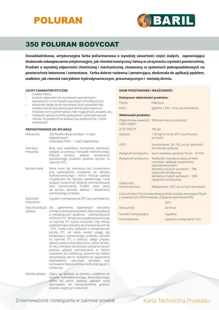 POLURAN 350 POLURAN BODYCOAT Dwuskładnikowa, antykorozyjna farba poliuretanowa o wysokiej zawartości części stałych, zapewniająca doskonałe zabezpieczenie antykorozyjne, jak również estetyczną i łatwą w utrzymaniu czystości powierzchnię. Produkt o wysokiej odporności chemicznej i mechanicznej, stosowany w systemach jednopowłokowych na powierzchnie betonowe i cementowe. Farba dobrze rozlewna i penetrująca, doskonała do aplikacji pędzlem, wałkiem, jak równieżnatryskiem hydrodynamicznym, pneumatycznym i metodą Airmix. CECHY CHARAKTERYSTYCZNE • trwałość koloru; • produkt odpowiedni do wymalowań wewnętrznych i zewnętrznych w normalnych warunkach atmosferycznych; • doskonale nadaje się do wymalowań ścian, posadzek oraz wszelkich konstrukcji betonowych (konstrukcje wsporcze, mostowe, kominy przemysłowe, hale magazynowe, posadzki, itp.) • możliwość aplikacji na farby epoksydowe i poliuretanowe jak również na powierzchnie stalowe oraz powierzchnie z metali nieżelaznych. DANE PODSTAWOWE I WŁAŚCIWOŚCI PRZYGOTOWANIE DO APLIKACJI ZLZO (VOC)*: 460 g/l Mieszanina: 350 PoluRan Bodycoat Baza - 4 części objętościowych Utwardzacz 903V - 1 część objętościowa Gęstość: 1,30 kg/l w temp 20°C (wymieszany produkt) Instrukcja mieszania: Bazę oraz utwardzacz intensywnie wymieszać, najlepiej za pomocą mieszadła mechanicznego. Podczas procesu aplikacji temperatura wymieszanego produktu powinna wynosić co najmniej 10°C. GPS*: Standardowo: 50-100 μm (w zależności od metody aplikacji) Wydajność teoretyczna: Sucha warstwa o grubości 50 μm - 10 m²/l Rozcieńczanie: Farba może być stosowana bez rozcieńczania przy wykorzystaniu urządzenia do natrysku hydrodynamicznego i Airmix. Podczas aplikacji urządzeniami do natrysku powietrznego może wystąpić konieczność dodania rekomendowanej ilości rozcieńczalnika PU5801, która zależy od sprzętu, sposobu aplikacji i temperatury wymieszanego produktu. Żywotność mieszaniny: 5 godzin w temperaturze 20°C (po wymieszaniu). Połysk: Półpołysk Kolor: Zgodnie z RAL i inne na zamówienie. Właściwości produktu: Objętościowa zawartość 50% (wymieszany produkt) części stałych: Wydajność praktyczna: Wydajność w praktyce zależy od wielu czynników. Aplikacja urządzeniami hydrodynamicznymi: elementy o dużych wymiarach - 70% wydajności teoretycznej, elementy o małych wymiarach - 50% wydajności teoretycznej. Odporność Maksymalnie 120°C (w suchych warunkach) temperaturowa: Czas schnięcia: Przy standardowej grubości warstwy wynoszącej 50 μm z utwardzaczem 903V (metoda: urządzenie pomiarowe BYK) 20°C Warunki podczas Dla zapewnienia optymalnych warunków aplikacji: schnięcia i utwardzania powłoki, zaleca się aplikację w temperaturach dodatnich - rekomendowane minimum 5°C. Temperatura podłoża powinna być co najmniej 3°C wyższa od punktu rosy. Wersja szybkoschnąca utwardza się w temperaturach do –10°C. Farbę mona aplikować w temperaturach poniżej 0°C, ale należy zwrócić uwagę, aby temperatura wymieszanego produktu wynosiła co najmniej 5°C a podczas całego procesu aplikacji powierzchnia była sucha i wolna od lodu. W celu uniknięcia koncentracji substancji lotnych podczas aplikacji pomieszczenie, w którym stosowana jest substancja, powinno być dobrze wentylowane. Jest to niezbędne do zapewnienia odpowiednich warunków schnięcia oraz zachowania bezpieczeństwa osób pracujących z substancją. Metody aplikacji: Estetyczne właściwości produktu: Pyłosuchość: 20 minut Suchość manipulacyjna: 4 godziny Przemalowanie: 4 godziny, maksymalnie 7 dni tytr Zaleca się aplikację za pomocą urządzenia do natrysku hydrodynamicznego, pneumatycznego, airless lub airmix. Aplikacja pędzlem może doprowadzić do nierównomiernej grubości powłoki i pogorszyć rozlewność. Zrównoważone rozwiązania w zakresie powłok Karta Techniczna Produktu POLURAN 350 POLURAN BODYCOAT ZALECENIA APLIKACYJNE Rozcieńczalnik: Zalecana ilość: Rozmiar dyszy: Ciśnienie robocze: GPS*: Natrysk hydrodynamiczny PU5801 15% obj. min. 0,019 cala min. 120 bar 50-100 µm ŚRODOWISKO NATURALNE I ZDROWIE Metoda airmix PU5801 15% obj. min. 0,019 cala min. 80 bar 50-100 µm Pędzel/wałek Rozcieńczalnik: Zalecana ilość: Rozmiar dyszy: Ciśnienie robocze: GPS*: S5102 5% obj. 50 µm Czyszczenie narzędzi: Niezwłocznie po aplikacji z wykorzystaniem rozcieńczalnika PU5801. OPAKOWANIE I PRZECHOWYWANIE Opakowania: 20-litrowe puszki i 200-litrowe beczki. Rozcieńczalnik: 25-litrowe puszki i 200-litrowe beczki Okres 12 miesięcy w oryginalnym szczelnie przechowywania: zamkniętym opakowaniu w temperaturze od 5°C do 40°C. Oznakowanie: Zgodnie z wytycznymi dyrektywy UE 67/548/WE dotyczącej materiałów niebezpiecznych. Substancja niebezpieczna i podrażniająca w przypadku kontaktu ze skórą, oczami oraz podczas wdychania. W przypadku kontaktu substancji z oczami należy natychmiast przemyć je dużą ilością wody oraz skontaktować się z lekarzem. Nie należy spożywać pokarmów, napojów ani palić tytoniu w miejscu aplikacji ani podczas aplikacji substancji. UN: Kod Aware: 1263 43-IV KODOWANIE AWARE Kod AWARE (Adequate Warning and Air Requirement – wymagania dotyczące odpowiedniego ostrzeżenia i zapewnienia jakości powietrza) to system kodowania produktów zawierających lotne związki organiczne (LZO) stanowiący narzędzie wsparcia producentów wspomagające ocenę ryzyka i innowacyjności produktu. System ten dodatkowo może być wykorzystywany do informowania użytkowników końcowych o potencjalnie możliwym ryzyku zagrożenia zdrowia wynikającym z użytkowania produktu. System został opracowany na podstawie norweskiego systemu OAR (Occupational Air Requirement – wymagania dotyczące jakości powietrza w miejscu pracy) oraz duńskiego systemu kodowania MAL. Kod AWARE składa się z dwóch cyfr oddzielonych kreską. Obie cyfry odnoszą się do fizyko-chemicznych uwarun