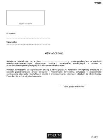 WZÓR pieczęć kancelarii Pracownik: ............................................................ Stanowisko: ............................................................ OŚWIADCZENIE Niniejszym oświadczam, Ŝe w dniu ………………………………………….. r. uczestniczyłam/-em w szkoleniu wewnętrznym/zewnętrznym* dotyczącym realizacji obowiązków wynikających z ustawy o przeciwdziałaniu praniu pieniędzy oraz finansowaniu terroryzmu. Ponadto oświadczam, Ŝe zapoznałam/-em się z obowiązującą w Kancelarii wewnętrzną procedurą w zakresie przeciwdziałania praniu pieniędzy i finansowaniu terroryzmu, dotyczącą w szczególności realizowania obowiązku identyfikacji klienta i przechowywania informacji objętych tą identyfikacją. Procedurę tę przyjmuję do stosowania. .......................................... data, podpis Pracownika 01/2011