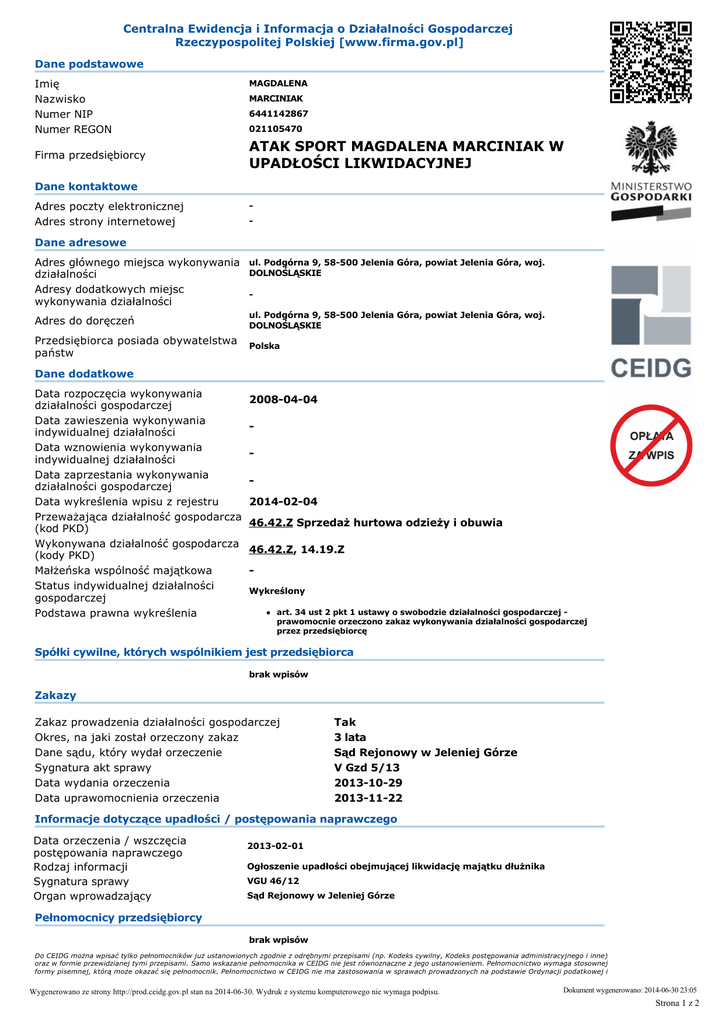 Centralna Ewidencja i Informacja o Działalności Gospodarczej Rzeczypospolitej Polskiej [www.firma.gov.pl] Dane podstawowe Imię Nazwisko Numer NIP Numer REGON Firma przedsiębiorcy MAGDALENA MARCINIAK 6441142867 021105470 ATAK SPORT MAGDALENA MARCINIAK W UPADŁOŚCI LIKWIDACYJNEJ Dane kontaktowe Adres poczty elektronicznej Adres strony internetowej Dane adresowe Adres głównego miejsca wykonywania ul. Podgórna 9, 58500 Jelenia Góra, powiat Jelenia Góra, woj. DOLNOŚLĄSKIE działalności Adresy dodatkowych miejsc wykonywania działalności Adres do doręczeń ul. Podgórna 9, 58500 Jelenia Góra, powiat Jelenia Góra, woj. DOLNOŚLĄSKIE Przedsiębiorca posiada obywatelstwa państw Polska Dane dodatkowe Data rozpoczęcia wykonywania działalności gospodarczej Data zawieszenia wykonywania indywidualnej działalności Data wznowienia wykonywania indywidualnej działalności Data zaprzestania wykonywania działalności gospodarczej Data wykreślenia wpisu z rejestru Przeważająca działalność gospodarcza (kod PKD) Wykonywana działalność gospodarcza (kody PKD) Małżeńska wspólność majątkowa Status indywidualnej działalności gospodarczej Podstawa prawna wykreślenia 20080404 20140204 46.42.Z Sprzedaż hurtowa odzieży i obuwia 46.42.Z, 14.19.Z Wykreślony art. 34 ust 2 pkt 1 ustawy o swobodzie działalności gospodarczej prawomocnie orzeczono zakaz wykonywania działalności gospodarczej przez przedsiębiorcę Spółki cywilne, których wspólnikiem jest przedsiębiorca brak wpisów Zakazy Zakaz prowadzenia działalności gospodarczej Okres, na jaki został orzeczony zakaz Dane sądu, który wydał orzeczenie Sygnatura akt sprawy Data wydania orzeczenia Data uprawomocnienia orzeczenia Tak 3 lata Sąd Rejonowy w Jeleniej Górze V Gzd 5/13 20131029 20131122 Informacje dotyczące upadłości / postępowania naprawczego Data orzeczenia / wszczęcia postępowania naprawczego Rodzaj informacji Sygnatura sprawy Organ wprowadzający 20130201 Ogłoszenie upadłości obejmującej likwidację majątku dłużnika VGU 46/12 Sąd Rejonowy w Jeleniej Górze Pełnomocnicy przedsiębiorcy brak wpisów Do CEIDG można wpisać tylko pełnomocników już ustanowionych zgodnie z odrębnymi przepisami (np. Kodeks cywilny, Kodeks postępowania administracyjnego i inne) oraz w formie przewidzianej tymi przepisami. Samo wskazanie pełnomocnika w CEIDG nie jest równoznaczne z jego ustanowieniem. Pełnomocnictwo wymaga stosownej formy pisemnej, którą może okazać się pełnomocnik. Pełnomocnictwo w CEIDG nie ma zastosowania w sprawach prowadzonych na podstawie Ordynacji podatkowej i ustawy o kontroli skarbowej. Wygenerowano ze strony http://prod.ceidg.gov.pl stan na 20140630. Wydruk z systemu komputerowego nie wymaga podpisu. W celu sprawdzenia aktualnego stanu wpisu należy odszukać wpis w systemie CEIDG (www.firma.gov.pl) WPIS DO CEIDG JEST WOLNY OD OPŁAT Dokument wygenerowano: 20140630 23:05 Strona 1 z 2 Zgodnie z art. 33 ustawy o swobodzie działalności gospodarczej Domniemywa się, że dane wpisane do CEIDG są prawdziwe. Jeżeli do CEIDG wpisano dane niezgodnie z wnioskiem lub bez tego wniosku, osoba wpisana do CEIDG nie może zasłaniać się wobec osoby trzeciej, działającej w dobrej wierze, zarzutem, że dane te nie są oraz w formie przewidzianej tymi przepisami. Samo wskazanie pełnomocnika w CEIDG nie jest równoznaczne z jego ustanowieniem. Pełnomocnictwo wymaga stosownej formy pisemnej, którą może okazać się pełnomocnik. Pełnomocnictwo w CEIDG nie ma zastosowania w sprawach prowadzonych na podstawie Ordynacji podatkowej i ustawy o kontroli skarbowej. W celu sprawdzenia aktualnego stanu wpisu należy odszukać wpis w systemie CEIDG (www.firma.gov.pl) WPIS DO CEIDG JEST WOLNY OD OPŁAT Zgodnie z art. 33 ustawy o swobodzie działalności gospodarczej Domniemywa się, że dane wpisane do CEIDG są prawdziwe. Jeżeli do CEIDG wpisano dane niezgodnie z wnioskiem lub bez tego wniosku, osoba wpisana do CEIDG nie może zasłaniać się wobec osoby trzeciej, działającej w dobrej wierze, zarzutem, że dane te nie są prawdziwe, jeżeli po powzięciu informacji o tym wpisie zaniedbała wystąpić niezwłocznie z wnioskiem o sprostowanie, uzupełnienie lub wykreślenie wpisu. Niniejszy wydruk jest zgodny z art. 38 ust. 4 ustawy o swobodzie działalności gospodarczej z dnia 2 lipca 2004 r. i ma moc zaświadczenia o wpisie w Centralnej Ewidencji i Informacji o Działalności Gospodarczej RP. Art. 38 ust. 5 ustawy o swobodzie działalności gospodarczej Organy administracji publicznej nie mogą domagać się od przedsiębiorców okazywania, przekazywania lub załączania do wniosków zaświadczeń o wpisie w CEIDG. Wygenerowano ze strony http://prod.ceidg.gov.pl stan na 20140630. Wydruk z systemu komputerowego nie wymaga podpisu. Dokument wygenerowano: 20140630 23:05 Strona 2 z 2