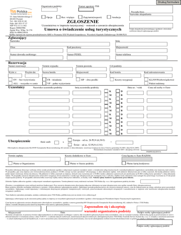 Drukuj formularz Numer agentury TSS Organizator podróŜy: Pieczątka biura Nazwisko ekspedienta Ul. Jana Sokołowskiego 2 Opcja Rez. wiąŜąca Zapytanie(request) Anulacja 60-682 Poznań Tel.: 061 828 81 60 Faks: 061 825 57 37 Uczestnictwa w imprezie turystycznej – wniosek o zawarcie ubezpieczenia NIP 972-11-11-562 Regon 300065906 Zgoda Woj. Wlkp. Nr 378 KRS Nr 0000239018 Spółka wpisana do rejestru przedsiębiorców KRS w Poznaniu XXI Wydział Gospodarczy. Wysokość Kapitału Zakładowego 50.000 PLN ZGŁOSZENIE Umowa o świadczenie usług turystycznych Podpis ekspedienta potwierdzający zgodność z dowodem osobistym danych zgłaszającego podróŜ Zgłaszający Nazwisko Imię Ulica Kod pocztowy Miejscowość Numer dowodu osobistego Numer PESEL Numer telefonu Rezerwacja Numer rezerwacji Termin wyjazdu Termin powrotu Cel podróŜy Wylot z: Nazwa hotelu Miejscowość Kod hotelu Przylot do: OV – bez wyŜywienia FR - śniadania ALL – wszystko w cenie VP – pełne wyŜywienie Uczestnicy HP – dwa posiłki Nazwisko uczestnika podróŜy Ubezpieczenie Ilość osób Kod zakwaterowania Koszty rezygnacji Pakiet rodzinny Imię uczestnika podróŜy Europa – od os. 26 PLN (6,50 €) x KLiNNW(obowiązkowe) Data ur. / wiek K D M B K D M B K D M B K D M B K D M B K D M B Cena od osoby w Euro = Świat – od os. 52 PLN (13 €) Obowiązkowe ubezpieczenie KLiNNW Europaische Reiseversicherung AG zawarto w dniu dokonania rezerwacji wiąŜącej na mocy Umowy generalnej Nr 009 z dnia 02.01.2007r. Potwierdzam otrzymanie warunków ERV i akceptuję ich treść. PODPIS KLIENTA Termin zapłaty Koszty dodatkowe w Euro Płatne u Organizatora Płatne w biurze podróŜy Cena łączna w Euro RAZEM: Płatne kartą kredytowa Wszystkie informacje dotyczące wybranej oferty zostały przekazane zgodnie z załączonym wypisem warunków umów o świadczenie usług turystycznych i warunkach płatności organizatora i pośrednika oraz stanowią część umowy. W przypadku, gdy cena imprezy jest równowartością kwoty podanej w EURO, stosuje się kurs sprzedaŜy* obowiązujący w dniu dokonania zapłaty. Jeśli płatność dokonywana jest w kilku częściach, dla kaŜdej płatności naleŜy podać numer rezerwacji, której ona dotyczy. Dla płatności w kilku częściach za imprezy, których cena wyraŜona jest w EURO, kaŜda z płatności częściowych jest przeliczana na EURO według kursu sprzedaŜy* z dnia dokonania wpłaty. W przypadku zawarcia ubezpieczenia od kosztów rezygnacji, kwota naleŜności z tytułu tego ubezpieczenia jest wymagana wraz z zaliczką. Zapłata reszty naleŜności musi nastąpić bez ponownego wezwania na 35 dni przed rozpoczęciem podróŜy. W przypadku załoŜenia kilku rezerwacji wpłaty naleŜy dokonywać oddzielnie, za kaŜdą z nich. NaleŜne opłaty bankowe są ponoszone przez klienta. Zaliczka/ Opłata całkowita zgodnie z załączonymi warunkami organizatora. Termin płatności reszty naleŜności na konto TSS Polska Sp. z o.o. lub organizatora podróŜy do dnia: (Prosimy o uwzględnienie czasu realizacji przelewu bankowego). Przy zawarciu ubezpieczenia obowiązują załączone informacje na temat ubezpieczenia oraz ogólne warunki firmy ubezpieczeniowej. Biuro podróŜy udzieliło niezbędnej informacji o terminie i formie płatności zgłaszającemu podróŜ. Zgłaszający posiada pełnomocnictwo do zawarcia niniejszej umowy, oraz do dokonywania jej zmian, udzielone przez pozostałych uczestników. Zgłaszający został zapoznany z informacjami dotyczącymi przepisów transportowych, wizowych, przeciwwskazań zdrowotnych związanych z uczestnictwem w imprezie oraz moŜliwości ubezpieczenia kosztów rezygnacji z podróŜy. *kurs bankowy sprzedaŜy pieniądza, ustalany codziennie przez TSS Polska, publikowany jest na stronie www.onlineweg.pl Zgłaszający zobowiązuje się do uiszczenia pełnej opłaty za imprezę za wszystkich zgłoszonych uczestników zgodnie z obowiązującymi Warunkami Imprez Turystycznych organizatora. Cena łączna na zgłoszeniu zawiera ubezpieczenie obowiązkowe uczestników, zgodnie z umową generalną 009 Ubezpieczyciela Europaische Reiseversicherung AG, oddział w Polsce i TSS Polska. Zakres i warunki ubezpieczyciela stanowią integralną część umowy zgłoszenia podróŜy. Miejscowość Data Zapoznałem się i akceptuję warunki organizatora podróży Podpis osoby zgłaszającej podróŜ Wyraźnie oświadczam, Ŝe ponoszę równieŜ odpowiedzialność za zobowiązania wynikające z umowy dla wszystkich zgłoszonych przez mnie uczestników, oraz Ŝe wyraŜam wyraźną i dobrowolną zgodę na przetwarzanie (w tym w zbiorach danych) w rozumieniu ustawy z dnia 19.08.97 r. o ochronie danych osobowych, moich/naszych danych osobowych, udostępnionych przez TSS Polska Touristik Service System Sp. z o.o. w związku z zawartymi umowami – w celach marketingowych lub handlowych, w tym w przyszłości przy niezmienionym celu przetwarzania, oraz na ich udostępnianie osobom trzecim lub przekazywanie za granicę w celach, w których zostały zebrane. Podpis osoby zgłaszającej podróŜ Umowa generalna numer 009 z dnia 02.01.2007 r. 1. TSS Polska zawarło na rzecz swoich Klientów Umowę Generalną Ubezpieczenia nr 009 z dnia 2 stycznia 2007 r. , z Europäische Reiseversicherung AG Oddział w Polsce na podstawie Warunków Ubezpieczenia PodróŜy Europaische Reiseversicherung AG Oddział w Polsce (2007) o symbolu 10.10.003, potwierdzoną polisą nr 1000056. Ponizsza umowa generalna jest integralna czescia umowy zgloszenia podrózy zagranicznej wykupionej w TSS Polska. Zakres ubezpieczenia obejmuje: • Koszty leczenia, transportu i repatriacji z sumą ubezpieczenia 10 000 EUR • Następstwa nieszczęśliwych wypadków z sumą ubezpieczenia 10 000 PLN w przypadku trwałego uszczerbku na zdrowiu oraz 5 000 PLN w przypadku śmierci ubezpieczonego. Potwierdzam otrzymanie Warunków Ubezpieczenia PodróŜy Europaische Reiseversicherung AG Oddział w Polsce (2007) 