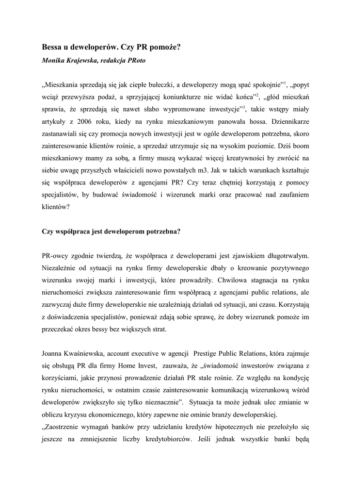 Bessa u deweloperów. Czy PR pomoŜe? Monika Krajewska, redakcja PRoto „Mieszkania sprzedają się jak ciepłe bułeczki, a deweloperzy mogą spać spokojnie” 1, „popyt wciąŜ przewyŜsza podaŜ, a sprzyjającej koniunkturze nie widać końca”2, „głód mieszkań sprawia, Ŝe sprzedają się nawet słabo wypromowane inwestycje” 3, takie wstępy miały artykuły z 2006 roku, kiedy na rynku mieszkaniowym panowała hossa. Dziennikarze zastanawiali się czy promocja nowych inwestycji jest w ogóle deweloperom potrzebna, skoro zainteresowanie klientów rośnie, a sprzedaŜ utrzymuje się na wysokim poziomie. Dziś boom mieszkaniowy mamy za sobą, a firmy muszą wykazać więcej kreatywności by zwrócić na siebie uwagę przyszłych właścicieli nowo powstałych m3. Jak w takich warunkach kształtuje się współpraca deweloperów z agencjami PR? Czy teraz chętniej korzystają z pomocy specjalistów, by budować świadomość i wizerunek marki oraz pracować nad zaufaniem klientów? Czy współpraca jest deweloperom potrzebna? PR-owcy zgodnie twierdzą, Ŝe współpraca z deweloperami jest zjawiskiem długotrwałym. NiezaleŜnie od sytuacji na rynku firmy deweloperskie dbały o kreowanie pozytywnego wizerunku swojej marki i inwestycji, które prowadziły. Chwilowa stagnacja na rynku nieruchomości zwiększa zainteresowanie firm współpracą z agencjami public relations, ale zazwyczaj duŜe firmy deweloperskie nie uzaleŜniają działań od sytuacji, ani czasu. Korzystają z doświadczenia specjalistów, poniewaŜ zdają sobie sprawę, Ŝe dobry wizerunek pomoŜe im przeczekać okres bessy bez większych strat. Joanna Kwaśniewska, account executive w agencji Prestige Public Relations, która zajmuje się obsługą PR dla firmy Home Invest, zauwaŜa, Ŝe „świadomość inwestorów związana z korzyściami, jakie przynosi prowadzenie działań PR stale rośnie. Ze względu na kondycję rynku nieruchomości, w ostatnim czasie zainteresowanie komunikacją wizerunkową wśród deweloperów zwiększyło się tylko nieznacznie”. Sytuacja ta moŜe jednak ulec zmianie w obliczu kryzysu ekonomicznego, który zapewne nie ominie branŜy deweloperskiej. „Zaostrzenie wymagań banków przy udzielaniu kredytów hipotecznych nie przełoŜyło się jeszcze na zmniejszenie liczby kredytobiorców. Jeśli jednak wszystkie banki będą rzeczywiście Ŝądały od kredytobiorców min. 20 proc. wkładu własnego i utrzymywały marŜę na tak wysokim poziomie, to części osób nie będzie stać na zaciągnięcie kredytu. Wtedy spadnie popyt i firmy deweloperskie będą szukały dodatkowego wsparcia w agencjach PR” – podkreśla Kwaśniewska. Czynnikiem mobilizującym do podjęcia współpracy jest zazwyczaj konkurencja i chęć budowy wiarygodności, a takŜe zaufania klientów do dewelopera. Na polskim rynku pojawia się coraz więcej firm deweloperskich, które prezentują szerokie i bardzo przystępne oferty. Zmusza to innych do podjęcia działań wizerunkowych, które pomogą wypracować pozycję firmy jako eksperta w branŜy. Jak wygląda współpraca? Wymiar i intensywność współpracy pomiędzy agencjami PR i deweloperami są róŜne i zaleŜą zazwyczaj od dewelopera. Część agencji stale współpracuje z działami marketingowymi swoich klientów i razem opracowują strategię, która potem ma być wspólnie zrealizowana i wpłynąć na pozycję oraz wizerunek dewelopera w branŜy. Podział obowiązków zaleŜy wtedy od klienta i od tego, jak duŜy wpływ chce mieć bezpośrednio na proces kreowania swojego image’u. Inne agencje mają pełną swobodę w zakresie sposobu prowadzenia działań, które zazwyczaj zamykają się w obrębie PR-u korporacyjnego, relacji z mediami, czy pracy nad zwiększeniem rozpoznawalności danych inwestycji. Matylda Dudek, media director w Highlite PR, opisuje, Ŝe w jej agencji w niektórych przypadkach specjaliści tworzą taką strategię od podstaw, począwszy od nazwy projektu. „W większości wypadków stanowimy ogniwo doradcze, staramy się na bieŜąco odnajdywać moŜliwość »wpasowania« naszego klienta w odpowiednią sytuację i wydarzenie, które sami bardzo często kreujemy”. Agencje zajmują się obsługą PR zarówno wszystkich działań dewelopera, jak i poszczególnych inwestycji. Zdarza się, Ŝe klient, zadowolony z prowadzonych prac nad konkretnym projektem, rozszerza umowę takŜe o wsparcie jego innych inwestycji. Bardzo istotna jest teŜ pomoc agencji w trakcie kryzysów, na które deweloperzy są naraŜeni częściej niŜ przedstawiciele innych branŜ. Oczekiwania społeczne w stosunku do marek na rynku nieruchomości są bardzo wysokie. Zakup mieszkania wiąŜe się z licznymi emocjami, jest to zazwyczaj wieloletnia inwestycja, pochłaniająca ogromne sumy pieniędzy, a często oszczędności całego Ŝycia. Dlatego potencjalni klienci są bardzo wyczuleni na kaŜde potknięcie dewelopera, a swój wybór uzaleŜniają od zaufania i pozycji marki, którą on reprezentuje. W obliczu kryzysu pomoc specjalistów ds. PR staje się nieodzowna, poniewaŜ szybka i sprawna reakcja na problem często zapobiega odpływowi licznej grupy klientów, a czasem nawet zupełnemu bankructwu firmy. Czy hossa dla PR-oców potrwa nadal? Tak więc romans deweloperów ze specjalistami ds. wizerunku trwa od początku mieszkaniowej koniunktury i niezaleŜnie od sytuacji na rynku prawdopodobnie będzie trwał nadal. Agencjom potrzebni są klienci z tego sektora branŜy nieruchomości, a deweloperom PR-owcy, którzy pomogą im zbudować silną markę, zdobyć zaufanie klientów, a w przypadku kryzysu wykorzystać zdobyte doświadczenie, by zminimalizować jego skutki. Kryzys ekonomiczny, który moŜe dotknąć deweloperów, będzie zapewne stymulował ich do zasięgania porad specjalistów ds. wizerunku, a na pewno przyczyni się do zintensyfikowania podjętych działań, by trudno dostępne kredyty nie zaszkodziły ich wspólnym interesom. Moni