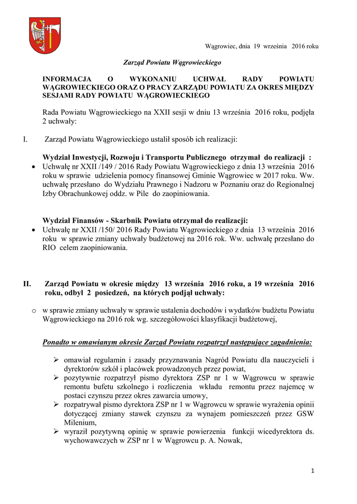 Wągrowiec, dnia 19 września 2016 roku Zarząd Powiatu Wągrowieckiego INFORMACJA O WYKONANIU UCHWAŁ RADY POWIATU WĄGROWIECKIEGO ORAZ O PRACY ZARZĄDU POWIATU ZA OKRES MIĘDZY SESJAMI RADY POWIATU WĄGROWIECKIEGO Rada Powiatu Wągrowieckiego na XXII sesji w dniu 13 września 2016 roku, podjęła 2 uchwały: I. Zarząd Powiatu Wągrowieckiego ustalił sposób ich realizacji: Wydział Inwestycji, Rozwoju i Transportu Publicznego otrzymał do realizacji : Uchwałę nr XXII /149 / 2016 Rady Powiatu Wągrowieckiego z dnia 13 września 2016 roku w sprawie udzielenia pomocy finansowej Gminie Wągrowiec w 2017 roku. Ww. uchwałę przesłano do Wydziału Prawnego i Nadzoru w Poznaniu oraz do Regionalnej Izby Obrachunkowej oddz. w Pile do zaopiniowania. Wydział Finansów - Skarbnik Powiatu otrzymał do realizacji: Uchwałę nr XXII /150/ 2016 Rady Powiatu Wągrowieckiego z dnia 13 września 2016 roku w sprawie zmiany uchwały budżetowej na 2016 rok. Ww. uchwałę przesłano do RIO celem zaopiniowania. II. Zarząd Powiatu w okresie między 13 września 2016 roku, a 19 września 2016 roku, odbył 2 posiedzeń, na których podjął uchwały: o w sprawie zmiany uchwały w sprawie ustalenia dochodów i wydatków budżetu Powiatu Wągrowieckiego na 2016 rok wg. szczegółowości klasyfikacji budżetowej, Ponadto w omawianym okresie Zarząd Powiatu rozpatrzył następujące zagadnienia: omawiał regulamin i zasady przyznawania Nagród Powiatu dla nauczycieli i dyrektorów szkół i placówek prowadzonych przez powiat, pozytywnie rozpatrzył pismo dyrektora ZSP nr 1 w Wągrowcu w sprawie remontu bufetu szkolnego i rozliczenia wkładu remontu przez najemcę w postaci czynszu przez okres zawarcia umowy, rozpatrywał pismo dyrektora ZSP nr 1 w Wągrowcu w sprawie wyrażenia opinii dotyczącej zmiany stawek czynszu za wynajem pomieszczeń przez GSW Milenium, wyraził pozytywną opinię w sprawie powierzenia funkcji wicedyrektora ds. wychowawczych w ZSP nr 1 w Wągrowcu p. A. Nowak, 1 zapoznał się z informacją o organizacji roku szkolnego w ZSP nr 1 w Wągrowcu oraz z informacją w sprawie przydziału godzin dla kadry kierowniczej, zapoznał się z informacją na temat urlopów dla poratowania zdrowia oraz zasadami jego udzielania i odwoływania z urlopu, pozytywnie rozpatrzył wnioski dyrektorów ZSP nr 1, ZSP nr 2 i SOSW w Wągrowcu, wyrażając zgodę na nauczanie indywidualne, które będą prowadzone w domu dla uczniów tych szkół, w wymiarze 12 godzin tygodniowo, omawiał wytyczne do opracowania projektu budżetu Powiatu Wągrowieckiego i Wieloletniej Prognozy Finansowej na 2017 rok, pozytywnie zaopiniował materiały na XXIII sesję Rady Powiatu Wągrowieckiego. Zebrała M. Substyk inspektor w Biurze Rady. 2