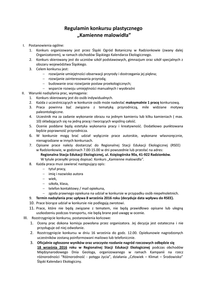 Regulamin konkursu plastycznego „Kamienne malowidła” I. Postanowienia ogólne: 1. Konkurs organizowany jest przez Śląski Ogród Botaniczny w Radzionkowie (zwany dalej Organizatorem), w ramach obchodów Śląskiego Kalendarza Ekologicznego. 2. Konkurs skierowany jest do uczniów szkół podstawowych, gimnazjum oraz szkół specjalnych z obszaru województwa Śląskiego. 3. Celem konkursu jest: rozwijanie umiejętności obserwacji przyrody i dostrzegania jej piękna; rozwijanie zainteresowania przyrodą; budowanie oraz rozwijanie postaw proekologicznych; wsparcie rozwoju umiejętności manualnych i wyobraźni II. Warunki nadsyłania prac, wymagania: 1. Konkurs skierowany jest do osób indywidualnych. 2. Każda z uczestniczących w konkursie osób może nadesłać maksymalnie 1 pracę konkursową. 3. Praca powinna być związana z tematyką przyrodniczą, mile widziane motywy paleontologiczne. 4. Uczestnik ma za zadanie wykonanie obrazu na jednym kamieniu lub kilku kamieniach ( max. 10) składających się na jedną pracę i tworzących wspólną całość. 5. Ocenie poddane będą estetyka wykonania pracy i kreatywność. Dodatkowo punktowana będzie poprawność przyrodnicza. 6. W konkursie mogą brać udział wyłącznie prace autorskie, wykonane własnoręcznie, nienagradzane w innych konkursach. 7. Opisane prace należy dostarczyć do Regionalnej Stacji Edukacji Ekologicznej (RSEE) w Radzionkowie, w godzinach 7.00-15.00 w dni powszednie lub przesłać na adres: Regionalna Stacja Edukacji Ekologicznej, ul. Księżogórska 90a, 41-922 Radzionków. W tytule przesyłki proszę dopisać: Konkurs „Kamienne malowidła”. 8. Każda praca musi zawierać następujący opis: tytuł pracy, imię i nazwisko autora wiek, szkoła, klasa, telefon kontaktowy / mail opiekuna, zgoda prawnego opiekuna na udział w konkursie w przypadku osób niepełnoletnich. 9. Termin nadsyłania prac upływa 8 września 2016 roku (decyduje data wpływu do RSEE). 10. Prace biorące udział w konkursie nie podlegają zwrotowi. 11. Prace, które nie będą związane z tematem, nie będą prawidłowo opisane lub ulegną uszkodzeniu podczas transportu, nie będą brane pod uwagę w ocenie. III. Rozstrzygnięcie konkursu, postanowienia końcowe: 1. Oceny prac dokona komisja powołana przez organizatora. Jej decyzja jest ostateczna i nie przysługuje od niej odwołanie. 2. Rozstrzygnięcie konkursu w dniu 16 września do godz. 12.00. Opiekunowie nagrodzonych uczestników zostaną poinformowani mailowo lub telefonicznie. 3. Oficjalnie ogłoszone wyników oraz uroczyste rozdanie nagród rzeczowych odbędzie się 18 września 2016 roku w Regionalnej Stacji Edukacji Ekologicznej podczas obchodów Międzynarodowego Dnia Geologa, organizowanego w ramach Kampanii na rzecz różnorodności “Różnorodność - potęga życia”, działania „Człowiek – Klimat – Środowisko” Śląski Kalendarz Ekologiczny. 4. W razie nieobecności na rozdaniu nagród, uczestnik będzie miał możliwość późniejszego odbioru przyznanej nagrody w Regionalnej Stacji Edukacji Ekologicznej w Radzionkowie, po wcześniejszym kontakcie z koordynatorem konkursu, ale nie później niż do 30.09.2016r. Nie jest planowana inna forma przesyłania nagród do uczestników. 5. Spośród wszystkich nadesłanych prac wybrane zostaną po 3 prace, w trzech kategoriach : - szkoła podstawowa - gimnazjum - szkoła specjalna 6. Prace konkursowe będą prezentowane podczas obchodów Międzynarodowego Dnia Geologa w dniu 18 września. 7. Uczestnik przystępując do konkursu, wyraża zgodę na wielokrotne i nieodpłatne publikowanie nadesłanych prac oraz opublikowanie swojego imienia i nazwiska oraz miejscowości zamieszkania. 8. Dodatkowe informacje można uzyskać u koordynatora konkursu mail: [email protected] , tel. 534 994 577 .