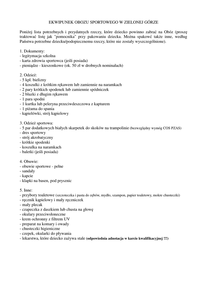 EKWIPUNEK OBOZU SPORTOWEGO W ZIELONEJ GÓRZE Poniżej lista potrzebnych i przydatnych rzeczy, które dziecko powinno zabrać na Obóz (proszę traktować listę jak "pomocnika" przy pakowaniu dziecka. Można spakowć także inne, według Państwa potrzebne dziecku/podopiecznemu rzeczy, które nie zostały wyszczególnione). 1. Dokumenty: - legitymacja szkolna - karta zdrowia sportowca (jeśli posiada) - pieniądze - kieszonkowe (ok. 50 zł w drobnych nominałach) 2. Odzież: - 5 kpl. bielizny - 4 koszulki z krótkim rękawem lub zamiennie na naramkach - 2 pary krótkich spodenek lub zamiennie spódniczek - 2 bluzki z długim rękawem - 1 para spodni - 1 kurtka lub peleryna przeciwdeszczowa z kapturem - 1 piżama do spania - kąpielówki, strój kąpielowy 3. Odzież sportowa: - 5 par dodatkowych białych skarpetek do skoków na trampolinie (bezwzględny wymóg COS PZAS) - dres sportowy - strój akrobatyczny - krótkie spodenki - koszulka na naramkach - baletki (jeśli posiada) 4. Obuwie: - obuwie sportowe - pełne - sandały - kapcie - klapki na basen, pod prysznic 5. Inne: - przybory toaletowe (szczoteczka i pasta do zębów, mydło, szampon, papier toaletowy, mokre chusteczki) - ręcznik kąpielowy i mały ręczniczek - mały plecak - czapeczka z daszkiem lub chusta na głowę - okulary przeciwsłoneczne - krem ochronny z filtrem UV - preparat na komary i owady - chusteczki higieniczne - czepek, okularki do pływania - lekarstwa, które dziecko zażywa stale (odpowiednia adnotacja w karcie kwalifikacyjnej !!!)