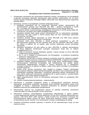 BDG.V.2510.35.2015.TKa Ministerstwo Infrastruktury i Rozwoju Załącznik nr 1 do SIWZ Szczegółowy Opis Przedmiotu Zamówienia 1. Przedmiotem zamówienia jest opracowanie ekspertyzy prawnej „Kompetencje Unii Europejskiej w zakresie koordynacji stanowisk zajmowanych przez państwa członkowskie UE na forum Komisji Ochrony Środowiska Morskiego Bałtyku (HELCOM) oraz Międzynarodowej Organizacji Morskiej (IMO)”. 2. Ekspertyza powinna w szczególności zawierać następujące analizy: 1) określenie kompetencji UE do koordynacji stanowisk państw członkowskich UE prezentowanych podczas prac HELCOM oraz IMO – zarówno koordynacji w formie tzw. non-paper, jak i ustanawiania wspólnego stanowiska w formie decyzji Rady UE, 2) wskazanie zakresu przedmiotowego podlegającego koordynacji w formie decyzji Rady UE, w formie tzw. non-paper oraz materii nieobjętej koordynacją, 3) określenie skutków braku zgody państw członkowskich UE na ustanowienie wspólnego stanowiska (lub jego części) w formie decyzji Rady UE oraz koordynacje stanowiska w formie tzw. non-paper, 4) określenie skutków zajęcia stanowiska na forum HELCOM oraz IMO przez państwo członkowskie w zakresie wyłączonym z koordynacji, 5) wykazanie różnic jakie zachodzą w dwóch podanych przypadkach, tj. gdy UE jako organizacja regionalna nie jest członkiem IMO, ale jest członkiem HELCOM i wpływ tej różnicy w statusie UE na zasady, jakie powinny obejmować proces koordynacji stanowiska, 6) określenie kompetencji UE jako jednej ze stron HELCOM w zakresie wprowadzenia na Morzu Bałtyckim zaostrzonych wymogów dotyczących emisji NO x ze statków z uwzględnieniem m.in.: a) „Rule of procedure” Komisji Helsińskiej, zgodnie z którym decyzje na forum HELCOM podejmowane są jednogłośnie, b) art. 4 i art. 5 Traktatu o Funkcjonowaniu Unii Europejskiej w kontekście kompetencji dzielonych i nieprzyznanych, c) Dyrektywy 2001/81/WE w sprawie krajowych poziomów emisji dla niektórych rodzajów zanieczyszczenia powietrza, zmienionej dyrektywą 2008/50/WE, w aspekcie emisji NO x, 7) określenie podstaw prawnych/traktatowych, które mogą służyć kwestionowaniu działań koordynacyjnych UE/Komisji Europejskiej, jeśli konsekwencją tych działań będzie ustanowienie niejednakowych wymogów w różnych obszarach UE, tj. ostrzejszych wymogów emisji NOx ze statków na Bałtyku, wobec braku takich wymogów na pozostałych morzach wokół UE, 8) analiza zmian procesu koordynacji, który nastąpił po przyjęciu Traktatu Lizbońskiego oraz prognoza dalszych działań Komisji Europejskiej i jej służb w celu rozszerzenia zakresu ustanawiania wspólnego stanowiska i koordynacji stanowiska państw członkowskich UE poza zakres wyłącznych wykonanych kompetencji UE w oparciu jedynie o „zasadę lojalnej współpracy” oraz „ważne elementy polityki UE”, 9) wpływ prognozowanych zmian na formułowanie stanowiska Polski na posiedzenia IMO i HELCOM, 10) wnioski z przeprowadzonej ekspertyzy – podsumowanie. 3. Wykonawca w przypadku wystąpienia zmiany w obowiązujących przepisach prawnych dotyczących opracowania przedmiotu zamówienia przed terminem zakończenia umowy musi uwzględnić te zmiany i dostosować przedmiot zamówienia do aktualnie obowiązujących przepisów prawnych bez dodatkowego wynagrodzenia. 4. Dokumentacja powinna być przygotowana jedynie na potrzeby przedmiotu zamówienia i żadna jej część nie może pochodzić z innych opracowań. 5. Wykonawca dostarczy zamawiającemu przygotowaną dokumentację w języku polskim, w wersji papierowej jak również na nośniku optycznym CD lub DVD w formacie dokumentów doc (zgodny z MS Word 2007) i PDF (zgodny z Adobe Acrobat 6.0). Dokument w formacie doc po przekopiowaniu będzie możliwy do edycji. Wykonawca dostarczy również wszelkie użyte w dokumentacji rysunki, wykresy i inne opracowania w postaci umożliwiającej ich edycję. 6. Przedmiot zamówienia zostanie wykonany w terminie 45 dni kalendarzowych licząc od dnia zawarcia umowy.