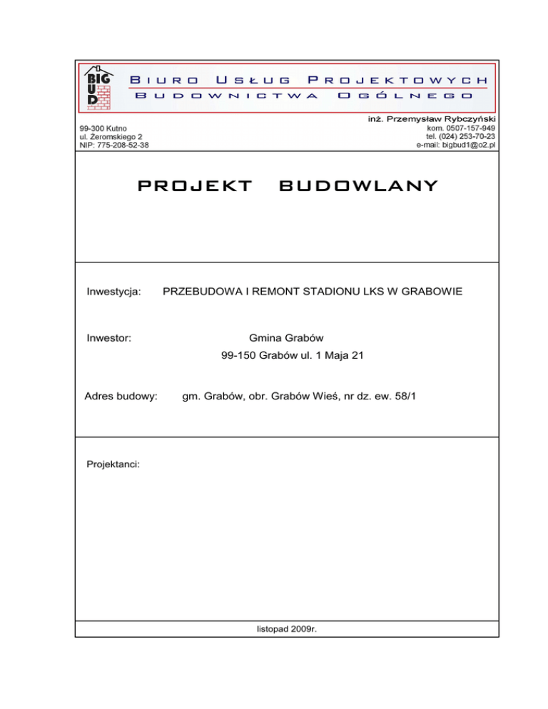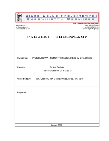 PROJEKT Inwestycja: Inwestor: BUDOWLANY PRZEBUDOWA I REMONT STADIONU LKS W GRABOWIE Gmina Grabów 99-150 Grabów ul. 1 Maja 21 Adres budowy: gm. Grabów, obr. Grabów Wieś, nr dz. ew. 58/1 Projektanci: listopad 2009r. BIURO USŁUG PROJEKTOWYCH BUDOWNICTWA OGÓLNEGO „BIG- BUD” inŜ. P. Rybczyński, Kutno, ul. śeromskiego 2, tel. (024) 253-70-23, 0507-157-949 ZAWARTOŚĆ PROJEKTU BUDOWLANEGO I. II. Projekt zagospodarowania • Część opisowa • Część graficzna Projekt architektoniczno – budowlany Opis techniczny Informacja dotycząca bezpieczeństwa i ochrony zdrowia Rysunki 1. Zagospodarowanie terenu stadionu 2. Boisko wielofunkcyjne- Rzut 3. Boisko wielofunkcyjne – Profil 4. Boisko wielofunkcyjne – Piłkochwyty 5. BieŜnia 4x400,0m 6. Boisko do piłki plaŜowej 7. Boisko treningowe piłki noŜnej - Piłkochwyty 8. Skocznia do skoku w dal 9. Trybuny dla widzów 10. Scena widowiskowa 11. Kabiny dla zawodników rezerwowych 12. Drogi wewnętrzne i dojścia 13. Ogrodzenie 14. Elementy małej architektury Zestawienie stali 2 BIURO USŁUG PROJEKTOWYCH BUDOWNICTWA OGÓLNEGO „BIG- BUD” inŜ. P. Rybczyński, Kutno, ul. śeromskiego 2, tel. (024) 253-70-23, 0507-157-949 I. PROJEKT ZAGOSPODAROWANIA DZIAŁKI CZĘŚĆ OPISOWA 1. Zakres opracowania Zakresem opracowania jest projekt budowlany przebudowy i remontu stadionu miejskiego w miejscowości Grabów. 2. Lokalizacja inwestycji Działka nr ew. 58/1 pod projektowaną inwestycję znajduje się na terenie powiatu Łęczyckiego, jednostka ewidencyjna gmina Grabów, obręb Grabów Wieś. 3. Podstawa opracowania - Miejscowy Plan Zagospodarowania Przestrzennego Gminy Grabów uchwalony Uchwałą Rady Gminy Nr XII/80/03 z dnia 30 grudnia 2003 r. Mapa do celów projektowych Inwentaryzacja obiektów istniejących obowiązujące przepisy prawa i PN wytyczne producentów sprzętu i nawierzchni sportowych 4. Istniejący stan zagospodarowania działki Działka pod projektowaną inwestycję jest zagospodarowana, na działce w stanie obecnym znajdują się następujące budynki i obiekty budowlane: − Budynek klubu − Budynek gospodarczy − Boisko do piłki noŜnej − Boisko wielofunkcyjne o nawierzchni asfaltowej − Boisko do piłki plaŜowej − Scena widowiskowa − Plac utwardzony pod tymczasowe WC typu ToiToi − Latarnie oświetleniowe − Ogrodzenie stadionu − Drzewa liściaste Teren pod inwestycję znajduje się w strefie ekspozycji obiektu zabytkowego wpisanego do rejestru zabytków – wg Planu Miejscowego Zagospodarowania Przestrzennego Działka pod inwestycję nie podlega wpływom eksploatacji górniczej. 5. Projektowane zagospodarowanie działki W ramach inwestycji projektuje się przebudowę i remont stadionu Projektowany zakres inwestycji: - Przebudowę i remont boiska wielofunkcyjnego do gier zespołowych - Przebudowę i remont bieŜni okólnej 4x400,0m - Przebudowę boiska do piłki plaŜowej - Budowę skoczni do skoków w dal - MontaŜ trybun dla widzów 2x76 miejsc - MontaŜ kabin dla zawodników rezerwowych i trenerów 2x 6 miejsc - Zmiana lokalizacji i remont sceny widowiskowej 3 BIURO USŁUG PROJEKTOWYCH BUDOWNICTWA OGÓLNEGO „BIG- BUD” inŜ. P. Rybczyński, Kutno, ul. śeromskiego 2, tel. (024) 253-70-23, 0507-157-949 - Utwardzenie terenu Wykonanie i remont części ogrodzeń Rekultywację terenów zielonych zniszczonych robotami budowlanymi Wycinkę drzew 6. Warunki infrastruktury technicznej Projektowany zakres inwestycji nie powoduje i nie wymaga zmiany warunków przyłączenia do sieci zewnętrznych. Zasilanie projektowanego obiektu w energię elektryczną NN i wodę z przyłączy istniejących. Odprowadzenie ścieków sanitarnych do sieci kanalizacji sanitarnej poprzez przyłącze istniejące. Odprowadzenie wód deszczowych z dachów budynków i terenów utwardzonych powierzchniowo na tereny zielone działki inwestora w sposób niezorganizowany. Gromadzenie odpadów stałych w kontenerze stalowym w budynku gospodarczym. Podczas imprez masowych zapewnić na terenie działki tymczasowe WC typu Toi-Toi w ilości odpowiedniej do przewidywanej liczby uczestników. 7. Ochrona środowiska Inwestycja nie wymaga postępowania odnośnie wpływu na środowisko naturalne zgodnie z obowiązującymi przepisami. Inwestycja nie będzie powodować emisji gazów i zanieczyszczenia powietrza. Inwestycja nie będzie powodować transgenicznego oddziaływania na środowisko naturalne. W ramach niniejszej inwestycji przewiduje się wycinkę 41 drzew liściastych znajdujących się na terenie działki. 8. Bilans zagospodarowania terenu Powierzchnia zabudowy budynków Lp. 1 2 Element zagospodarowania budynek klubu budynek gospodarczy Suma pow. [m2] ist. 102,0 15,5 117,5 Powierzchnia obiektów i urządzeń sportowych Lp. 1 2 3 4 5 Element zagospodarowania bieŜnia – 4x400,0m boisko wielofunkcyjne trybuny dla widzów kabiny zawodników boisko do plaŜówki pow. [m2] pow. [m2] ist. proj. 1759,0 298,0 880,5 29,7 4,2 127,0 185,0 4 BIURO USŁUG PROJEKTOWYCH BUDOWNICTWA OGÓLNEGO „BIG- BUD” inŜ. P. Rybczyński, Kutno, ul. śeromskiego 2, tel. (024) 253-70-23, 0507-157-949 6 7 8 9 skocznie w dal scena widowiskowa płyta boiska piłki noŜnej płyta boiska treningowego piłki noŜnej Suma 89,5 32,0 5550,0 8348,5 740,0 1346,4 9694,9 Powierzchnia dojść i dojazdów Lp. 1 2 3 Element utwardzenia drogi dojścia plac pod WC Suma pow. [m2] pow. [m2] ist. proj. 166,0 482,0 8,0 648,0 8,0 656,0 -łączna powierzchnia zabudowy i utwardzenia terenu (bez boisk trawiastych) - 4178,4m2 -wskaźnik powierzchni biologicznie czynnej -76% -wskaźnik powierzchni zabudowy budynków i obiektów sportowych (bez boisk trawiastych i utwardzeń terenu) - 21% Projektanci: 5 BIURO USŁUG PROJEKTOWYCH BUDOWNICTWA OGÓLNEGO „BIG- BUD” inŜ. P. Rybczyński, Kutno, ul. śeromskiego 2, tel. (024) 253-70-23, 0507-157-949 II. PROJEKT ARCHITEKTONICZNO – BUDOWLANY OPIS TECHNICZNY 1. DANE OGÓLNE 1.1 Zestawienie obiektów i urządzeń w zakresie inwestycji - boi