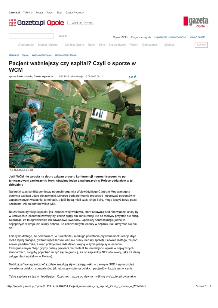 Pacjent ważniejszy czy szpital? Czyli o sporze w WCM Gazeta.pl Tokfm.pl Poczta Forum Blogi 19.06.2013 14:18 Gazeta Wyborcza Lubię to! 4,4 tys. Szukaj Wiadomości Gazeta.pl Opole Miasta regionu Wiadomości Opole Co Jest Grane Opole 29ºC Sport Kina Na weekend Prognoza pogody Forum Ogłoszenia - Nieruchomości Ogłoszenia Miejsca Zmień miasto Kontakt Wiadomości z Opola Pacjent ważniejszy czy szpital? Czyli o sporze w WCM - pisze Beata Łabutin, Gazeta Wyborcza 15.06.2013 , aktualizacja: 15.06.2013 08:11 A AA Fot. Rafał Mielnik / AG Jeśli WCM nie wycofa na dobre zakazu pracy u konkurencji neurochirurgom, to po tymczasowym zawieszeniu broni stracimy jeden z najlepszych w Polsce oddziałów w tej dziedzinie Na krótki czas konflikt pomiędzy neurochirurgami z Wojewódzkiego Centrum Medycznego a dyrekcją szpitala udało się zawiesić. Lekarze będą normalnie pracować i operować pacjentów w zaplanowanych wcześniej terminach, a jeśli będą mieli czas, chęci i siłę, mogą leczyć także poza szpitalem. Ale ta bomba wciąż tyka. Bo zarówno dyrekcja szpitala, jak i władze województwa, które sprawują nad nim władzę, chcą, by w umowach z lekarzami zawarty był zakaz pracy dla konkurencji. Na co medycy przystać nie chcą, twierdząc, że to ograniczanie ich zawodowej swobody. Opolskiej neurochirurgii, jednej z najlepszych w kraju, nie wróży dobrze. Bo zakazami tych lekarzy w szpitalu i tak utrzymać się nie da. I nie tylko dlatego, że pod bokiem, w Kluczborku, niedługo powstanie prywatna konkurencja (być może lepiej płacąca, gwarantująca lepsze warunki pracy i lepszy sprzęt). Głównie dlatego, że pod koniec października, a więc praktycznie lada dzień, wejdą w życie przepisy o leczeniu transgranicznym. Więc gdyby polscy pacjenci nie znaleźli tu, na miejscu, opieki w najwyższych standardach, mogliby pojechać leczyć się za granicę, za co zapłaciłby NFZ (do kwoty, jaką za daną usługę płaci szpitalowi w Polsce). Najbliższe "transgraniczne" szpitale znajdują się w zasięgu ręki: w dawnym NRD i są na oścież otwarte na polskich specjalistów, jak też oczywiście na polskich pacjentów; każdy jest w cenie. Takie szpitale są też w nieodległych Czechach, gdzie od dawna myśli się o służbie zdrowia jak o http://opole.gazeta.pl/opole/1,35114,14104051,Pacjent_wazniejszy_czy_szpital__Czyli_o_sporze_w_WCM.html Strona 1 z 3 Pacjent ważniejszy czy szpital? Czyli o sporze w WCM 19.06.2013 14:18 biznesie, który ma służyć przede wszystkim pacjentom, a nie ochronie interesu placówki - jak się przyjęło myśleć u nas. Wydaje się, że dyrekcja WCM, konfliktując się z jednym z najlepszych swoich oddziałów - dającym milionowe zyski (tylko w zeszłym roku było to 5 mln zł), podcina gałąź, na której siedzi. Bo jeśli zniknęliby świetni lekarze, to zawiedzeni pacjenci szukaliby pomocy gdzie indziej. Konkurencyjność oddziału neurochirurgii w WCM spadłaby dramatycznie. Jego opinia ucierpiałaby po odejściu pracujących tam dziś lekarzy - i obojętne byłoby, czy poszliby do konkurencji w Kluczborku, czy do dawnego NRD, gdzie leczyliby naszych chorych i nikt nie wymagałby od nich cyrografów o zakazie pracy w konkurencji, czy wręcz do Dubaju, gdzie też ich kuszą bajecznymi honorariami. Zamiast tego trzeba po prostu stawiać na tych, dzięki którym jest się w czymś najlepszym. A nie myśleć kategoriami PRL-u, według których administracyjnie można zablokować coś, co doskonale funkcjonuje na całym świecie. Nie bójmy się konkurencji. Bo żaden monopol nie jest dobry, a zwłaszcza w służbie zdrowia, gdzie chodzi o ludzkie zdrowie i życie, które - choć dla niektórych brzmi to banalnie - powinno być poza wszelkimi kalkulacjami ekonomicznymi. Tymczasem zwolennicy zakazów dla neurochirurgów powtarzają: chodzi o dobro pacjenta, o to, by w swoim szpitalu miał do dyspozycji najlepszy team. Tyle że zakaz pracy lekarza u konkurencji to nic innego, jak ograniczanie pacjentowi dostępu do specjalistów, których w całym kraju jest ledwie czterystu. Bo logiczne jest, że gdyby lekarze z WCM mogli leczyć także gdzie indziej, to dostać się do nich byłoby łatwiej. Monopol to kolejki do zabiegów, to utrudnianie choremu dostępu do lekarza posiadającego unikalne umiejętności, a którego zawłaszczyć chciałby jeden szpital. W dzisiejszych czasach nie da się chronić interesu szpitala, bez uszczerbku dla pacjentów. Starając się zatrzymać lekarzy poprzez zakazywanie im pracy u konkurencji, dyrekcja szpitala mogła sprowokować sytuację, w której cały zespół doświadczonych, sprawnych i sprawdzonych chirurgów poszedłby do konkurencji, gdzie nikt niczego by im nie zakazywał. A że nowych neurochirurgów nie byłoby łatwo znaleźć, najlepszym dowodem fakt, że ani jeden lekarz - czy to z Opola, czy z ościennych województw, czy z dalszej Polski - nie przystąpił do ogłoszonego ostatnio w WCM konkursu na kontrakty na oddziale neurochirurgicznym (notabene był to już trzeci konkurs w ciągu ostatniego półrocza). Nasi lekarze nie przystąpili, bo czekali na korzystniejsze (przede wszystkim bez zakazu pracy u konkurencji) warunki kontraktów, obcy - bo jako cenieni specjaliści mają gdzieś tam w Polsce dobrą pracę i nie zamierzają jej zmieniać. Jeśli po tymczasowym zawieszeniu broni między neurochirurgami a władzami szpitala te drugie nie zrezygnują z zakazów pracy u konkurencji, to bardzo realny będzie najgorszy z możliwych scenariuszów; stracimy ten jeden z najlepszych oddziałów neurochirurgicznych w Polsce. ZOBACZ TAKŻE 300 tys. zł rocznie za wywóz śmieci. Nowa ustawa wykończy szpitale? WCM ma monopol na neurochirurgię. "Dla dobra pacjentów" Dbają o interes szpitala a nie pacjentów? Tak twierdzi ordynator Grube miliony dla zdrowia. Ile kasy poszło dla szpitali Zobacz więcej na temat: Opole http://opole.gazeta.pl/opole/1,35114,14104051,Pacjent_wazniejszy_czy_szpital__Czy