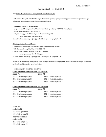 Kraków, 23.01.2014 Komunikat Nr 3 /2014 Dot: Finał Wojewódzki w kategoriach młodzieżowych Małopolski Związek Piłki Siatkowej w Krakowie podaje program rozgrywek finału wojewódzkiego w kategoriach młodzieżowych edycji 2013/2014 I Kategoria Junior – dziewczęta - gospodarz : Międzyszkolny Uczniowski Klub Sportowy POPRAD Stary Sącz Pasiut Janusz telefon 501 686 273 - miejsce rozgrywek: Stary Sącz ul. Daszyńskiego 23 hala sportowa : Gimnazjum Uczestnictwo: zespoły zajmujące 1,2,3 miejsce w grupie A i B II Kategoria Junior – chłopcy - gospodarz : Międzyszkolny Klub Sportowy w Andrychowie Włodarczyk Henryk telefon 502 082 470 - miejsce rozgrywek: Andrychów ul. 1 Maja 4 hala sportowa : im T. Szlagora Uczestnictwo: zespoły zajmujące 1,2,3 miejsce w grupie A i B Informacje podane poniżej dotyczące przeprowadzenia rozgrywek finału wojewódzkiego zarówno juniorek jak i juniorów oraz kadetów. - kolejność gier: juniorek, juniorów Oznaczenie literowe i cyfrowe dla juniorek grupa F1 grupa F2 1F1 - 1 miejsce grupa A 1F2 - 1 miejsce grupa B 2F1 - 2 miejsce grupa B 2F2 - 2 miejsce grupa A 3F1 - 3 miejsce grupa A 3F2 - 3 miejsce grupa B Oznaczenie literowe i cyfrowe dla juniorów grupa F1 grupa F2 1F1 - 1 miejsce grupa B 1F2 - 1 miejsce grupa A 2F1 - 2 miejsce grupa A 2F2 - 2 miejsce grupa B 3F1 - 3 miejsce grupa B 3F2 - 3 miejsce grupa A 14.02.2014 godz. 10.00 1F1 – 3F1 grupa F1 1F2 – 3F2 grupa F2 przerwa obiadowa godz. 16.00 2F1 – 3F1 grupa F1 2F2 – 3F2 grupa F2 15.02.2014 godz. 10.00 1F1 – 2F1 grupa F1 1F2 – 2F2 grupa F2 przerwa obiadowa godz. 15.00 o miejsca 5 3 miejsce grupa F1 - 3 miejsce grupa F2 półfinały 1 miejsce F1 - 2 miejsce F2 2 miejsce F1 - 1 miejsce F2 16.02.2014 godz. 10.00 o miejsce 3 przegrani z półfinałów o miejsce 1 wygrani z półfinałów Zespoły zajmujące 3 miejsca w grupach rozgrywają mecz o 5 miejsce. Zespoły zajmujące 1 i 2miejsce rozgrywają mecze „na krzyż”. Zespoły przegrywające mecze rozgrywają spotkanie o 3 miejsce. Zespoły wygrywające mecze rozgrywają spotkanie o 1 miejsce w finale wojewódzkim. Nagrody Zespoły zajmujące 1,2,3 miejsce otrzymują medale w zależności od zajętego miejsca: złote, srebrne, brązowe. Organizator finału funduje puchary. Mistrzem województwa Małopolskiego na rok 2014 zostaje zespół zajmujący 1 miejsce w finale wojewódzkim a wicemistrzem województwa Małopolskiego zespół zajmujący 2 miejsce. Zawodniczki- zawodnicy otrzymują dyplomy uczestnictwa. III Kategoria kadet – chłopcy - gospodarz : zespół wygrywający grupę B Uczestnictwo: zespoły zajmujące 1,2,3 miejsce w grupie A i B - kolejność gier: Oznaczenie literowe i cyfrowe dla kadetów grupa F1 grupa F2 1F1 - 1 miejsce grupa B 1F2 - 1 miejsce grupa A 2F1 - 2 miejsce grupa A 2F2 - 2 miejsce grupa B 3F1 - 3 miejsce grupa B 3F2 - 3 miejsce grupa A 21.02.2014 godz. 10.00 1F1 – 3F1 grupa F1 1F2 – 3F2 grupa F2 przerwa obiadowa godz. 16.00 2F1 – 3F1 grupa F1 2F2 – 3F2 grupa F2 22.02.2014 godz. 10.00 1F1 – 2F1 grupa F1 1F2 – 2F2 grupa F2 przerwa obiadowa godz. 15.00 o miejsca 5 3 miejsce grupa F1 - 3 miejsce grupa F2 półfinały 1 miejsce F1 - 2 miejsce F2 2 miejsce F1 - 1 miejsce F2 23.02.2014 godz. 10.00 o miejsce 3 przegrani z półfinałów o miejsce 1 wygrani z półfinałów Zespoły zajmujące 3 miejsca w grupach rozgrywają mecz o 5 miejsce. Zespoły zajmujące 1 i 2miejsce rozgrywają mecze „na krzyż”. Zespoły przegrywające mecze rozgrywają spotkanie o 3 miejsce. Zespoły wygrywające mecze rozgrywają spotkanie o 1 miejsce w finale wojewódzkim. Nagrody Zespoły zajmujące 1,2,3 miejsce otrzymują medale w zależności od zajętego miejsca: złote, srebrne, brązowe. Organizator finału funduje puchary. Mistrzem województwa Małopolskiego na rok 2014 zostaje zespół zajmujący 1 miejsce w finale wojewódzkim a wicemistrzem województwa Małopolskiego zespół zajmujący 2 miejsce. Zawodnicy otrzymują dyplomy uczestnictwa. IV Kategoria kadet – dziewczęta - gospodarz : zespół wygrywający ranking wojewódzki Uczestnicy finału wojewódzkiego: 3 zespoły z rankingu + SMS - kolejność gier: 3 zespoły 1-3 2-3 1-2 08.03.2014 4 zespoły 1-4, 2-3 4-3, 1-2 09.03.2014 2-4, 3-1 Nagrody Zespoły zajmujące 1,2,3 miejsce otrzymują medale w zależności od zajętego miejsca: złote, srebrne, brązowe. Organizator finału funduje puchary. Mistrzem województwa Małopolskiego na rok 2014 zostaje zespół zajmujący 1 miejsce w finale wojewódzkim a wicemistrzem województwa Małopolskiego zespół zajmujący 2 miejsce. Zawodniczki otrzymują dyplomy uczestnictwa. Postanowienia obowiązujące uczestników finału wojewódzkiego juniorek, juniorów, kadetek i kadetów. Klub, którego drużyna jest organizatorem finału wojewódzkiego zostaje dofinansowana w wysokości 500 zł. Klub wystawia fakturę – rachunek na Małopolski Związek Piłki Siatkowej za realizację zadania pt: „Organizacja zawodów finałowych kategorii …………. w dniach …………..”. Przekazanie kwoty 500 zł nastąpi po złożeniu sprawozdania z wykonania zadania ( część opisowa + protokoły zawodów). Obsada sędziowska Komisja sędziowska na każde spotkanie – 3 osobowa. Stawki sędziowskie - 2 spotkania następujące po sobie 90 zł brutto - pojedyncze spotkanie 60 zł brutto Zakwaterowanie Organizator rozgrywek finału wojewódzkiego rezerwuje zakwaterowanie dla zespołów na podstawie złożonego zamówienia. Awans do rozgrywek centralnych 1/4 finału juniorki, kadeci, młodziczki Drużyny zajmujące 1, 2 , 3 miejsce w finale wojewódzkim awansują do 1/4 finału o Mistrzostwo Polski. Zespoły te grają w grupach ( nazwy województw) I grupa VII grupa VIII grupa 1. Małopolska I 1. Dolnośląskie I 1. Opolskie I 2. Podkarpackie II 2. Opolskie II 2. Śląskie II 3. Świętokrzyskie III 3. Śląskie III 3. Łódzkie III 4. Świętokrzyskie I 4. Śląskie I 4. Łódzkie I 5. Lubelskie II 5. Łód