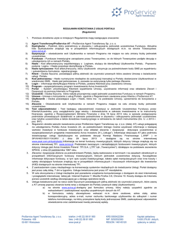 REGULAMIN KORZYSTANIA Z USŁUG PORTALU (Regulamin) 1. 1) 2) 3) 4) 5) 6) 7) 8) 9) 10) 11) 12) 13) 14) 15) 16) 2. 3. 4. 5. 6. Poniższe określenia użyte w niniejszym Regulaminie mają następujące znaczenie: Agent Transferowy/ProService AT - ProService Agent Transferowy Sp. z o. o. Dystrybutor - Podmiot, który pośredniczy w zbywaniu i odkupywaniu jednostek uczestnictwa Funduszy. Aktualna lista Dystrybutorów znajduje się w prospektach informacyjnych dostępnych m.in. na stronie Towarzystwa: www.aviva.pl. Dyspozycja – oświadczenie woli Użytkownika w ramach Programu nie mające na celu zmiany liczby jednostek uczestnictwa Fundusze - Fundusze inwestycyjne zarządzane przez Towarzystwo, co do których Towarzystwo podjęło decyzję o udostępnieniu ich w ramach Portalu. Hasło - Kod alfanumeryczny współistniejący z Loginem, służący do identyfikacji Użytkownika Portalu. Poprawne podanie Loginu i Hasła powoduje identyfikację w Portalu. Hasło tymczasowe- Kod alfanumeryczny, który Użytkownik otrzymuje za pośrednictwem kodu SMS po wypełnieniu i potwierdzeniu formularza rejestracyjnego. Klient - Osoba fizyczna, posiadająca pełną zdolność do czynności prawnych która zawiera Umowę o świadczenie usługi Portalu. Kod jednorazowy - Hasło numeryczne niezbędne do autoryzacji transakcji w Portalu dostarczone Użytkownikowi w wiadomości SMS. Hasło jest jednorazowe, tj. pozwala na autoryzację tylko jednego Zlecenia. Login - informacja identyfikująca Klienta w Portalu, podana Klientowi przy zawieraniu Umowy. Program – wyspecjalizowany program inwestowania Aviva Investors24. Portal - System umożliwiający Klientom wypełnienie Umowy, uzyskiwanie informacji oraz składanie Zleceń i Dyspozycji za pomocą Internetu w Programie. Uczestnik - Osoba fizyczna, która nabyła przynajmniej część jednostki uczestnictwa Funduszy w ramach Programu. Umowa - Umowa o korzystanie z usług Portalu zgodnie z Regulaminem zawierana przez Klienta z ProService AT. Użytkownik - Osoba posiadająca Login i Hasło, która ma na podstawie Umowy, uprawnienia do korzystania z Portalu. Zlecenie - Oświadczenie woli Użytkownika w ramach Programu mające na celu zmianę liczby jednostek uczestnictwa Test odpowiedniości - Test badający odpowiedniość inwestycji w Jednostki Uczestnictwa Funduszu przez Klienta/Uczestnika, przy uwzględnieniu jego wiedzy i doświadczenia w zakresie inwestowania w te instrumenty finansowe, zgodnie z Rozporządzeniem Ministra Finansów z dnia 16 lipca 2013 roku w sprawie postępowania podmiotów prowadzących działalność w zakresie pośrednictwa w zbywaniu i odkupywaniu jednostek uczestnictwa oraz tytułów uczestnictwa a także doradztwa inwestycyjnego w odniesieniu do takich instrumentów (Dz. U. z 2013 r. poz. 847). Regulamin określa warunki świadczenia przez ProService Agent Transferowy sp. z o.o. (dalej: AT) usługi polegającej na udostępnieniu Portalu Aviva Investors 24, za pośrednictwem którego można uzyskiwać informacje o bieżącej wartości inwestycji w fundusze inwestycyjne oraz składać zlecenia i dyspozycje dotyczące uczestnictwa w wyspecjalizowanym programie inwestowania Aviva Investors 24 (,,Usługa”). Informacje dotyczące AT jako podmiotu świadczącego usługi dystrybucyjne na podstawie decyzji Komisji Nadzoru Finansowego (,,KNF” ) nr DFI/II/4031/8/21/13/U/KV z dnia 29 lipca 2013 r. dostępne są na stronie internetowej www.psat.com.pl/dystrybutor.Informacje na temat funduszy inwestycyjnych, których dotyczy Usługa znajdują się na stronie internetowej TFI www.aviva.pl. Podmiotem tworzącym i zarządzającym funduszami inwestycyjnymi, których dotyczy Usługa jest Aviva Investors Poland TFI S.A. („TFI” lub „Towarzystwo”), działające na podstawie zezwolenia KPWiG z dnia 22 października 1997 roku. Zlecenia i dyspozycje złożone za pośrednictwem Portalu, będą realizowane w terminach i na zasadach określonych w prospektach informacyjnych funduszy inwestycyjnych, których jednostek uczestnictwa dotyczą. Szczegółowe informacje dotyczące funduszy, w tym opis ryzyka inwestycyjnego, tabela opłat manipulacyjnych oraz inne koszty i opłaty obciążające fundusze znajdują się w prospektach informacyjnych i kluczowych informacjach dla inwestorów (KIID) dostępnych na stronie internetowej TFI. Z zastrzeżeniem czasu niezbędnego na konserwację systemów niezbędnych do świadczenia Usługi, Portal dostępny jest przez całą dobę, 7 dni w tygodniu. Usługa świadczona jest przez AT nieodpłatnie. W celu skorzystania z Usługi niezbędne jest posiadanie urządzenia komputerowego z dostępem do sieci internetowej i przeglądarki internetowej takiej jak: Internet Explorer 7, Mozilla Firefox 3.6, Chrome 10. Koszty dostępu do Internetu ponosi uczestnik według obowiązującej go u danego operatora taryfy. Usługa świadczona jest na rzecz osób fizycznych posiadających pełną zdolność do czynności prawnych, które zawrą z AT umowę poprzez otwarcie konta wraz z dostępem do Portalu (zwanych dalej Użytkownikami): a) na stronie www.aviva.pl.dostępny jest formularz umowy, który należy uzupełnić zgodnie ze wskazówkami i zaakceptować wysyłkę uzupełnionych danych do AT. b) w formularzu należy obowiązkowo wskazać m.in. dane osobowe, adres stały, adres korespondencyjny, adres e-mail, numer rachunku bankowego użytkownika do odkupień i numer telefonu komórkowego, na który przesyłane będą kody jednorazowe SMS, zaakceptować odpowiednie oświadczenia oraz zadeklarować kwotę pierwszej wpłaty. ProService Agent Transferowy Sp. z o.o. Puławska 436 02-801 Warszawa telefon: (+48 22) 58 81 900 faks: (+48 22) 58 81 950 www.psat.pl KRS 0000422394 NIP: 5252532383 REGON: 146145120 Kapitał zakładowy 5 635 279,00 złotych, opłacony w całości W celu potwierdzenia prawidłowości numeru telefonu komórkowego podanego przez Klienta w Umowie, automatycznie generowany i wysyłany jest do Klienta SMS zawierający K