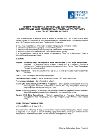OFERTA PROMOCYJNA W PROGRAMIE SYSTEMATYCZNEGO OSZCZĘDZANIA MOJA PERSPEKTYWA („PSO MOJA PERSPEKTYWA”) - 50% OPŁATY MANIPULACYJNEJ Oferta skierowana jest do Klientów, którzy w okresie od 11 maja 2015 r. do 31 lipca 2015 r. zawrą Umowę/Umowy o uczestnictwo w PSO Moja Perspektywa („Umowa/Umowy”) i dokonają pierwszej wpłaty do Programu za pośrednictwem Prowadzącego dystrybucję. Oferta polega na obniżeniu o 50% wysokości opłaty manipulacyjnej pobieranej z tytułu: 1) wszystkich wpłat dokonywanych przy zawarciu Umowy/Umów, 2) wszystkich wpłat dodatkowych dokonywanych w całym okresie trwania Umowy, 3) wszystkich realokacji dokonywanych w całym okresie trwania Umowy. o ile Umowa/Umowy zawarte są w okresie obowiązywania Oferty za pośrednictwem dowolnej placówki Prowadzącego dystrybucję. SŁOWNIK: Program Systematycznego Oszczędzania Moja Perspektywa („PSO Moja Perspektywa”, „Program”) – wyspecjalizowany program inwestycyjny w rozumieniu Prospektów informacyjnych Funduszy inwestycyjnych zarządzanych przez Pioneer Pekao Towarzystwo Funduszy Inwestycyjnych S.A. Agent Transferowy - Pekao Financial Services Sp. z o.o. podmiot prowadzący rejestr Uczestników Funduszu Oferta - Oferta Promocyjna w PSO Moja Perspektywa Portfel Programu („Portfel”) – portfel oferowany w ramach PSO Moja Perspektywa Prowadzący dystrybucję – Bank Pekao S.A. („Bank”) Tabela opłat manipulacyjnych PSO Moja Perspektywa - tabela opłat manipulacyjnych stosowana przy nabywaniu jednostek uczestnictwa w ramach PSO Moja Perspektywa stanowiąca integralną część Umowy oraz niniejszej Oferty Umowa – pisemna Umowa o uczestnictwo w PSO Moja Perspektywa zawierana za pośrednictwem placówki Prowadzącego dystrybucję. Uczestnik może zawrzeć kilka Umów Warunki PSO Moja Perspektywa – Warunki uczestnictwa w Programie Systematycznego Oszczędzania Moja Perspektywa, stanowiące integralną część Umowy oraz niniejszej Oferty OKRES OBOWIĄZYWANIA OFERTY: od 11 maja 2015 r. do 31 lipca 2015 r. (Wskazany okres odnosi się do daty zawarcia Umowy i dokonania pierwszej wpłaty. Kolejne nabycia w Programie, w tym nabycia w ramach realokacji, będą objęte stawką promocyjną do końca trwania danej Umowy - o ile Umowa zostanie zawarta w okresie obowiązywania Oferty.) Materiał dla Doradców Banku Pekao S.A. PRZEDMIOT OFERTY: Wszystkie Fundusze/Subfundusze oferowane w ramach poszczególnych Portfeli PSO Moja Perspektywa, tj.: a. b. c. d. Pioneer FIO - subfundusz Pioneer Akcji Polskich, subfundusz Pioneer Obligacji Plus, subfundusz Pioneer Akcji - Aktywna Selekcja, subfundusz Pioneer Pieniężny Plus Pioneer Funduszy Globalnych SFIO - subfundusz Pioneer Akcji Rynków Wschodzących, subfundusz Pioneer Obligacji Strategicznych, subfundusz Pioneer Alternatywny - Globalnego Dochodu Pioneer Obligacji - Dynamiczna Alokacja FIO Pioneer Strategie Funduszowe SFIO - subfundusz Pioneer Strategii Globalnej ZASADY OFERTY: 1. Oferta polega na obniżeniu o 50% wysokości stawki opłaty manipulacyjnej pobieranej z tytułu: 1) wszystkich wpłat dokonywanych przy zawarciu Umowy/Umów, 2) wszystkich wpłat dodatkowych dokonywanych w całym okresie trwania Umowy, 3) wszystkich realokacji dokonywanych w całym okresie trwania Umowy, o ile Umowa/Umowy zawarte są w okresie od 11 maja 2015 r. do 31 lipca 2015 r. za pośrednictwem dowolnej placówki Prowadzącego dystrybucję. 2. O zastosowaniu obniżenia opłaty manipulacyjnej w ramach Oferty decyduje data zawarcia Umowy/Umów o uczestnictwo w PSO Moja Perspektywa i dokonania pierwszej wpłaty za pośrednictwem placówki Prowadzącego dystrybucję. 3. 50% zniżka w stawce opłaty manipulacyjnej, którą obejmuje Oferta obliczana jest od stawki opłaty manipulacyjnej, stosowanej w ramach PSO Moja Perspektywa, zgodnie z tabelą opłat manipulacyjnych PSO Moja Perspektywa. Do obniżonej w ten sposób stawki opłaty manipulacyjnej zastosowanie mają zniżki, o których mowa w § 3 ust. 2 Warunków PSO Moja Perspektywa. 4. Zniżka, o której mowa w zdaniu pierwszym, pkt 1 powyżej, jest zniżką bezwarunkową. Oznacza to, że w przypadku rozwiązania Umowy po dniu zaistnienia którejkolwiek z okoliczności, o których mowa w § 5 ust. 3 Warunków PSO Moja Perspektywa 50% zniżka w stawce opłaty manipulacyjnej nie zostanie cofnięta, natomiast, zgodnie z Warunkami PSO Moja Perspektywa, zostaną cofnięte zniżki w opłacie manipulacyjnej, o których mowa w § 3 ust. 2 Warunków PSO Moja Perspektywa. 5. Szczegółowe informacje dotyczące PSO Moja Perspektywa dostępne są na stronie internetowej www.pioneer.com.pl. Warunki Uczestnictwa w PSO Moja Perspektywa dostępne są u Prowadzących dystrybucję. 6. Zwolnienie z opłaty manipulacyjnej będzie realizowane przez Agenta Transferowego automatycznie dla wszystkich Umów objętych Ofertą. W związku z powyższym nie ma potrzeby oznaczania tej informacji na zleceniach oraz Aplikacji Multichannel (MCP). Materiał dla Doradców Banku Pekao S.A. Informacja prawna Szczegółowe zasady uczestnictwa w Programie określają Warunki uczestnictwa w tym Programie dostępne u podmiotów prowadzących dystrybucję. Aktywa następujących subfunduszy m ogą być lokowane w papiery wartościowe emitowane, poręczone lub gwarantowane przez dowolny z następujących podmiotów: Skarb Państwa RP, NBP, jednostkę sam orządu terytorialnego, państwo członkowskie UE, jednostkę samorządu terytorialnego państwa należącego do UE, państwo należące do OECD lub międzynarodową instytucję finansową, której członkiem jest Polska lub co najmniej jedno państwo członkowskie UE w następujących proporcjach: Pioneer Obligacji Plus do 100%, Pioneer Pieniężny do 100%, Pioneer Pieniężny Plus do 100%. Aktywa funduszu Pioneer Obligacji Dynamiczna Alokacja FIO mogą być lokowane do 100% wartości aktywów w papiery wartościowe emitowane, poręczone lub gwarantowane przez Skarb Państwa RP lub NBP. Ze względu na skład po