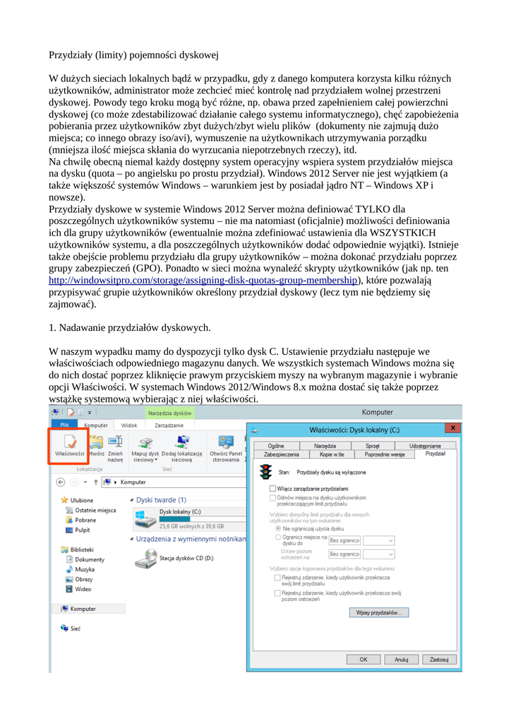 Przydziały (limity) pojemności dyskowej W dużych sieciach lokalnych bądź w przypadku, gdy z danego komputera korzysta kilku różnych użytkowników, administrator może zechcieć mieć kontrolę nad przydziałem wolnej przestrzeni dyskowej. Powody tego kroku mogą być różne, np. obawa przed zapełnieniem całej powierzchni dyskowej (co może zdestabilizować działanie całego systemu informatycznego), chęć zapobieżenia pobierania przez użytkowników zbyt dużych/zbyt wielu plików (dokumenty nie zajmują dużo miejsca; co innego obrazy iso/avi), wymuszenie na użytkownikach utrzymywania porządku (mniejsza ilość miejsca skłania do wyrzucania niepotrzebnych rzeczy), itd. Na chwilę obecną niemal każdy dostępny system operacyjny wspiera system przydziałów miejsca na dysku (quota – po angielsku po prostu przydział). Windows 2012 Server nie jest wyjątkiem (a także większość systemów Windows – warunkiem jest by posiadał jądro NT – Windows XP i nowsze). Przydziały dyskowe w systemie Windows 2012 Server można definiować TYLKO dla poszczególnych użytkowników systemu – nie ma natomiast (oficjalnie) możliwości definiowania ich dla grupy użytkowników (ewentualnie można zdefiniować ustawienia dla WSZYSTKICH użytkowników systemu, a dla poszczególnych użytkowników dodać odpowiednie wyjątki). Istnieje także obejście problemu przydziału dla grupy użytkowników – można dokonać przydziału poprzez grupy zabezpieczeń (GPO). Ponadto w sieci można wynaleźć skrypty użytkowników (jak np. ten http://windowsitpro.com/storage/assigning-disk-quotas-group-membership), które pozwalają przypisywać grupie użytkowników określony przydział dyskowy (lecz tym nie będziemy się zajmować). 1. Nadawanie przydziałów dyskowych. W naszym wypadku mamy do dyspozycji tylko dysk C. Ustawienie przydziału następuje we właściwościach odpowiedniego magazynu danych. We wszystkich systemach Windows można się do nich dostać poprzez kliknięcie prawym przyciskiem myszy na wybranym magazynie i wybranie opcji Właściwości. W systemach Windows 2012/Windows 8.x można dostać się także poprzez wstążkę systemową wybierając z niej właściwości. Zarządzenie przydziałami znajduje się na karcie Przydział. Domyślnie wszelkie przydziały są wyłączone. Włączenie ich następuje w chwili gdy zaznaczona zostanie opcja Włącz zarządzanie przydziałami. Opcja Odmów miejsca na dysku użytkownikom przekraczającym limit przydziału spowoduje, że użytkownicy nie będą mogli zapisać nic ponad rozmiar, który przeznaczy dla nich administrator systemu. Trzeba jednak pamiętać, że ustawienie to potrafi być bardzo zwodnicze; jeżeli użytkownik zapełni swoje miejsce to system może nie pozwolić na usuwanie zgromadzonych danych – jego możliwości do operowania na przestrzeni dyskowej zostaną zupełnie zablokowane (chociaż nie zawsze się tak dzieje). Proszę bowiem pamiętać iż nawet usuwanie wymaga pewnej ilości miejsca na dysku twardym (operacje wewnętrzne systemu pliku). W przypadku niezaznaczenie tej opcji do administratora zgłaszana jest informacja o zapełnieniu przestrzeni przez danego użytkownika jednak możliwy jest dalszy zapis danych aż do zapełnienia się fizycznego miejsca na dysku. Ustawienie Wybierz domyślny limit przydziału dla nowych użytkowników na tym woluminie spowoduje, że każdy nowy użytkownik będzie posiadał/nie będzie posiadał domyślny przydział miejsca. Standardowo opcja zaznaczona jest na Nie ograniczaj użycia dysku. Gdy ją zmienimy możemy ustawić ile miejsca ma otrzymywać nowy użytkownik do swojej dyspozycji oraz kiedy system ma wyświetlić użytkownikowi monit o zapełnianiu się miejsca jego przydziału. Opcja Rejestruj zdarzenie, kiedy użytkownik przekracza swój limit przydziału powoduje, że administrator dostaje informację od systemu iż dany użytkownik przekroczył nałożony na niego limit przydziału dyskowego. Rejestruj zdarzenie, kiedy użytkownik przekracza swój poziom ostrzeżeń powoduje, że administrator otrzyma powiadomienie gdy użytkownik otrzyma ostrzeżenie o przekroczeniu ustawionej ilości miejsca. Dodatkowo na karcie znajduje się przycisk Wpisy przydziałów... Jego wybranie powoduje otworzenie powyższego okna. W nim możemy zmieniać przydziały dla poszczególnych użytkowników systemu. Wyjątkiem jest tutaj dodana GRUPA administratorów – każdy administrator z góry nie posiada ograniczeń miejsca (oczywiście można to zmienić). Aby dodać nowy przydział można wybrać menu Przydział->Nowy wpis przydziału... lub kliknąć na ikonę białej kartki (pierwsza z lewej, w górnej części okna). Proszę pamiętać, że dodać w ten sposób można jedynie użytkowników! Gdy wybierzemy użytkownika pojawi się takie oto okno, w którym możemy dokonać nadania przydziału tylko dla niego. Tym samym ustawienie domyślnego przydziału dla tego użytkownika jest anulowane, np. jeżeli inni użytkownicy mają ustawiony limit na 100 MB, a dodawanemu użytkownikowi ustawimy nielimitowane miejsce, to nie będzie on miał żadnych ograniczeń dyskowych. Po dodaniu przydziału można zobaczyć jego właściwości: (zaznaczyć dany przydział i wybrać Przydział->Właściwości bądź kliknąć 3 ikonę na pasku narzędzi). Można też skasować przydział – Przydział->Usuń wpis przydziału... lub ikona X na pasku narzędziowym. Jeżeli jakiś użytkownik przekroczy udział będzie wyświetlać się przy nim czerwony wykrzyknik; jeżeli przekroczy swoje ostrzeżeniem będzie wyświetlać się żółty trójkąt. Na powyższym zrzucie widać, iż użytkownik user1 znacznie przekroczył swój udział, a użytkownik test przekroczył limit swojego ostrzeżenia. Oczywiście wszystkie powyższe ustawienia będą dotyczyć tylko maszyny lokalnej oraz tylko tych udziałów, które posiadają system plików NTFS/ReFS. Dla innych systemów przydziały nie dział