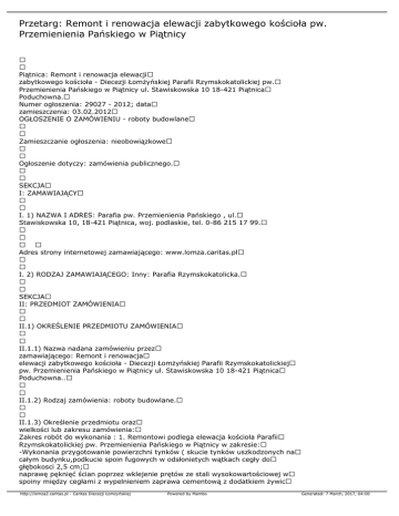 Przetarg: Remont i renowacja elewacji zabytkowego kościoła pw. Przemienienia Pańskiego w Piątnicy Piątnica: Remont i renowacja elewacji zabytkowego kościoła - Diecezji Łomżyńskiej Parafii Rzymskokatolickiej pw. Przemienienia Pańskiego w Piątnicy ul. Stawiskowska 10 18-421 Piątnica Poduchowna. Numer ogłoszenia: 29027 - 2012; data zamieszczenia: 03.02.2012 OGŁOSZENIE O ZAMÓWIENIU - roboty budowlane Zamieszczanie ogłoszenia: nieobowiązkowe Ogłoszenie dotyczy: zamówienia publicznego. SEKCJA I: ZAMAWIAJĄCY I. 1) NAZWA I ADRES: Parafia pw. Przemienienia Pańskiego , ul. Stawiskowska 10, 18-421 Piątnica, woj. podlaskie, tel. 0-86 215 17 99. · Adres strony internetowej zamawiającego: www.lomza.caritas.pl I. 2) RODZAJ ZAMAWIAJĄCEGO: Inny: Parafia Rzymskokatolicka. SEKCJA II: PRZEDMIOT ZAMÓWIENIA II.1) OKREŚLENIE PRZEDMIOTU ZAMÓWIENIA II.1.1) Nazwa nadana zamówieniu przez zamawiającego: Remont i renowacja elewacji zabytkowego kościoła - Diecezji Łomżyńskiej Parafii Rzymskokatolickiej pw. Przemienienia Pańskiego w Piątnicy ul. Stawiskowska 10 18-421 Piątnica Poduchowna.. II.1.2) Rodzaj zamówienia: roboty budowlane. II.1.3) Określenie przedmiotu oraz wielkości lub zakresu zamówienia: Zakres robót do wykonania : 1. Remontowi podlega elewacja kościoła Parafii Rzymskokatolickiej pw. Przemienienia Pańskiego w Piątnicy w zakresie: -Wykonania przygotowanie powierzchni tynków ( skucie tynków uszkodzonych na całym budynku,podkucie spoin fugowych w odsłonietych wątkach cegły do głębokosci 2,5 cm; naprawę pęknięć ścian poprzez wklejenie prętów ze stali wysokowartościowej w spoiny między cegłami z wypelnieniem zaprawa cementową z dodatkiem żywic http://lomza2.caritas.pl - Caritas Diecezji Łomżyńskiej Powered by Mambo Generated: 7 March, 2017, 04:00 epoksydowych( np.system Heli-Bar); zmycie pow.muru pod ciśnieniem, impregnacja środkami mineralnymi, wykonanie tynków cementowo-wapiennych na całym budynku;wykonanie tynków renowacyjnych na cokołach , rekonstrukcja uszkodzonych detali, wykonanie tynków ciągnionych - gzymsów, naprawa i wymiana obróbek parapetów ,gzymsow,attyk itd. z blachy cynkowo-tytanowej na warstwie rozdzielajacej z mat stukturalnych ,gruntowanie przez krzemianowanie powierzchni starych tynków ) pod 2 x malowanie farbami silikonowymi wysokiej klasy ( np. STO SILCO Color ; Keim -Palette Exclusiv ,Remmersa; itd. z wyodrębnieniem kolorystycznym pilastrów ,attyk, portali, gzymsów, obwiedni okien, i drzwi i wszystkich detali architektonicznych. 1)- Roboty rozbiórkowe skucie tynków i wykonanie nowych - ściany plaskie - 1704,18 m2; belek ,pilastrów , ościeży- 486,75m2; gzymsy, pasy ścian - 80,18m łącznie = 2271,11m2 z wklejaniem prętów ze stali wysokowartościowej w spoiny między cegłami z wypełnieniem zaprawą cementową z dodatkiem żywic epoksydowych( np.system Heli-Bar0 w miejscach spękań gzymsow i ścian ( zdjęcia elewacji) 2) - Roboty rozbiorkowe renowacyjne - skucie cokołów - 160,92m2 3) tynki renowacyjne na cokolach - 160,92m2 4)usuwanie wykfitów,odgrzybianie - 3 266,67m2 5) Szpachlowanie ścian gzymsow,pilastrow 3 266,67m2 6) malowanie elewacji farbą silikonową wyższej generacji -3 266,67m2 7) demontaz obróbek blacharskich i montaż z blachy cynkowo-tytanowej z warstwa rozdzielajacą z mat strukturalnych. 7) montaż i demontaż rusztowań zewnętrznych rurowych o wysokości do 20m ; do 30m - 3559,76m2. II.1.4) Czy przewiduje się udzielenie zamówień uzupełniających: nie. II.1.5) Wspólny Słownik Zamówień (CPV): 45.00.00.00-7, 45.45.30.00-7. II.1.6) Czy dopuszcza się złożenie oferty częściowej: nie. II.1.7) Czy dopuszcza się złożenie oferty wariantowej: nie. II.2) CZAS TRWANIA ZAMÓWIENIA LUB TERMIN WYKONANIA: Zakończenie: 15.09.2012. SEKCJA III: INFORMACJE O CHARAKTERZE PRAWNYM, EKONOMICZNYM, FINANSOWYM I TECHNICZNYM III.1) WADIUM Informacja na temat wadium: Wykonawca wnosi wadium w wysokości: 14 000,00 zł. III.2) ZALICZKI · Czy przewiduje się udzielenie zaliczek na poczet wykonania zamówienia: nie http://lomza2.caritas.pl - Caritas Diecezji Łomżyńskiej Powered by Mambo Generated: 7 March, 2017, 04:00 III.3) WARUNKI UDZIAŁU W POSTĘPOWANIU ORAZ OPIS SPOSOBU DOKONYWANIA OCENY SPEŁNIANIA TYCH WARUNKÓW · III. 3.1) Uprawnienia do wykonywania określonej działalności lub czynności, jeżeli przepisy prawa nakładają obowiązek ich posiadania Opis sposobu dokonywania oceny spełniania tego warunku · Zamawiający nie precyzuje w tym zakresie żadnych wymagań,których spełnianie Wykonawca zobowiązany jest wykazać w sposób szczególny. · III.3.2) Wiedza i doświadczenie Opis sposobu dokonywania oceny spełniania tego warunku · Wykonawca wykonał zgodnie z zasadami sztuki budowlanej i prawidłowo ukończył w okresie ostatnich pięciu lat przed upływem terminu składania ofert, a jeżeli okres prowadzenia działalności jest krótszy - w tym okresie, trzy roboty budowlane odpowiadające rodzajem robotom budowlanym, stanowiącym przedmiot zamówienia (remont elewacji budynków zabytkowych z wykonaniem tynków renowacyjnych ,wypraw elewacyjnych,malowaniem fasad ) ; z których jedna musi być o wartości brutto min.500 000,00 zł , a dwie o wartości brutto min. 200 000,00 zł. · III.3.3) Potencjał techniczny Opis sposobu dokonywania oceny spełniania tego warunku · Wykonawca winien dysponować co najmniej następującym sprzętem niezbędnym do wykonania zamówienia : Rusztowania rurowe o pow. 1 500 m2 . · III.3.4) Osoby zdolne do wykonania zamówienia Opis sposobu dokonywania oceny spełniania tego warunku · Wykonawca wykaże,że Kierownik budowy posiada stosowne uprawnienia i minimum 3 letnie doświadczenie zawodowe jako kierownik budowy przy realizacji robót budowlanych polegających na wykonywaniu prac konserwatorskich obiektów zabytkowych. · http://lomza2.caritas.pl - Caritas Diecezji Łomżyńskiej Powered by Mambo Generated: 7 March, 2017, 04:00 
