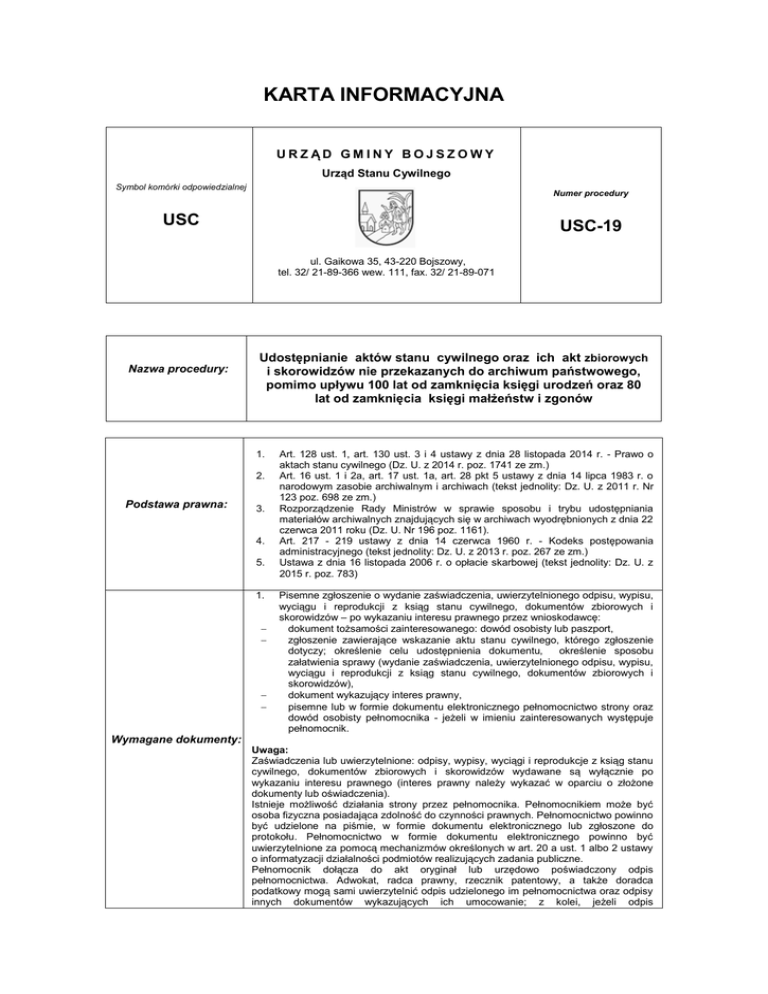 KARTA INFORMACYJNA URZĄD GM INY BOJSZOWY Urząd Stanu Cywilnego Symbol komórki odpowiedzialnej Numer procedury USC USC-19 ul. Gaikowa 35, 43-220 Bojszowy, tel. 32/ 21-89-366 wew. 111, fax. 32/ 21-89-071 Nazwa procedury: Udostępnianie aktów stanu cywilnego oraz ich akt zbiorowych i skorowidzów nie przekazanych do archiwum państwowego, pomimo upływu 100 lat od zamknięcia księgi urodzeń oraz 80 lat od zamknięcia księgi małżeństw i zgonów 1. 2. Podstawa prawna: 3. 4. 5. 1. Art. 128 ust. 1, art. 130 ust. 3 i 4 ustawy z dnia 28 listopada 2014 r. - Prawo o aktach stanu cywilnego (Dz. U. z 2014 r. poz. 1741 ze zm.) Art. 16 ust. 1 i 2a, art. 17 ust. 1a, art. 28 pkt 5 ustawy z dnia 14 lipca 1983 r. o narodowym zasobie archiwalnym i archiwach (tekst jednolity: Dz. U. z 2011 r. Nr 123 poz. 698 ze zm.) Rozporządzenie Rady Ministrów w sprawie sposobu i trybu udostępniania materiałów archiwalnych znajdujących się w archiwach wyodrębnionych z dnia 22 czerwca 2011 roku (Dz. U. Nr 196 poz. 1161). Art. 217 - 219 ustawy z dnia 14 czerwca 1960 r. - Kodeks postępowania administracyjnego (tekst jednolity: Dz. U. z 2013 r. poz. 267 ze zm.) Ustawa z dnia 16 listopada 2006 r. o opłacie skarbowej (tekst jednolity: Dz. U. z 2015 r. poz. 783) Pisemne zgłoszenie o wydanie zaświadczenia, uwierzytelnionego odpisu, wypisu, wyciągu i reprodukcji z ksiąg stanu cywilnego, dokumentów zbiorowych i skorowidzów – po wykazaniu interesu prawnego przez wnioskodawcę: dokument tożsamości zainteresowanego: dowód osobisty lub paszport, zgłoszenie zawierające wskazanie aktu stanu cywilnego, którego zgłoszenie dotyczy; określenie celu udostępnienia dokumentu, określenie sposobu załatwienia sprawy (wydanie zaświadczenia, uwierzytelnionego odpisu, wypisu, wyciągu i reprodukcji z ksiąg stanu cywilnego, dokumentów zbiorowych i skorowidzów), dokument wykazujący interes prawny, pisemne lub w formie dokumentu elektronicznego pełnomocnictwo strony oraz dowód osobisty pełnomocnika - jeżeli w imieniu zainteresowanych występuje pełnomocnik. Wymagane dokumenty: Uwaga: Zaświadczenia lub uwierzytelnione: odpisy, wypisy, wyciągi i reprodukcje z ksiąg stanu cywilnego, dokumentów zbiorowych i skorowidzów wydawane są wyłącznie po wykazaniu interesu prawnego (interes prawny należy wykazać w oparciu o złożone dokumenty lub oświadczenia). Istnieje możliwość działania strony przez pełnomocnika. Pełnomocnikiem może być osoba fizyczna posiadająca zdolność do czynności prawnych. Pełnomocnictwo powinno być udzielone na piśmie, w formie dokumentu elektronicznego lub zgłoszone do protokołu. Pełnomocnictwo w formie dokumentu elektronicznego powinno być uwierzytelnione za pomocą mechanizmów określonych w art. 20 a ust. 1 albo 2 ustawy o informatyzacji działalności podmiotów realizujących zadania publiczne. Pełnomocnik dołącza do akt oryginał lub urzędowo poświadczony odpis pełnomocnictwa. Adwokat, radca prawny, rzecznik patentowy, a także doradca podatkowy mogą sami uwierzytelnić odpis udzielonego im pełnomocnictwa oraz odpisy innych dokumentów wykazujących ich umocowanie; z kolei, jeżeli odpis pełnomocnictwa lub odpisy innych dokumentów wykazujących umocowanie zostały sporządzone w formie dokumentu elektronicznego, ich uwierzytelnienia dokonuje się przy użyciu mechanizmów określonych w ustawie o informatyzacji działalności podmiotów realizujących zadania publiczne. 1. Opłata skarbowa: a) od wydania zaświadczenia lub odpisu uwierzytelnionego z akt stanu cywilnego 33,00 zł, b) od poświadczenia zgodności odpisu, wyciągu, wypisu lub kopii od każdej pełnej lub zaczętej strony – 5,00 zł 2. Opłaty: 3. Opłata skarbowa od złożenia dokumentu stwierdzającego udzielenie pełnomocnictwa - 17,00 zł (nie dotyczy pełnomocnictw udzielanych małżonkowi, wstępnemu, zstępnemu lub rodzeństwu albo gdy mocodawcą jest podmiot zwolniony od opłaty skarbowej). Zwolnione od uiszczenia opłaty skarbowej są osoby, które przedstawią zaświadczenie o korzystaniu ze świadczeń pomocy społecznej z powodu ubóstwa. Opłatę skarbową można uiścić gotówką w kasie Urzędu, znajdującej się na parterze Urzędu Gminy (pokój nr 1) lub przelewem na rachunek bankowy Urzędu: BS Tychy 80 8435 0004 0000 0000 4444 0002 Termin załatwienia: Wydanie zaświadczenia, uwierzytelnionego odpisu, wypisu, wyciągu i reprodukcji z ksiąg stanu cywilnego, dokumentów zbiorowych i skorowidzów – 7 dni. Do 1 miesiąca, w przypadku prowadzenia postępowania wyjaśniającego. Wydanie zaświadczenia, uwierzytelnionego odpisu, wypisu, wyciągu i reprodukcji z ksiąg stanu cywilnego dokumentów zbiorowych i skorowidzów. 2. Postanowienie o odmowie wydania zaświadczenia. 3. Decyzja o odmowie: wydania uwierzytelnionego odpisu, wypisu, wyciągu i reprodukcji z ksiąg stanu cywilnego dokumentów zbiorowych i skorowidzów, udostępnienia dokumentów z uwagi na zły stan techniczny wnioskowanego dokumentu, niepozwalający na realizację zgłoszenia. 1. Sposób załatwienia sprawy; Miejsce złożenia dokumentów Urząd Gminy Bojszowy Urząd Stanu Cywilnego ul. Gaikowa 35 43-220 Bojszowy e-mal: [email protected] tel.32/ 21-89-366 wew. 111 Parter, pokój nr 3 Godziny urzędowania Poniedziałek 7.30-17.00 Wtorek-Czwartek 7.30-15.30 Piątek 7.30-14.00 1. Tryb odwoławczy 2. Pliki do pobrania: 1. 2. W przypadku postanowienia o odmowie wydania zaświadczenia stronie przysługuje prawo wniesienia zażalenia do Naczelnego Dyrektora Archiwów Państwowych w Warszawie za pośrednictwem Kierownika Urzędu Stanu Cywilnego w Bojszowach w terminie 7 dni od dnia doręczenia postanowienia. W przypadku decyzji o odmowie wydania wnioskowanego dokumentu stronie przysługuje prawo wniesienia odwołania do Naczelnego Dyrektora Archiwów Państwowych w Warszawie za pośrednictwem Kierownika Urzędu Stanu Cywilnego w Bojszowach w terminie 14 dni od dnia doręczenia decyzji. Wniosek o odtworzeni