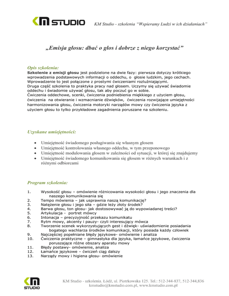 „Emisja głosu: dbać o głos i dobrze z niego korzystać” Opis szkolenia: Szkolenie z emisji głosu jest podzielone na dwie fazy: pierwsza dotyczy krótkiego wprowadzenia podstawowych informacji o oddechu, o głosie ludzkim, jego cechach. Wprowadzenie to jest połączone z prostymi ćwiczeniami rozluźniającymi. Druga część szkolenia to praktyka pracy nad głosem. Uczymy się używać świadomie oddechu i świadomie używać głosu, tak aby poczuć go w sobie. Ćwiczenia oddechowe, scenki, ćwiczenia podniebienia miękkiego z użyciem głosu, ćwiczenia na otwieranie i wzmacnianie dźwięków, ćwiczenia rozwijające umiejętności harmonizowania głosu, ćwiczenia motoryki narządów mowy czy ćwiczenia języka z użyciem głosu to tylko przykładowe zagadnienia poruszane na szkoleniu. Uzyskane umiejętności: Umiejętność świadomego posługiwania się własnym głosem Umiejętność kontrolowania własnego oddechu, w tym przeponowego Umiejętność modulowania głosem w zależności od sytuacji, w której się znajdujemy Umiejętność świadomego komunikowania się głosem w różnych warunkach i z różnymi odbiorcami Program szkolenia: 1. 2. 3. 4. 5. 6. 7. 8. 9. 10. 11. 12. 13. Wysokość głosu – omówienie różnicowania wysokości głosu i jego znaczenia dla naszego komunikowania się Tempo mówienia – jak usprawnia naszą komunikację? Natężenie głosu i jego siła – gdzie leży złoty środek? Barwa głosu, ton głosu- jak dostosowywać ją do wypowiadanej treści? Artykulacja - portret mówcy Intonacja – precyzyjność przekazu komunikatu Rytm mowy, akcenty i pauzy- czyli interesujący mówca Tworzenie scenek wykorzystujących gest i dźwięk- uświadomienie posiadania bogatego wachlarza środków komunikacji, który posiada każdy człowiek Najczęściej popełniane błędy językowe- omówienie i analiza Ćwiczenia praktyczne – gimnastyka dla języka, łamańce językowe, ćwiczenia poruszające różne obszary aparatu mowy Błędy postawy- omówienie, analiza Łamańce językowe – ćwiczeń ciąg dalszy Narządy mowy i higiena głosu- omówienie 14. 15. Krótkie filmiki z różnych warsztatów z emisji głosu- obejrzenie, omówienie Muzyczne ćwiczenia rozgrzewające aparat mowy- słuchanie i śpiew Metodologia: Podczas szkolenia wykorzystujemy następujące metody szkoleniowe: porównywanie prawidłowego i nieprawidłowego użycia głosu analiza wykonanych ćwiczeń analiza filmików szkoleniowych z emisji głosu praca w grupie praca indywidualna korzystanie z informacji zwrotnych Informacje organizacyjne: Ilość godzin szkolenia: 6 godzin / 1 dzień Godziny szkolenia: 9:15-15:15 Miejsce szkolenia: Łódź, ul Piotrkowska 125 – KM Studio - szkolenia