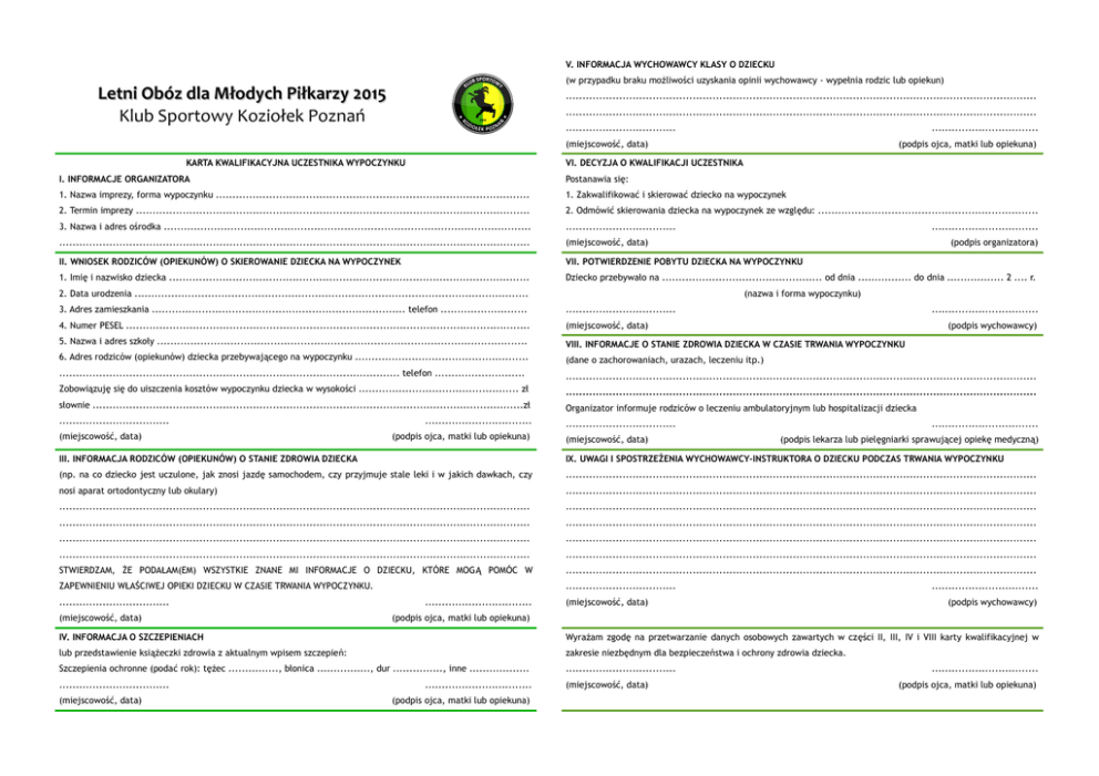 V. INFORMACJA WYCHOWAWCY KLASY O DZIECKU (w przypadku braku możliwości uzyskania opinii wychowawcy - wypełnia rodzic lub opiekun) Letni Obóz dla Młodych Piłkarzy 2015 Klub Sportowy Koziołek Poznań ............................................................................................................................................. ............................................................................................................................................. ................................. ................................ (miejscowość, data) KARTA KWALIFIKACYJNA UCZESTNIKA WYPOCZYNKU (podpis ojca, matki lub opiekuna) VI. DECYZJA O KWALIFIKACJI UCZESTNIKA I. INFORMACJE ORGANIZATORA Postanawia się: 1. Nazwa imprezy, forma wypoczynku .............................................................................................. 1. Zakwalifikować i skierować dziecko na wypoczynek 2. Termin imprezy ...................................................................................................................... 2. Odmówić skierowania dziecka na wypoczynek ze względu: .................................................................. 3. Nazwa i adres ośrodka .............................................................................................................. ................................. ............................................................................................................................................. (miejscowość, data) II. WNIOSEK RODZICÓW (OPIEKUNÓW) O SKIEROWANIE DZIECKA NA WYPOCZYNEK VII. POTWIERDZENIE POBYTU DZIECKA NA WYPOCZYNKU 1. Imię i nazwisko dziecka ............................................................................................................ Dziecko przebywało na ................................................ od dnia ................ do dnia ................. 2 .... r. 2. Data urodzenia ...................................................................................................................... ................................ (podpis organizatora) (nazwa i forma wypoczynku) 3. Adres zamieszkania ............................................................................ telefon .......................... ................................. 4. Numer PESEL ......................................................................................................................... (miejscowość, data) 5. Nazwa i adres szkoły ............................................................................................................... VIII. INFORMACJE O STANIE ZDROWIA DZIECKA W CZASIE TRWANIA WYPOCZYNKU 6. Adres rodziców (opiekunów) dziecka przebywającego na wypoczynku .................................................... (dane o zachorowaniach, urazach, leczeniu itp.) ...................................................................................................... telefon ........................... ............................................................................................................................................. Zobowiązuję się do uiszczenia kosztów wypoczynku dziecka w wysokości ................................................ zł ............................................................................................................................................. słownie .................................................................................................................................zł Organizator informuje rodziców o leczeniu ambulatoryjnym lub hospitalizacji dziecka ................................. ................................. (miejscowość, data) ................................ (podpis ojca, matki lub opiekuna) (miejscowość, data) ................................ (podpis wychowawcy) ................................ (podpis lekarza lub pielęgniarki sprawującej opiekę medyczną) III. INFORMACJA RODZICÓW (OPIEKUNÓW) O STANIE ZDROWIA DZIECKA IX. UWAGI I SPOSTRZEŻENIA WYCHOWAWCY-INSTRUKTORA O DZIECKU PODCZAS TRWANIA WYPOCZYNKU (np. na co dziecko jest uczulone, jak znosi jazdę samochodem, czy przyjmuje stale leki i w jakich dawkach, czy ............................................................................................................................................. nosi aparat ortodontyczny lub okulary) ............................................................................................................................................. ............................................................................................................................................. ............................................................................................................................................. ............................................................................................................................................. ............................................................................................................................................. ............................................................................................................................................. ............................................................................................................................................. ............................................................................................................................................. ............................................................................................................................................. STWIERDZAM, ŻE PODAŁAM(EM) WSZYSTKIE ZNANE MI INFORMACJE O DZIECKU, KTÓRE MOGĄ POMÓC W ............................................................................................................................................. ZAPEWNIENIU WŁAŚCIWEJ OPIEKI DZIECKU W CZASIE TRWANIA WYPOCZYNKU. ................................. .
