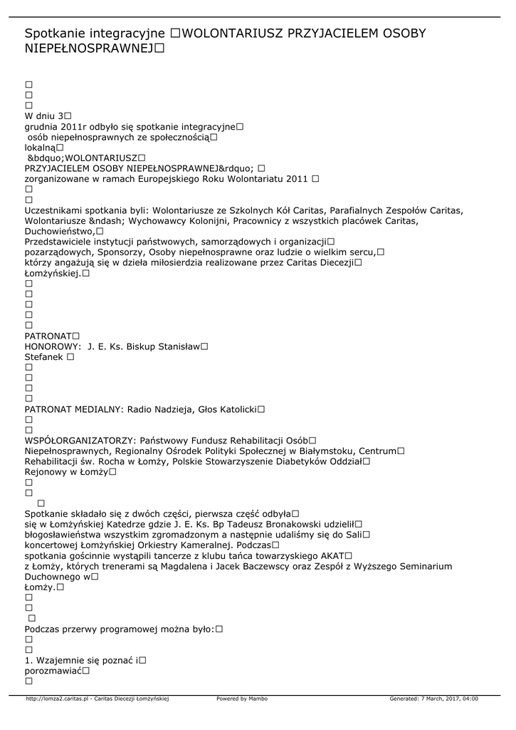 Spotkanie integracyjne WOLONTARIUSZ PRZYJACIELEM OSOBY NIEPEŁNOSPRAWNEJ W dniu 3 grudnia 2011r odbyło się spotkanie integracyjne osób niepełnosprawnych ze społecznością lokalną „WOLONTARIUSZ PRZYJACIELEM OSOBY NIEPEŁNOSPRAWNEJ” zorganizowane w ramach Europejskiego Roku Wolontariatu 2011 Uczestnikami spotkania byli: Wolontariusze ze Szkolnych Kół Caritas, Parafialnych Zespołów Caritas, Wolontariusze – Wychowawcy Kolonijni, Pracownicy z wszystkich placówek Caritas, Duchowieństwo, Przedstawiciele instytucji państwowych, samorządowych i organizacji pozarządowych, Sponsorzy, Osoby niepełnosprawne oraz ludzie o wielkim sercu, którzy angażują się w dzieła miłosierdzia realizowane przez Caritas Diecezji Łomżyńskiej. PATRONAT HONOROWY: J. E. Ks. Biskup Stanisław Stefanek PATRONAT MEDIALNY: Radio Nadzieja, Głos Katolicki WSPÓŁORGANIZATORZY: Państwowy Fundusz Rehabilitacji Osób Niepełnosprawnych, Regionalny Ośrodek Polityki Społecznej w Białymstoku, Centrum Rehabilitacji św. Rocha w Łomży, Polskie Stowarzyszenie Diabetyków Oddział Rejonowy w Łomży Spotkanie składało się z dwóch części, pierwsza część odbyła się w Łomżyńskiej Katedrze gdzie J. E. Ks. Bp Tadeusz Bronakowski udzielił błogosławieństwa wszystkim zgromadzonym a następnie udaliśmy się do Sali koncertowej Łomżyńskiej Orkiestry Kameralnej. Podczas spotkania gościnnie wystąpili tancerze z klubu tańca towarzyskiego AKAT z Łomży, których trenerami są Magdalena i Jacek Baczewscy oraz Zespół z Wyższego Seminarium Duchownego w Łomży. Podczas przerwy programowej można było: 1. Wzajemnie się poznać i porozmawiać http://lomza2.caritas.pl - Caritas Diecezji Łomżyńskiej Powered by Mambo Generated: 7 March, 2017, 04:00 2. Odwiedzić stoiska przygotowane przez: - Placówki Caritas Diecezji Łomżyńskiej: Świetlicę przy Ośrodku Wsparcia Rodziny w Łomży, Centrum Rehabilitacji w Łomży, Ośrodek Wsparcia Rodziny w Zambrowie, Dom Pomocy Społecznej w Tykocinie, Hospicjum Domowe w Ostrołęce - Zespół Szkół Specjalnych w Łomży - Szkolne Koło Caritas przy Zespole Szkół w Szumowie - Stowarzyszenie Diabetyków Oddział Łomża - Stowarzyszenie Rodziców Dzieci Specjalne Troski „Podaruj Uśmiech” Ostrów Mazowiecka 3) poczęstować się kawą i herbatą, zjeść bigos, ciasteczko, 4) wziąć udział w konkursach edukacyjnych dotyczących wolontariatu i działalności PFRON Na spotkanie przybyły również szkolne zespoły teatralne, które wzięły udział w przeglądzie teatralnym „Wolontariusz przyjacielem osoby niepełnosprawnej”. Uczestnicy przeglądu: 1. Zespół teatralny B.C.S.K przy parafii pw. Bożego Ciała w Łomży - tytuł przedstawienia „Boże Narodzenie w Centrum handlowym” – Pan Karol Cuch 2. Zespół Szkół Specjalnych w Łomży – Pani Danuta Lasota 3. Szkoła Podstawowa w Czyżewie – Pan Radosław Sienicki 4. Zespół Szkół w Szumowie – Pani Wioletta Suchcicka, Pani Anna Dąbrowska Komor 5. Zespół Szkół w Płonce Kościelnej – Pani Agnieszka Stypułkowska 6. Zespół Szkół w Kuleszach Kościelnych – Pani Dorota Zielińska, ks. Marcin Kaczyński http://lomza2.caritas.pl - Caritas Diecezji Łomżyńskiej Powered by Mambo Generated: 7 March, 2017, 04:00 7. Publiczne Gimnazjum im. A. Krzyżanowskiego w Kadzidle – Pani Honorata Czachowska, Siostra Alicja Skiba 8. Gimnazjum im. Papieża Jana Pawła II w Ciechanowcu – Pani Anna Kowalewska, Pani Alicja Żebrowska 9. III Liceum Ogólnokształcące w Łomży – Pani Marta Wojewoda 10. Zespół Szkół Samorządowych w Nowogrodzie – Pani Maria Dąbrowska, ks. Zbigniew Pruszyński W spotkaniu uczestniczyło około 700 osób. W skład zespołu organizacyjnego spotkania weszli: pracownicy Caritas Diecezji Łomżyńskiej oraz wolontariusze z Publicznego Gimnazjum Nr 1 i Nr 2 w Łomży Dziękujemy wszystkim którzy zaangażowali się w organizację spotkania. Zapraszamy do galerii zdjęć: Wolontariusz przyjacielem Osoby niepełnosprawnej http://lomza2.caritas.pl - Caritas Diecezji Łomżyńskiej Powered by Mambo Generated: 7 March, 2017, 04:00