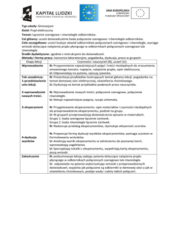 [Wpisz tekst] Typ szkoły: Gimnazjum Dział: Prąd elektryczny Temat: Łączenie szeregowe i równoległe odbiorników. Cel główny: uczeń doświadczalnie bada połączenie szeregowo i równolegle odbiorników. Cele szczegółowe: uczeń buduje obwód odbiorników połączonych szeregowo i równolegle, wyciąga wnioski dotyczące natężenia prądu płynącego w odbiornikach połączonych szeregowo lub równolegle. Środki dydaktyczne: zgodnie z instrukcjami do doświadczeń. Metody i formy pracy: ćwiczenia laboratoryjne, pogadanka, dyskusja, praca w grupach. Etapy lekcji Czynności: nauczyciel (N), uczeń (U). Wprowadzenie N: Przypomnienie najważniejszych pojęć i treści niezbędnych do zrozumienia omawianego tematu: napięcie, natężenie prądu, opór elektryczny. U: Odpowiadają na pytania, opisują zjawiska. Tok zasadniczy: N: Prezentacja przykładów ilustrujących temat główny lekcji: pogadanka na 1-przedstawienie temat domowej sieci elektrycznej, oświetlenia choinkowego. celu lekcji. U: Dyskutują na temat przykładów podanych przez nauczyciela. 2-wprowadzenie nowych treści. N: Wprowadzenie nowych treści: połączenie szeregowe, połączenie równoległe. U: Notuje najważniejsze pojęcia, rysuje schematy. 3-eksperyment N: Przygotowanie eksperymentu: opis materiałów i czynności niezbędnych do przeprowadzenia eksperymentu, podział na grupy. U: W grupach przeprowadzają doświadczenia opisane w materiałach. Grupa 1: bada szeregowe łączenie żarówek. Grupa 2: bada równoległe łączenie żarówek. N: Nadzoruje przebieg eksperymentów, stymuluje aktywność uczniów. 4-dyskusja wyników Zakończenie N: Proponuje formę dyskusji wyników eksperymentów, pomaga uczniom w formułowaniu wniosków. U: Analizują wyniki eksperymentu w odniesieniu do poznanej teorii, wprowadzają uogólnienia. U: Sporządzają notatki z eksperymentu, wypełniają kartę eksperymentu, piszą wnioski. N: podsumowuje lekcję zadając pytania dotyczące natężenia prądu płynącego w odbiornikach połączonych szeregowo lub równolegle. U: odpowiada na pytania wykorzystując wnioski z przeprowadzonych doświadczeń, wyjaśnia jak połączone są odbiorniki w domowej sieci a jak w oświetleniu choinkowym, podaje wady i zalety takich połączeń. [Wpisz tekst] Karta eksperymentu 1 Temat eksperymentu Instrukcja wykonania Obserwacje (opisujemy w punktach przebieg eksperymentu: przyczyna skutek) Wnioski (odniesienie do teorii) Szeregowe łączenie żarówek. Sporządzić zestaw doświadczalny zgodnie z instrukcją (materiały str…). Łączymy kolejno 1, 2 i 3 jednakowe żaróweczki szeregowo z baterią (ryc. 24, 25 i 26). Obserwuj jasność świecenia żarówek po każdym przyłączeniu nowej żarówki. Co można powiedzieć o natężeniu prądu przepływającym w obwodzie po każdym zwiększeniu liczby żaróweczek. Sprawdź swoje przypuszczenia włączając w obwód szeregowo amperomierz. Sprawdź co się stanie gdy jedną z żarówek wykręcimy z oprawki. [Wpisz tekst] Karta eksperymentu 2 Temat eksperymentu Równoległe łączenie żarówek. Sporządzić zestaw doświadczalny zgodnie z instrukcją (materiały str…). Instrukcja wykonania Montujemy układ trzech jednakowych żarówek zgodnie ze schematem 4 i ryc. 27. Zwróć uwagę na to, które z żarówek świecą jaśniej. Sprawdź, co się stanie, gdy połączymy równolegle tylko dwie żarówki, a później trzy żarówki. Sprawdź, co się stanie, gdy wykręcimy jedną z żarówek. Obserwacje (opisujemy w punktach przebieg eksperymentu: przyczyna skutek) Wnioski (odniesienie do teorii)