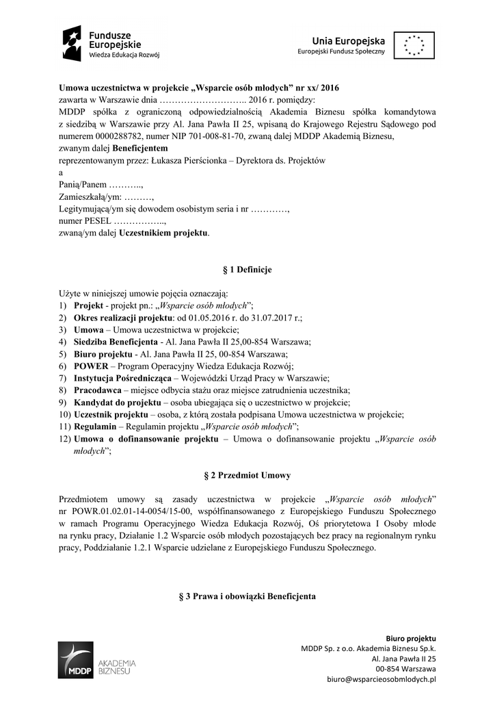 Umowa uczestnictwa w projekcie „Wsparcie osób młodych” nr xx/ 2016 zawarta w Warszawie dnia ……………………….. 2016 r. pomiędzy: pomi MDDP spółka z ograniczoną odpowiedzialnością Akademia Biznesu spółka komandytowa z siedzibą w Warszawie przy Al. Jana Pawła II 25, wpisan wpisaną do Krajowego Rejestru Sądowego S pod numerem 0000288782, numer NIP 701-008-81-70, 701 zwaną dalej MDDP Akademią Biznesu, zwanym dalej Beneficjentem reprezentowanym przez: Łukasza Pierścionka Pier – Dyrektora ds. Projektów a Panią/Panem ……….., Zamieszkałą/ym: ………, Legitymującą/ym się dowodem osobistym seria i nr …………, numer PESEL …………….., zwaną/ym dalej Uczestnikiem projektu rojektu. § 1 Definicje Użyte yte w niniejszej umowie pojęcia oznaczaj oznaczają: 1) Projekt - projekt pn.: „Wsparcie Wsparcie osób młodych”; młodych 2) Okres realizacji projektu:: od 01.05.2016 01.0 r. do 31.07.2017 r.; 3) Umowa – Umowa uczestnictwa w projekcie; 4) Siedziba Beneficjenta - Al. Jana Pawła II 25,00-854 25,00 Warszawa; 5) Biuro projektu - Al. Jana Pawła II 25, 00-854 Warszawa; 6) POWER – Program Operacyjny Wiedza Edukacja Rozwój; 7) Instytucja Pośrednicząca – Wojewódzki Urząd Pracy w Warszawie; 8) Pracodawca – miejsce odbycia stażu sta oraz miejsce zatrudnienia uczestnika; 9) Kandydat do projektu – osoba ubiegająca ubiegaj się o uczestnictwo w projekcie; 10) Uczestnik projektu – osoba, z którą któr została podpisana Umowa uczestnictwa w projekcie; 11) Regulamin – Regulamin projektu rojektu „Wsparcie „ osób młodych”; 12) Umowa o dofinansowanie projektu – Umowa o dofinansowanie projektu rojektu „Wsparcie „ osób młodych”; § 2 Przedmiot Umowy Przedmiotem umowy sąą zasady uczestnictwa w projekcie „Wsparcie Wsparcie osób młodych” młodych nr POWR.01.02.01-14-0054/15--00, 00, współfinansowanego z Europejskiego Funduszu Społecznego w ramach Programu Operacyjnego Wiedza Edukacja Rozwój, Oś O priorytetowa I Osoby młode na rynku pracy, Działanie 1.2 Wsparcie osób młodych pozostających pozostaj cych bez pracy na regionalnym region rynku pracy, Poddziałanie 1.2.1 Wsparcie udzielane z Europejskiego Funduszu Społecznego. Społecznego § 3 Prawa i obowiązki Beneficjenta Biuro projektu MDDP Sp. z o.o. Akademia Biznesu Sp.k. Al. Jana Pawła II 25 00-854 Warszawa [email protected] 1) Beneficjent w wykonaniu Umowy zobowiązuje zobowi się do: a) udzielenia Uczestnikowi czestnikowi projektu rojektu wsparcia zgodnie z zapisami umowy o dofinansowanie projektu, rojektu, Regulaminem oraz obowiązującymi obowi cymi w tym zakresie przepisami prawa; realizuj szkolenia i doradztwo;; b) zapewnienia wykwalifikowanej kadry realizującej c) wydania Uczestnikowi czestnikowi projektu stosownych zaświadczeń i certyfikatów o udzielonych formach wsparcia pod warunkiem wypełnienia przez uczestnika projektu p zobowiązań określonych niniejszą Umową Umow i Regulaminem; d) zwrotu kosztów dojazdu Uczestnika na szkolenia zgodnie z zasadami określonymi okre w Regulaminie w § 6 ust.9; e) wypłaty dodatku ku motywacyjnego zgodnie z zasadami określonymi okre lonymi w Regulaminie w § 6 ust.10; f) zwrotów kosztów opieki nad osobą osob zależną zgodnie z zasadami okre określonymi w Regulaminie w § 6 ust.11; g) wypłaty stypendium stażowego zgodnie z zasadami określonymi okre lonymi w Regulaminie. 2) Beneficjent ficjent w zakresie wykonania Umowy ma prawo do korzystania z podwykonawców w zakresie zgodnym z Umową o dofinansowanie Projektu. § 4 Prawa i obowiązki obowi Uczestnika projektu 1) Uczestnik projektu rojektu jest zobowiązany zobowią do: a) uczestnictwa w doradztwie mającym maj na celu opracowanie Indywidualnego Planu Działania; b) uczestnictwa w każdej żdej dej formie wsparcia wskazanej w Indywidualnym Planie Działania; c) uczestnictwa w badaniach ewaluacyjnych; d) przestrzegania pkt. 6 oraz pkt. 7 zawartych w Oświadczeniu O wiadczeniu Uczestnika Projektu; Projektu e) przestrzegania ania Regulaminu projektu; f) każdorazowego sporządzania ądzania dzania i dostarczania Beneficjentowi prawidłowo wypełnionych i podpisanych dokumentów wymaganych przez Beneficjenta, potrzebnych do prawidłowej realizacji i rozliczenia projektu. Dokumenty będą b dostarczane przez Uczestnika projektu w terminie wyznaczonym przez Beneficjenta i miejscu wskazanym przez Beneficjenta; Beneficjenta g) przestrzegania zasad współżycia współżycia społecznego i norm powszechnie obowiązujących. obowią 2) Z obowiązków określonych ślonych w § 4 ust. 1 zwalnia Uczestnika projektu: a) podjęcie cie zatrudnienia w oparciu o: i) stosunek pracy (regulowany w szczególności szczególno ustawą z dnia 26 czerwca 1974 r. – Kodeks pracy); ii) stosunek cywilnoprawny (regulowany ustawą ustaw z dnia 23 kwietnia 1946 r. – Kodeks cywilny); iii) podjęcie działalności ści gospodarczej (regulowane w szczególności szczególności ustaw ustawą z dnia 2 lipca 2004 r. o swobodzie dzie działalności działalno gospodarczej). b) działanie siły wyższej,, bądź b inna okoliczność, którą Beneficjent zakwalifikuje za jako wystarczającą. 3) Brak uczestnictwa w formach wsparcia wskazanych w Indywidualnym Planie Plan Działania będzie traktowane towane jako nieuzasadnione odstąpienie odst od niniejszej Umowy. Biuro projektu MDDP Sp. z o.o. Akademia Biznesu Sp.k. Al. Jana Pawła II 25 00-854 Warszawa [email protected] Rozwią Umowy uczestnictwa w projekcie § 5 Rozwiązanie 1) Beneficjent możee w każdej każ chwili rozwiązać Umowę uczestnictwa w projekcie z Uczestnikiem projektu jektu w trybie natychmiastowym. natychmiastowym 2) Rozwiązanie zanie umowy w trybie natychmiastowym może mo nastąpić,, gdy uczestnik nie przestrzega § 4 Umowy. 3) Wypowiedzenie ma charakter pisemny. 4) W przypadku gdy: a) Uczestnik projektu nie realizuje założeń zało Indywidualnego Planu Działania zgodnie z przyjętym tym