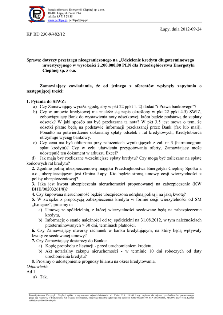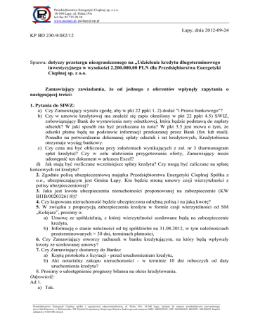 Przedsiębiorstwo Energetyki Cieplnej sp. z o.o. 18-100 Łapy, ul. Polna 19A tel./fax 85 715 28 38 www.peclapy.pl, [email protected] Łapy, dnia 2012-09-24 KP BD 230-9/482/12 Sprawa: dotyczy przetargu nieograniczonego na „Udzielenie kredytu długoterminowego inwestycyjnego w wysokości 2.200.000,00 PLN dla Przedsiębiorstwa Energetyki Cieplnej sp. z o.o. Zamawiający zawiadamia, że od jednego z oferentów wpłynęły zapytania o następującej treści: 1. Pytania do SIWZ: a) Czy Zamawiający wyraża zgodę, aby w pkt 22 ppkt 1. 2) dodać "i Prawa bankowego"? b) Czy w umowie kredytowej ma znaleźć się zapis określony w pkt 22 ppkt 4.5) SWIZ, zobowiązujący Bank do wystawienia noty odsetkowej, która będzie podstawą do zapłaty odsetek? W jaki sposób ma być przekazana ta nota? W pkt 3.5 jest mowa o tym, że odsetki płatne będą na podstawie informacji przekazanej przez Bank (fax lub mail). Ponadto na potwierdzenie dokonanej spłaty odsetek i rat kredytowych, Kredytobiorca otrzymuje wyciąg bankowy. c) Czy cena ma być obliczona przy założeniach wynikających z zał. nr 3 (harmonogram spłat kredytu)? Czy w celu ułatwienia przygotowania oferty, Zamawiający może udostępnić ten dokument w arkuszu Excel? d) Jak mają być rozliczane wcześniejsze spłaty kredytu? Czy mogą być zaliczane na spłatę końcowych rat kredytu? 2. Zgodnie polisą ubezpieczeniową majątku Przedsiębiorstwa Energetyki Cieplnej Spółka z o.o., ubezpieczającym jest Gmina Łapy. Kto będzie stroną umowy cesji wierzytelności z polisy ubezpieczeniowej? 3. Jaka jest kwota ubezpieczenia nieruchomości proponowanej na zabezpieczenie (KW BI1B/00203261/8)? 4. Czy kupowana nieruchomość będzie ubezpieczona odrębną polisą i na jaką kwotę? 5. W związku z propozycją zabezpieczenia kredytu w formie cesji wierzytelności od SM „Kolejarz”, prosimy o: a) Umowę ze spółdzielnią, z której wierzytelności scedowane będą na zabezpieczenie kredytu, b) Informację o stanie należności od tej spółdzielni na 31.08.2012, w tym należnościach przeterminowanych > 30 dni, terminach płatności, 6. Czy Zamawiający otworzy rachunek w banku kredytującym, na który będą wpływały kwoty ze scedowanej umowy? 7. Czy Zamawiający dostarczy do Banku: a) Kopię protokołu z licytacji - przed uruchomieniem kredytu, b) Akt notarialny zakupu nieruchomości - w terminie 10 dni roboczych od daty uruchomienia kredytu? 8. Prosimy o udostępnienie prognozy bilansu na okres kredytowania. Odpowiedź: Ad 1. a) Tak. Przedsiębiorstwo Energetyki Cieplnej spółka z ograniczona odpowiedzialnością, ul. Polna 19A, 18-100 Łapy, wpisana do rejestru przedsiębiorców prowadzonego przez Sąd Rejonowy w Białymstoku, XII Wydział Gospodarczy Krajowego Rejestru Sądowego pod numerem KRS: 0000388103, NIP: 9662066818, REGON: 200444682, Kapitał zakładowy 9 000 000 złotych Przedsiębiorstwo Energetyki Cieplnej sp. z o.o. 18-100 Łapy, ul. Polna 19A tel./fax 85 715 28 38 www.peclapy.pl, [email protected] b) Zamawiający dopuszcza możliwość spłaty odsetek od faktycznie wykorzystanego kredytu w miesięcznych okresach obrachunkowych na podstawie wyciągu bankowego, noty odsetkowej lub innej pisemnej informacji przekazanej przez bank. W umowie kredytowej ma znaleźć się zapis o dokumencie na podstawie którego bank będzie informował o odsetkach i formie jego dostarczenia do kredytobiorcy. c) Tak. Arkusz zamieszczono na stronie www.peclapy.pl jako załącznik: „zal._nr_3_SIWZ_PEC_2012_09_07” d) Tak. Ad 2. Zamawiający przewiduję cesje wierzytelności z umowy ze SM „Kolejarz”. Ad 3. 434078,85. Ad 4. Kupowana nieruchomość zostanie ubezpieczona odrębną polisą na kwotę zgodną z operatem szacunkowym. Ad 5. a) Umowa jest opatrzona klauzulą poufności, w związku z tym zostanie udostępniona jednostce finansującej po rozstrzygnięciu przetargu. Zgodę Spółdzielni na podpisanie cesji zamieszczono na stronie www.peclapy.pl jako załącznik: „zgoda na cesje SM” b) Stan należności na 31.08.2012 r. – 205 247,84 zł. Należności przeterminowanych brak. Ad 6. Zamawiający rozważa możliwość otworzenia rachunku. Ad 7. a) Tak. b) Tak. Ad 8. Bilans zamieszczono na stronie www.peclapy.pl jako załącznik: „bilans”. Powyższe wyjaśnienia nie modyfikują przedmiotu zamówienia, wobec czego Zamawiający nie przedłuża terminu składania ofert. Prezes Zarządu Jacek Michał Płoński Przedsiębiorstwo Energetyki Cieplnej spółka z ograniczona odpowiedzialnością, ul. Polna 19A, 18-100 Łapy, wpisana do rejestru przedsiębiorców prowadzonego przez Sąd Rejonowy w Białymstoku, XII Wydział Gospodarczy Krajowego Rejestru Sądowego pod numerem KRS: 0000388103, NIP: 9662066818, REGON: 200444682, Kapitał zakładowy 9 000 000 złotych