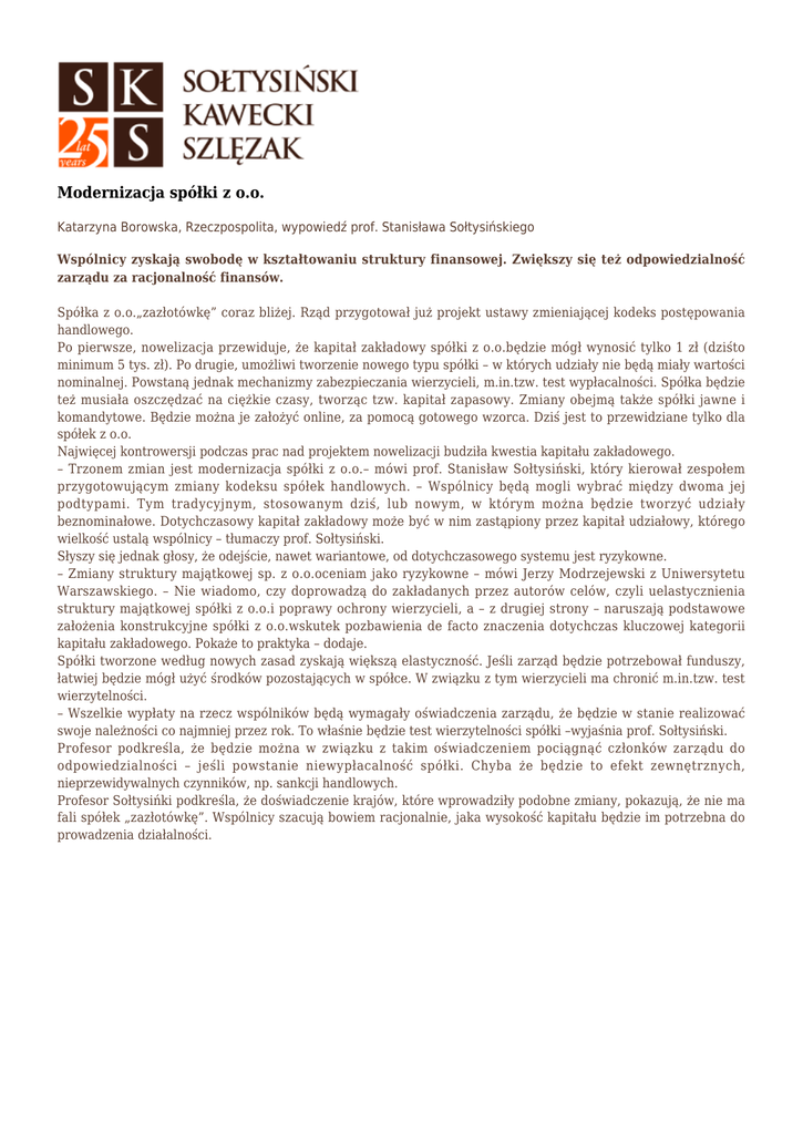 Modernizacja spółki z o.o. Katarzyna Borowska, Rzeczpospolita, wypowiedź prof. Stanisława Sołtysińskiego Wspólnicy zyskają swobodę w kształtowaniu struktury finansowej. Zwiększy się też odpowiedzialność zarządu za racjonalność finansów. Spółka z o.o.„zazłotówkę” coraz bliżej. Rząd przygotował już projekt ustawy zmieniającej kodeks postępowania handlowego. Po pierwsze, nowelizacja przewiduje, że kapitał zakładowy spółki z o.o.będzie mógł wynosić tylko 1 zł (dziśto minimum 5 tys. zł). Po drugie, umożliwi tworzenie nowego typu spółki – w których udziały nie będą miały wartości nominalnej. Powstaną jednak mechanizmy zabezpieczania wierzycieli, m.in.tzw. test wypłacalności. Spółka będzie też musiała oszczędzać na ciężkie czasy, tworząc tzw. kapitał zapasowy. Zmiany obejmą także spółki jawne i komandytowe. Będzie można je założyć online, za pomocą gotowego wzorca. Dziś jest to przewidziane tylko dla spółek z o.o. Najwięcej kontrowersji podczas prac nad projektem nowelizacji budziła kwestia kapitału zakładowego. – Trzonem zmian jest modernizacja spółki z o.o.– mówi prof. Stanisław Sołtysiński, który kierował zespołem przygotowującym zmiany kodeksu spółek handlowych. – Wspólnicy będą mogli wybrać między dwoma jej podtypami. Tym tradycyjnym, stosowanym dziś, lub nowym, w którym można będzie tworzyć udziały beznominałowe. Dotychczasowy kapitał zakładowy może być w nim zastąpiony przez kapitał udziałowy, którego wielkość ustalą wspólnicy – tłumaczy prof. Sołtysiński. Słyszy się jednak głosy, że odejście, nawet wariantowe, od dotychczasowego systemu jest ryzykowne. – Zmiany struktury majątkowej sp. z o.o.oceniam jako ryzykowne – mówi Jerzy Modrzejewski z Uniwersytetu Warszawskiego. – Nie wiadomo, czy doprowadzą do zakładanych przez autorów celów, czyli uelastycznienia struktury majątkowej spółki z o.o.i poprawy ochrony wierzycieli, a – z drugiej strony – naruszają podstawowe założenia konstrukcyjne spółki z o.o.wskutek pozbawienia de facto znaczenia dotychczas kluczowej kategorii kapitału zakładowego. Pokaże to praktyka – dodaje. Spółki tworzone według nowych zasad zyskają większą elastyczność. Jeśli zarząd będzie potrzebował funduszy, łatwiej będzie mógł użyć środków pozostających w spółce. W związku z tym wierzycieli ma chronić m.in.tzw. test wierzytelności. – Wszelkie wypłaty na rzecz wspólników będą wymagały oświadczenia zarządu, że będzie w stanie realizować swoje należności co najmniej przez rok. To właśnie będzie test wierzytelności spółki –wyjaśnia prof. Sołtysiński. Profesor podkreśla, że będzie można w związku z takim oświadczeniem pociągnąć członków zarządu do odpowiedzialności – jeśli powstanie niewypłacalność spółki. Chyba że będzie to efekt zewnętrznych, nieprzewidywalnych czynników, np. sankcji handlowych. Profesor Sołtysińki podkreśla, że doświadczenie krajów, które wprowadziły podobne zmiany, pokazują, że nie ma fali spółek „zazłotówkę”. Wspólnicy szacują bowiem racjonalnie, jaka wysokość kapitału będzie im potrzebna do prowadzenia działalności.
