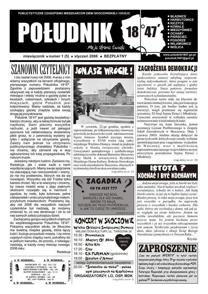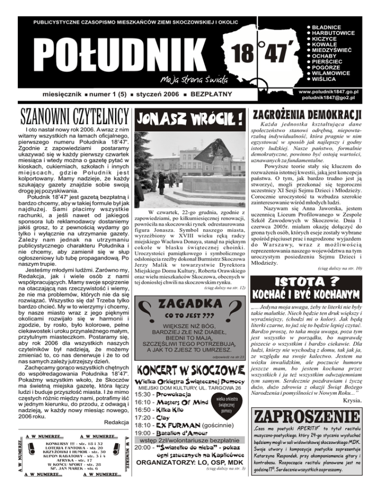 PUBLICYSTYCZNE CZASOPISMO MIESZKAÑCÓW ZIEMI SKOCZOWSKIEJ I OKOLIC miesiêcznik numer 1 (5) SZANOWNI CZYTELNICY A W NUMERZE... ! A W NUMERZE... KONKURSY !!! - str. 18 i 32 LOTERIA FANTOWA - str. 20 KRZY¯ÓWKI I HUMOR - str. 30 KUPON RABATOWY - str. 3 i 4 AFRYKA - str. 17 W KOÑCU SPORT - str. 28 ŒP. JAN MAREK - str. 6 A W NUMERZE... ! A W NUMERZE... A W NUMERZE... A W NUMERZE... I oto nasta³ nowy rok 2006. A wraz z nim witamy wszystkich na ³amach oficjalnego, pierwszego numeru Po³udnika 18o47'. Zgodnie z zapowiedziami postaramy ukazywaæ siê w ka¿dy pierwszy czwartek miesi¹ca i wtedy mo¿na o gazetê pytaæ w kioskach, cukierniach, szko³ach i innych miejscach, gdzie Po³udnik jest kolportowany. Mamy nadzieje, ¿e ka¿dy szukaj¹cy gazety znajdzie sobie swoj¹ drogê jej pozyskiwania. Po³udnik 18o47' jest gazet¹ bezp³atn¹ i bardzo chcemy, aby w takiej formule by³ jak najd³u¿ej. Sami p³acimy wszystkie rachunki, a jeœli nawet od jakiegoœ sponsora lub reklamodawcy dostaniemy jakiœ grosz, to z pewnoœci¹ wydamy go tylko i wy³¹cznie na utrzymanie gazety. Zale¿y nam jednak na utrzymaniu publicystycznego charakteru Po³udnika i nie chcemy, aby zamieni³ siê w s³up og³oszeniowy lub tubê propagandow¹. Po naszym trupie. Jesteœmy m³odymi ludŸmi. Zarówno my, Redakcja, jak i wiele osób z nami wspó³pracuj¹cych. Mamy swoje spojrzenie na otaczaj¹c¹ nas rzeczywistoœæ i wiemy, ¿e nie ma problemów, których nie da siê rozwi¹zaæ. Wszystko siê da! Trzeba tylko bardzo chcieæ. My w to wierzymy i chcemy, by nasze miasto wraz z jego piêknymi okolicami rozwija³o siê w harmonii i zgodzie, by ros³o, by³o kolorowe, pe³ne ciekawostek i uroku przynale¿nego ma³ym, przytulnym miasteczkom. Postaramy siê, aby rok 2006 dla wszystkich naszych czytelników by³ nadziej¹, ¿e mo¿emy zmieniaæ to, co nas denerwuje i ¿e to od nas samych zale¿y jutrzejszy dzieñ. Zachêcamy gor¹co wszystkich chêtnych o do wspó³redagowania Po³udnika 18 47'. Poka¿my wszystkim wko³o, ¿e Skoczów ma œwietn¹ miejska gazetê, która ³¹czy ludzi i buduje przysz³oœæ miasta. I ¿e mimo czêstych ró¿nic miêdzy nami, potrafimy iœæ w jednym kierunku, do przodu, z odwag¹ i nadziej¹, w ka¿dy nowy miesi¹c nowego, 2006 roku. Redakcja styczeñ 2006 www.poludnik1847.go.pl [email protected] BEZP£ATNY JONASZ WRÓCI£ ! ‘ PO£UDNIK 18 47 B£ADNICE HARBUTOWICE KICZYCE KOWALE MIEDZYŒWIEÆ OCHABY PIERŒCIEC POGÓRZE WILAMOWICE WIŒLICA ZAGRO¯ENIA DEMOKRACJI Ka¿da jednostka kszta³tuj¹ca dane spo³eczeñstwo stanowi odrêbn¹, niepowtarzaln¹ indywidualnoœæ, która pragnie w nim egzystowaæ w sposób jak najlepszy i godny istoty ludzkiej. Nasze pañstwo, formalnie demokratyczne, powinno byæ ostoj¹ wartoœci, uznawanych za fundamentalne. Powy¿sze teorie sta³y siê kluczem do rozwa¿enia istotnej kwestii, jak¹ jest koncepcja pañstwa. O tym, jak bardzo trudno jest j¹ stworzyæ, mogli przekonaæ siê tegoroczni uczestnicy XI Sesji Sejmu Dzieci i M³odzie¿y. Corocznie uroczystoœæ ta wzbudza szerokie SF zainteresowanie wœród m³odych ludzi. Nazywam siê Anna Jaworska, jestem W czwartek, 22-go grudnia, zgodnie z uczennic¹ Liceum Profilowanego w Zespole zapowiedziami, po kilkumiesiêcznej renowacji, Szkó³ Zawodowych w Skoczowie. Dnia 1 powróci³a na skoczowski rynek odrestaurowana czerwca 2005r. mia³am okazjê do³¹czyæ do figura Jonasza. Symbol naszego miasta, grona tych osób, których eseje zosta³y wybrane wyrzeŸbiony w XVIII wieku rêk¹ radcy spoœród piêciuset prac i nagrodzone wyjazdem miejskiego Wac³awa Donaya, stan¹³ na piêknym d o W a r s z a w y, w r a z z m o ¿ l i w o œ c i ¹ cokole w blasku œwi¹tecznej choinki. Uroczystoœci pami¹tkowego i symbolicznego reprezentowania naszego województwa na tym ods³oniêcia rzeŸby dokona³ Burmistrz Skoczowa uroczystym posiedzeniu Sejmu Dzieci i Jerzy Malik w towarzystwie Dyrektora M³odzie¿y. (ci¹g dalszy na str. 10) Miejskiego Domu Kultury, Roberta Orawskiego oraz wielu mieszkañców Skoczowa, obecnych w tej donios³ej chwili na skoczowskim rynku. (ci¹g dalszy na str. 12) ? ZAGADKA CO TO JEST ??? ? WIÊKSZE NI¯ BÓG, BARDZIEJ Z£E NI¯ DIABE£, BIEDNI TO MAJ¥, SZCZÊŒLIWI TEGO POTRZEBUJ¥, A JAK TO ZJESZ TO UMRZESZ. odpowiedŸ na str.23 ISTOTA ? KOCHAÆ I BYÆ KOCHANYM „... Jedyna moja uwaga, ¿eby te literki nie by³y takie malutkie. Niech bêdzie ten druk wiêkszy i wyraŸniejszy, (chodzi mi o kolor). Jak bêd¹ literki czarne, to ju¿ siê to bêdzie lepiej czytaæ. Bardzo proszê, to taka moja uwaga, poza tym jest wszystko w porz¹dku, bo naprawdê piszecie o wszystkim i bardzo ciekawie. Dla ludzi, którzy nie wychodz¹ z domu, tak jak ja, ze wzglêdu na swoje kalectwo. Jestem na wózku inwalidzkim, ale poczucie humoru jeszcze mam, bo jestem kochana przez wszystkich i ja te¿ wszystkim odwzajemniam tym samym. Serdecznie pozdrawiam i ¿yczê du¿o, du¿o zdrowia z okazji Œwi¹t Bo¿ego Narodzenia i pomyœlnoœci w Nowym Roku...” KONCERT W SKOCZOWIE M Wielka Orkiestra Œwi¹tecznej Pomocy MIEJSKI DOM KULTURY, UL. TARGOWA 26 15:30 - Prowokacja wielka orkiestra 16:10 - Masters Of Mind œwi¹tecznej 16:50 - Kilka Kilo pomocy 17:20 - Clay 18:10 - EX FURMAN (goœcinnie) 19:00 - Batalion d’Amour wstêp 2z³/wolontariusze bezp³atnie 20:00 - “Œwiate³ko do nieba” - pokaz ogni sztucznych na Kaplicówce ORGANIZATORZY: LO, OSP, MDK (ci¹g dalszy na str. 3) M Krysia. ZAPROSZENIE „Czas ma poetycki APERITIF” to tytu³ recitalu muzyczno-poetyckiego, który 24-go stycznia wys³uchaæ bêdziemy mogli w sali widowiskowej skoczowskiego MDK. Swoje utwory i kompozycje poetyckie zaprezentuje Katarzyna Respondek, przy akompaniamencie gitary i kontrabasu. Rozpoczêcie recitalu planowane jest na godzinê 1700. Serdecznie wszystkich zapraszamy. M M “Tylko cz³owiek, który kocha³, umiera jak cz³owiek”. Antoine de Saint - Exupéry PO£UDNIK 18o47’ Ujednolicone w 1822 r. myto ( w Skoczowie by³ 