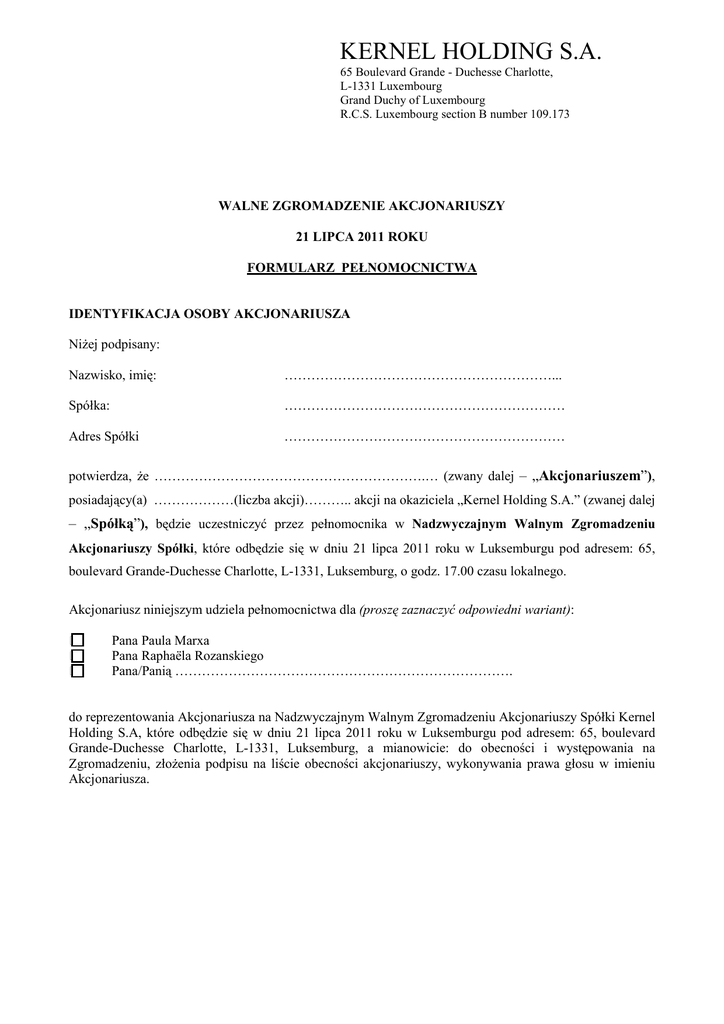 KERNEL HOLDING S.A. 65 Boulevard Grande - Duchesse Charlotte, L-1331 Luxembourg Grand Duchy of Luxembourg R.C.S. Luxembourg section B number 109.173 WALNE ZGROMADZENIE AKCJONARIUSZY 21 LIPCA 2011 ROKU FORMULARZ PEŁNOMOCNICTWA IDENTYFIKACJA OSOBY AKCJONARIUSZA NiŜej podpisany: Nazwisko, imię: ……………………………………………………... Spółka: ……………………………………………………… Adres Spółki ……………………………………………………… potwierdza, Ŝe …………………………………………………….… (zwany dalej – „Akcjonariuszem”), posiadający(a) ………………(liczba akcji)……….. akcji na okaziciela „Kernel Holding S.A.” (zwanej dalej – „Spółką”), będzie uczestniczyć przez pełnomocnika w Nadzwyczajnym Walnym Zgromadzeniu Akcjonariuszy Spółki, które odbędzie się w dniu 21 lipca 2011 roku w Luksemburgu pod adresem: 65, boulevard Grande-Duchesse Charlotte, L-1331, Luksemburg, o godz. 17.00 czasu lokalnego. Akcjonariusz niniejszym udziela pełnomocnictwa dla (proszę zaznaczyć odpowiedni wariant): D Pana Paula Marxa Pana Raphaëla Rozanskiego Pana/Panią …………………………………………………………………. do reprezentowania Akcjonariusza na Nadzwyczajnym Walnym Zgromadzeniu Akcjonariuszy Spółki Kernel Holding S.A, które odbędzie się w dniu 21 lipca 2011 roku w Luksemburgu pod adresem: 65, boulevard Grande-Duchesse Charlotte, L-1331, Luksemburg, a mianowicie: do obecności i występowania na Zgromadzeniu, złoŜenia podpisu na liście obecności akcjonariuszy, wykonywania prawa głosu w imieniu Akcjonariusza. KERNEL HOLDING S.A. 65 Boulevard Grande - Duchesse Charlotte, L-1331 Luxembourg Grand Duchy of Luxembourg R.C.S. Luxembourg section B number 109.173 ZLECENIE DO GŁOSOWANIA Na Nadzwyczajnym Walnym Zgromadzeniu Akcjonariuszy Spółki Kernel Holding S.A., które odbędzie się w dniu 21 lipca 2011 roku w Luksemburgu pod adresem: 65, boulevard Grande-Duchesse Charlotte, L-1331, Luksemburg. Uchwała Nr 1 2 Za UpowaŜnia się Radę Dyrektorów Spółki do okresowej emisji nowych akcji zgodnie z podanymi niŜej warunkami, ogólna liczba tych akcji nie powinna przewyŜszać sześciu milionów dziewięciuset osiemdziesięciu trzech tysięcy pięciuset dwudziestu pięciu (6 983 525), bez wskazywania ich wartości nominalnej, w celu tworzenia akcyjnego kapitału zakładowego (z wyłączeniem dotychczas wyemitowanego kapitału akcyjnego) w wysokości stu osiemdziesięciu czterech tysięcy czterystu siedmiu dolarów USA (USD 184 407) zgodnie z ustaleniami art. 32 Ustawy o spółkach handlowych z dnia 10 sierpnia 1915 roku (z późn. zm.) Okres obowiązywania powyŜszych uprawnień upływa natychmiast wraz z zamknięciem publicznej oferty sprzedaŜy akcji Spółki. Przy czym w dowolnym wypadku termin obowiązywania powyŜszych uprawnień wynosi maksymalnie 5 (pięć) lat od daty publikacji ogłoszenia o udzieleniu Radzie Dyrektorów powyŜszych uprawnień w dzienniku urzędowym Luksemburga (Mémorial C, Recueil des Sociétés et Associations). Ponadto, upowaŜnia się Radę Dyrektorów do wyemitowania powyŜszych nowych akcji bez nadawania obecnym akcjonariuszom prawa poboru. Na podstawie wymienionej wyŜej uchwały wnosi się zmiany do pkt 6 i 7 art.5 Statutu Spółki, które otrzymują następujące brzmienie: «Artykuł 5 (punkt 6) Akcyjny kapitał zakładowy (z wyłączeniem dotychczas wyemitowanego kapitału akcyjnego) wynosi sto osiemdziesiąt cztery tysiące czterysta siedem dolarów USA (USD 184 407) i jest reprezentowany przez sześć milionów dziewięćset osiemdziesiąt trzy tysiące pięćset dwadzieścia pięć (6 983 525) akcji bez wskazywania ich wartości nominalnej. (punkt 7) Na okres, który upłynie natychmiast po zamknięciu publicznej oferty sprzedaŜy akcji Spółki, w dowolnym wypadku nie dłuŜszy niŜ 5 (pięć) lat od daty publikacji ogłoszenia takiej uchwały w urzędowym dzienniku Luksemburga (Mémorial C, Recueil des Sociétés et Associations), niniejszym upowaŜnia się Radę Dyrektorów Przeciw Wstrzymał się KERNEL HOLDING S.A. 65 Boulevard Grande - Duchesse Charlotte, L-1331 Luxembourg Grand Duchy of Luxembourg R.C.S. Luxembourg section B number 109.173 do emitowania nowych akcji z dochodem lub bez dochodu oraz do udzielania prawa do subskrypcji akcji.” Prosimy o zaznaczenie swojego wariantu wyboru głosowania stawiając znak (X) w odpowiedniej rubryce. PRAWO DO UDZIAŁU W NADZWYCZAJNYM WALNYM ZGROMADZENIU AKCJONARIUSZY Zgodnie z opublikowanym na oficjalnej stronie Giełdy Papierów Wartościowych w Luksemburgu Zawiadomieniem z dnia 22 lipca 2011 r. Akcjonariusze posiadający jedną lub więcej akcji Spółki na dzień 19 lipca 2011 r. (dalej w treści – „Data zakończenia rejestracji posiadaczy akcji”) mają prawo do wzięcia udziału i wykonywania prawa głosu w Nadzwyczajnym Walnym Zgromadzeniu Akcjonariuszy. Akcjonariusze (których akcje są w dyspozycji u operatora systemu rozliczeń papierów wartościowych bądź przechowywane w specjalnym depozycie lub subdepozycie wyznaczonym przez depozytariusza) zobowiązani są do uzyskania od operatora lub depozytariusza (subdepozytariusza) świadectwa akcji, w którym podana będzie liczba akcji zapisanych na ich rachunku według stanu na datę zakończenia rejestracji posiadaczy akcji. W szczególności akcjonariusze przechowujący akcje Spółki w Krajowym Depozycie Papierów Wartościowych w Polsce (Polish National Deposit of Securities – KDPW) powinni uzyskać świadectwo zdeponowania akcji w odpowiedniej instytucji finansowej (u brokera inwestycyjnego lub w banku powierniczym), która jest uczestnikiem Krajowego Depozytu Papierów Wartościowych w Polsce i prowadzi rachunki tych posiadaczy papierów wartościowych. Zwołanie i przeprowadzenie Nadzwyczajnego Walnego Zgromadzenia Akcjonariuszy nie blokuje swobodnego obrotu akcjami. Do udziału w Na