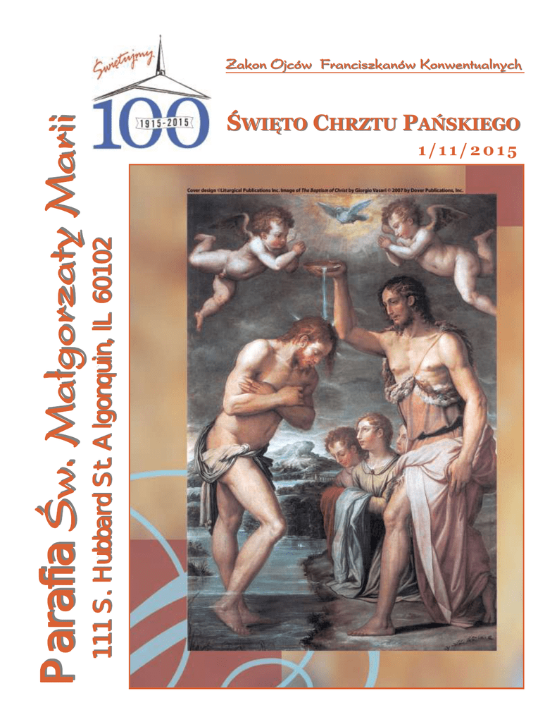 ŚWIĘTO CHRZTU PAŃSKIEGO 1/11/2015 111 S. Hubbard St. Algonquin, lL 60102 Parafia Św. Małgorzaty Marii Zakon Ojców Franciszkanów Konwentualnych OD PROBOSZCZA “ Tyś jest mój syn umiłowany, w Tobie mam upodobanie”. Drodzy Przyjaciele! Pewna legenda opowiada o legioniście rzymskim z czasów prześladowań chrześcijan, który musiał Słowa Ewangelii pożegnać swoją żonę oczekującą dziecka, ponieważ poszedł na długą wyprawę wojenną. Podczas jego wg św. Mateusza 1, 6b-11 nieobecności, małżonka porodziła syna. Wkrótce potem poznała chrześcijan, nawróciła się i została Jan Chrzciciel tak głosił: „Idzie za mną ochrzczona razem ze swoim dzieckiem. W tym samym mocniejszy ode mnie, a ja nie jestem godzien, czasie jej mąż również spotkał chrześcijan i pod ich aby się schylić i rozwiązać rzemyk u Jego wpływem zapragnął zostać ochrzczonym. Nie mógł sandałów. Ja chrzciłem was wodą, On zaś jednak tego uczynić podczas trwania kampanii chrzcić was będzie Duchem Świętym”. wojennej. Po wojnie wrócił do domu . Jego małżonka była pełna szczęścia i radości z powodu jego powrotu. W owym czasie przyszedł Jezus z Nazaretu Ale bała się przyznać od razu do tego, że ona i dziecko w Galilei i przyjął od Jana chrzest w Jordanie. zostali ochrzczeni, dlatego postanowiła uczynić to W chwili, gdy wychodził z wody, ujrzał stopniowo. Pierwsze pokazała mu dziecko i wspomnia- rozwierające się niebo i Ducha jak gołębicę ła, że ich syn jest ochrzczony. Jej mąż zamilkł i zamyślił zstępującego na siebie. A z nieba odezwał się się głęboko. Po czym spojrzał jeszcze raz na dziecko głos: „Tyś jest mój Syn umiłowany, w Tobie i ukląkł przed kołyską. Skłonił swoją głowę, zamknął mam upodobanie”. oczy i zaczął modlić się .Jego małżonka głęboko zaskoczona taką postawą męża, uklęknęła obok niego i zapytała” Mój Drogi, co robisz?” Mąż otworzył oczy i powiedział : “ Jeśli nasz syn został ochrzczony, to znaczy, że stał się świątynią Boga, ponieważ nasz Pan Jezus Chrystus, Bóg Ojciec Stworzyciel i Duch święty uczynili sobie mieszkanie w jego sercu. Dziękujmy za to modlitwą.” To prawda, że przez Chrzest Święty staliśmy się Bożymi dziećmi i Trójca Święta uczyniła sobie mieszkanie w naszych duszach. W ten sposób otrzymaliśmy nową godność i staliśmy się drogocennymi stworzeniami powołanymi do życia wiecznego z Bogiem. Właśnie dlatego Chrzest Święty powinien nam ciągle przypominać, co jest naszym powołaniem. Jesteśmy powołani aby kochać, służyć i być zbawionymi. Po Chrzcie Świętym nasze życie nie może być takie samo. Powinniśmy pozwolić łasce płynącej z Chrztu przemieniać nasze życie na bardziej godne, chrześcijańskie, bliższe Bogu. Tą myśl bardzo pięknie wyraził św. Leon Wielki, który napisał : " Chrześcijaninie poznaj swoją godność! Stałeś się uczestnikiem Boskiej natury, porzuć więc wyrodne obyczaje dawnego upodlenia i już do nich nie powracaj. Pomnij, jakiej to Głowy i jakiego Ciała jesteś członkiem. Pamiętaj, że zostałeś wydarty mocom ciemności i przeniesiony do światła i królestwa Bożego”. Niech więc dzisiejsze Święto Chrztu Pańskiego pomoże nam zachowywać godność dziecka Bożego i żyć w łasce uświęcającej każdego dnia. Pamiętajmy również o tych, którzy w sposób szczególny mieli udział w naszym chrzcie, a więc o rodzicach, chrzestnych i o szafarzu naszego chrztu. Pokój i Dobro, Fr. Piotr Sarnicki, OFM, Conv. CZYTANIE Z KSIĘGI PROROKA IZAJASZA 42,1-4.6-7 To mówi Pan: „Oto mój Sługa, którego podtrzymuję, Wybrany mój, w którym mam upodobanie. Sprawiłem, że Duch mój na Nim spoczął; On przyniesie narodom Prawo. Nie będzie wołał ni podnosił głosu, nie da słyszeć krzyku swego na dworze. Nie złamie trzciny nadłamanej, nie zagasi knotka o nikłym płomyku. On z mocą ogłosi Prawo, nie zniechęci się ani nie załamie, aż utrwali Prawo na ziemi, a Jego pouczenia wyczekują wyspy. Ja, Pan, powołałem Cię słusznie, ująłem Cię za rękę i ukształtowałem, ustanowiłem Cię przymierzem dla ludzi, światłością dla narodów, abyś otworzył oczy niewidomym, ażebyś z zamknięcia wypuścił jeńców, z więzienia tych, co mieszkają w ciemności”. CZYTANIE Z DZIEJÓW APOSTOLSKICH 10,34-38 Gdy Piotr przybył do Cezarei, do domu Korneliusza, przemówił: „Przekonuję się, że Bóg naprawdę nie ma względu na osoby. Ale w każdym narodzie miły jest Mu ten, kto się Go boi i postępuje sprawiedliwie. Posłał swe słowo synom Izraela, zwiastując im pokój przez Jezusa Chrystusa. On to jest Panem wszystkich. Wiecie, co się działo w całej Judei, począwszy od Galilei, po chrzcie, który głosił Jan. Znacie sprawę Jezusa z Nazaretu, którego Bóg namaścił Duchem Świętym i mocą. Przeszedł On, dobrze czyniąc i uzdrawiając wszystkich, którzy byli pod władzą diabła, dlatego że Bóg był z Nim”. OGŁOSZENIA W poniedziałek 12-go stycznia zapraszamy na Mszę św. o 7 wieczorem i nabożeństwo eucharystyczne. W sobotę 17-go stycznia spotkanie grupy młodzieżowej w budynku starej szkoły o godzinie 5 pm i Msza św. młodzieżowa o 6.30 pm. MYŚLI DNIA Bądź zawsze pogodny i zawsze chwal Boga, choćby spadło na ciebie nie wiadomo co. Kościół jest wspólnotą, która prowadzi do jedności z Bogiem i ludźmi. Dodaj mi, Panie, zapału, abym nigdy zbyt łatwo nie rezygnował z praktyk religijnych, ale dostrzegł w nich środek prowadzący do mojego uświęcenia. BÓG ZAPŁAĆ Parafia Św. Małgorzaty Marii 111 S. Hubbard St. Algonquin, IL Bardzo serdecznie dziękuję Uczniom, Katechetom i rodzicom z Polskiej szkoły za przygotowanie i wystawienie Jasełek w naszym kościele w zeszłą niedzielę. Website www.saintmargaretmary.org PO POLSKU Biuro Parafialne 847 658-7625 Fax Parafialny 847-658-7882 Biuro Finansowe 847-658-6071 Szkoła 