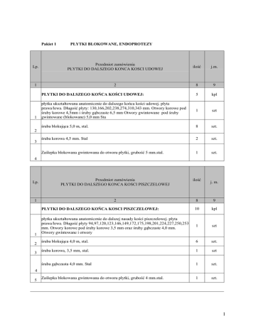 Pakiet 1 PŁYTKI BLOKOWANE, ENDOPROTEZY Lp. Przedmiot zamówienia PŁYTKI DO DALSZEGO KONCA KOSCI UDOWEJ ilość j.m. 1 2 8 9 PŁYTKI DO DALSZEGO KOŃCA KOŚCI UDOWEJ: 5 kpl płytka ukształtowana anatomicznie do dalszego końca kości udowej. płyta prawa/lewa. Długość płyty: 130,166,202,238,274,310,343 mm. Otwory korowe pod śruby korowe 4,5mm i śruby gąbczaste 6,5 mm Otwory gwintowane pod śruby gwintowane (blokowane) 5,0 mm Sta 1 szt śruba blokująca 5,0 m, stal. 8 szt. śruba korowa 4,5 mm. Stal 2 szt. Zaślepka blokowana gwintowana do otworu płytki, grubość 5 mm.stal. 1 szt. 1 2 3 4 Lp. Przedmiot zamówienia PŁYTKI DO DALSZEGO KONCA KOSCI PISZCZELOWEJ ilość 1 2 8 9 PŁYTKI DO DALSZEGO KOŃCA KOSCI PISZCZELOWEJ: 10 kpl płytka ukształtowana anatomicznie do dalszej nasady kości piszczelowej. płyta prawa/lewa. Długość płyty 94,97,120,123,146,149,172,175,198,201,224,227,250,253 mm. Otwory korowe pod śruby korowe 3,5 mm oraz śruby gąbczaste 4,0 mm. Otwory gwintowane i otwory 1 szt śruba blokująca 4,0 m, stal. 6 szt. śruba korowa, 3,5 mm, stal. 1 szt śruba gąbczasta 4,0 mm. Stal 1 szt. Zaślepka blokowana gwintowana do otworu płytki, grubość 4 mm.stal. 1 szt. 1 2 3 j. m. 4 5 1 Lp. Przedmiot zamówienia PŁYTKI DO BLIśSZEJ NASADY KOŚCI PISZCZELOWEJ ilość 1 2 8 9 PŁYTKI DO BLIZSZEJ NASADY KOSCI PISZCZELOWEJ: 20 kpl płytka ukształtowana anatomicznie do bliŜszej nasady kości piszczelowej. płyta prawa/lewa. Długości płyty: 95,121, 147,173,199,225,251 mm. Otwory korowe pod śruby korowe 3,5 mm i śruby gąbczaste 4,0 mm.Otwory gwintowane pod śruby gwintowane 4,0 mm Stal. 1 szt śruba blokująca 4,0 m, stal. 6 szt. śruba korowa, 3,5 mm, stal. 1 szt śruba gąbczasta 4,0 mm. Stal 1 szt. Zaślepka blokowana gwintowana do otworu płytki, grubość 4 mm.stal. 1 szt. 1 2 3 4 5 j. m. Lp. Przedmiot zamówienia PŁYTKI DO CZĘŚCI DALSZEJ KOŚCI RAMIENNEJ ilość 1 2 8 9 5 kpl 1 szt 1 PŁYTKI DO CZĘŚCI DALSZEJ KOŚCI RAMIENNEJ: Tytanowe płytki anatomiczne o zmniejszonym nacisku do zespoleń złamań nasady dalszej kości ramiennej i części bliŜszej kości łokciowej. Płytki z wgłębieniami minimalizujące kontakt z okostną, w skład systemu wchodzą a) płytki blokowane od strony przyśrodkowej (standardowe i wydłuŜone - uniwersalne do obu kończyn) b) płytki blokowane od strony bocznej nasady dalszej kości ramieniowej (prawe i lewe) c) płytki blokowane od strony tylno-przyśrodkowej (prawe i lewe) d) płytki blokowane od strony tylno-bocznej nasady dalszej kości ramieniowej (prawe i lewe) i e) płytki blokowane na wyrostek łokciowy (prawe i lewe). Ilość otworów: od 4 do 12. Otwory niegwintowane do śrub o średnicy 2.7 mm i 3.5 mm korowych i blokowanych z nagwintowanymi głowami, które blokują się w płycie przez wytworzenie gwintu w otworze w trakcie wkręcania. MoŜliwość ustawienia kąta wprowadzenia śruby blokowanej w zakresie +/- 15°. W części trzonowej płytki otwory blokująco-kompresyjne śruby blokowane 2,7 mm, od 8 mm - 70 mm. Tytan, 2 szt. śruby blokowane 3,5 mm, od 8 mm - 70 mm, tytan, 2 szt. śruby korowe 2,7 mm, od 8 mm - 70 mm. Tytan, 1 szt. śruby korowe 3,5 mm, od 8 mm - 70 mm. Tytan, 1 szt. 2 3 4 5 j. m. 2 Lp. 1 1 Przedmiot zamówienia Śruby korowe Ilość 2 Śruba stalowa korowa 3,5 mm dł.12 mm-56 mm J.m. 3 200 4 szt. Pakiet 2 ENDOPROTEZY , GWOŹDZIE ŚRÓDSZPIKOWE, CEMENTY KOSTNE L.p. Przedmiot zamówienia j.m. Ilość 3. 4. kpl 30 Trzpień bezkołnierzowy ze stopu kobaltowo-chromowo-molibdenowego, trzpień prosty, w części bliŜszej zaopatrzony w system derotacyjny. StoŜek konusa 12/14. Kąt szyjkowo- trzonowy trzpienia 135 stopni. Offset zmienny wraz ze wzrostem rozmiaru. Dostępny w opcji trzpień o kącie szyjkowo – trzonowym 128 stopni i zwiększonym offsecie o 6mm w stosunku do trzpieni standartowych. Trzpień min. w 5 rozmiarach. Głowa metalowa ze stopu Co Cr Mo fi 28mm oraz 32mm w 5 rozmiarach długości szyjki. kpl Korek Ŝelatynowo- glicerynowy (ulegający rozpuszczeniu) – do blokowania jamy szpikowej kości udowej, o średnicach w zakresie 8-18 mm (włącznie), w minimum 6u rozmiarach. Panewka polietylenowa cementowana, w wersji niskoprofilowej. dostosowana do głowy endoprotezy o fi 28 lub 32 mm .Panewki w min 12 rozmiarach (dla głów 28mm) i w min 7 rozmiarach (dla głów 32 mm) . WyposaŜona w znacznik widoczny w RTG. Pozycję naleŜy wycenić podając cenę za komplet oraz ceny jednostkowe poszczególnych elementów wchodzących w skład kompletu. 25 1. 2. A Endoproteza stawu biodrowego całkowita bezcementowa – komplet / OPIS Trzpień ze stopu tytanu , w 1/3 bliŜszej pokryta napyleniem porowatym z czystego tytanu, trzpień prosty, w części bliŜszej zaopatrzony w dwa łukowato wygięte „skrzydła” gwarantujące stabilność rotacyjną. StoŜek konusa 12/14. Kąt szyjkowotrzonowy trzpienia 135 stopni. Offset zmienny wraz ze wzrostem rozmiaru. Dostępny w opcji trzpień o kącie szyjkowo – trzonowym 128 stopni i zwiększonym offsecie o 6mm w stosunku do trzpieni standartowych. Trzpień min. w 11 rozmiarach. Głowa metalowa ze stopu Co Cr Mo fi, 28mm oraz 32 mm w 5 rozmiarach długości szyjki. Panewka- tytanowa Press fit sferyczna z trzema otworami na śruby stabilizujące, ze stopu tytanu w rozmiarach od 40- 68mm, oraz do wyboru operatora panewki bez otworów na śruby, a takŜe z 7otworami do zastosowań rewizyjnych. Panewka pokryta napyleniem porowatym tytanowym, oraz panewka wkręcana - kształt sferyczny, gwint na całej wysokości; część centralna zaślepiana talerzykiem wykonanym ze stopu tytanu. Rozmiary: Ø48mm do 60 mm co 2mm oraz 64 i 68mm. Wkład polietylenowy symetryczny , z nawisem i asymetryczne do wyboru operatora o średnicy wewnętrznej dostosowanej do rozmiaru głowy. Śruba stabilizująca ze stopu tytanu o długościach od 16 do 68 mm włącznie. Pozycję naleŜy wycenić podając cenę za komplet oraz ceny jednostkowe poszczególnych elementów wcho