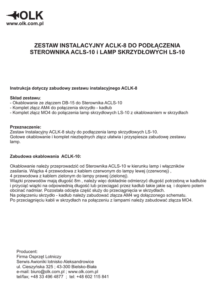OLK www.olk.com.pl ZESTAW INSTALACYJNY ACLK-8 DO POD£¥CZENIA STEROWNIKA ACLS-10 i LAMP SKRZYD£OWYCH LS-10 Instrukcja dotyczy zabudowy zestawu instalacyjnego ACLK-8 Sk³ad zestawu: - Okablowanie ze z³¹czem DB-15 do Sterownika ACLS-10 - Komplet z³¹cz AM4 do po³¹czenia skrzyd³o - kad³ub - Komplet z³¹cz MO4 do po³¹czenia lamp skrzyd³owych LS-10 z okablowaniem w skrzyd³ach Przeznaczenie: Zestaw Instalacyjny ACLK-8 s³u¿y do pod³¹czenia lamp skrzyd³owych LS-10. Gotowe okablowanie i komplet niezbêdnych z³¹cz u³atwia i przyspiesza zabudowê zestawu lamp. Zabudowa okablowania ACLK-10: Okablowanie nale¿y przeprowadziæ od Sterownika ACLS-10 w kierunku lamp i w³¹czników zasilania. Wi¹zka 4 przewodowa z kablem czerwonym do lampy lewej (czerwonej) , 4 przewodowa z kablem zielonym do lampy prawej (zielonej). Wi¹zki przewodów maj¹ d³ugoœæ 8m , nale¿y wiêc dok³adnie odmierzyæ d³ugoœæ potrzebn¹ w kad³ubie i przyci¹æ wi¹zki na odpowiedni¹ d³ugoœæ lub przeci¹gaæ przez kad³ub takie jakie s¹ i dopiero potem obcinaæ nadmiar. Pozosta³a odciêta czêœæ s³u¿y do przeci¹gniêcia w skrzyd³ach. Na po³¹czeniu skrzyd³o - kad³ub nale¿y zabudowaæ z³¹cza AM4 wg do³¹czonego schematu. Po przeci¹gniêciu kabli w skrzyd³ach na po³¹czeniu z lampami nale¿y zabudowaæ z³¹cza MO4. Producent: Firma Osprzêt Lotniczy Serwis Awioniki lotnisko Aleksandrowice ul. Cieszyñska 325 ; 43-300 Bielsko-Bia³a e-mail: [email protected] ; www.olk.com.pl tel/fax; +48 33 496 4877 ; tel: +48 602 115 841 OLK www.olk.com.pl ZESTAW INSTALACYJNY ACLK-8 DO POD£¥CZENIA STEROWNIKA ACLS-10 i LAMP SKRZYD£OWYCH LS-10 + 14,8 V zasilanie 1 Czerwony + 14,8 V zasilanie 9 2 Masa zasilania Czarny 10 Masa zasilania 3 Masa Nie pod³¹czony 8 ¯ó³ty Anoda ACL prawa 6 Katoda ACL prawa 7 Niebieski Bia³y Anoda ACL ogonowa 13 Fioletowy Katoda ACL ogonowa 14 Bia³y Anoda ACL ogonowa 11 Fioletowy Katoda ACL ogonowa 12 Niebieski Katoda ACL lewa 5 ¯ó³ty 4 Anoda ACL lewa Nie pod³¹czony 15 D M DB15 + 13V do œwiate³ ACL MASA + 13V do œwate³ pozycyjnych Czarny Pomarañczowy ACLS-10 Schemat elektryczny: Czarny ¯ó³ty Niebieski + POZYCYJ MASA ANODA ACL KATODA ACL M MO 4 1 2 3 4 D Z³¹cze skrzyd³o - lampa Czerwony Czarny ¯ó³ty Niebieski + POZYCYJ MASA ANODA ACL KATODA ACL M AM 4 Zielony Czerwony 1 Czarny 2 ¯ó³ty 3 Niebieski 4 D Czarny ¯ó³ty Niebieski + POZYCYJ MASA ANODA ACL KATODA ACL D AM 4 Z³¹cze kad³ub - skrzyd³o Z³¹cze kad³ub - skrzyd³o 1 4 2 3 3 4 1 2 Z³¹cze MO4M widok na ty³ od strony wchodz¹cych kabli 2 3 4 1 Z³¹cze MO4D widok na ty³ od strony wchodz¹cych kabli 1 2 3 4 M Z³¹cze AM4M widok na ty³ od strony wchodz¹cych kabli 1 2 3 4 Z³¹cze AM4D widok na ty³ od strony wchodz¹cych kabli Zielony Czarny ¯ó³ty Niebieski + POZYCYJ MASA ANODA ACL KATODA ACL D MO 4 Zielony 1 Czarny 2 ¯ó³ty 3 Niebieski 4 M Z³¹cze skrzyd³o - lampa Lampa zespolona skrzyd³owa prawa(zielona + ACL) LS-10 Czerwony LS-10 Lampa zespolona skrzyd³owa lewa (czerwona + ACL) Sterownik lamp ACL synchronizowanych OLK www.olk.com.pl ZESTAW INSTALACYJNY ACLK-8 DO POD£¥CZENIA STEROWNIKA ACLS-10 i LAMP SKRZYD£OWYCH LS-10 Czerwony Czarny Pomarañczowy + 13V do œwiate³ ACL MASA + 13V do œwate³ pozycyjnych L = 8m DO STEROWNIKA LAMP ACLS-10 Kable do œwiate³ skrzyd³owych LS-10 L = 8m 1 1 2 3 2 3 4 4 Z³¹cze AM4D widok na ty³ od strony wchodz¹cych kabli Z³¹cze AM4M widok na ty³ od strony wchodz¹cych kabli 3 4 4 3 1 2 2 1 Z³¹cze MO4M widok na ty³ od strony wchodz¹cych kabli Z³¹cze MO4D widok na ty³ od strony wchodz¹cych kabli Z³¹cze AM4 , Po³aczenie Kad³ub - Skrzyd³o dla kabli skrzyd³owych. Nale¿y montowaæ w miejscu po³aczenia skrzyd³a z kad³ubem. Z³¹cze MO4 Po³¹czenie lampy LS-10 przy koñcówce skrzyd³a z instalacj¹ w skrzydle.