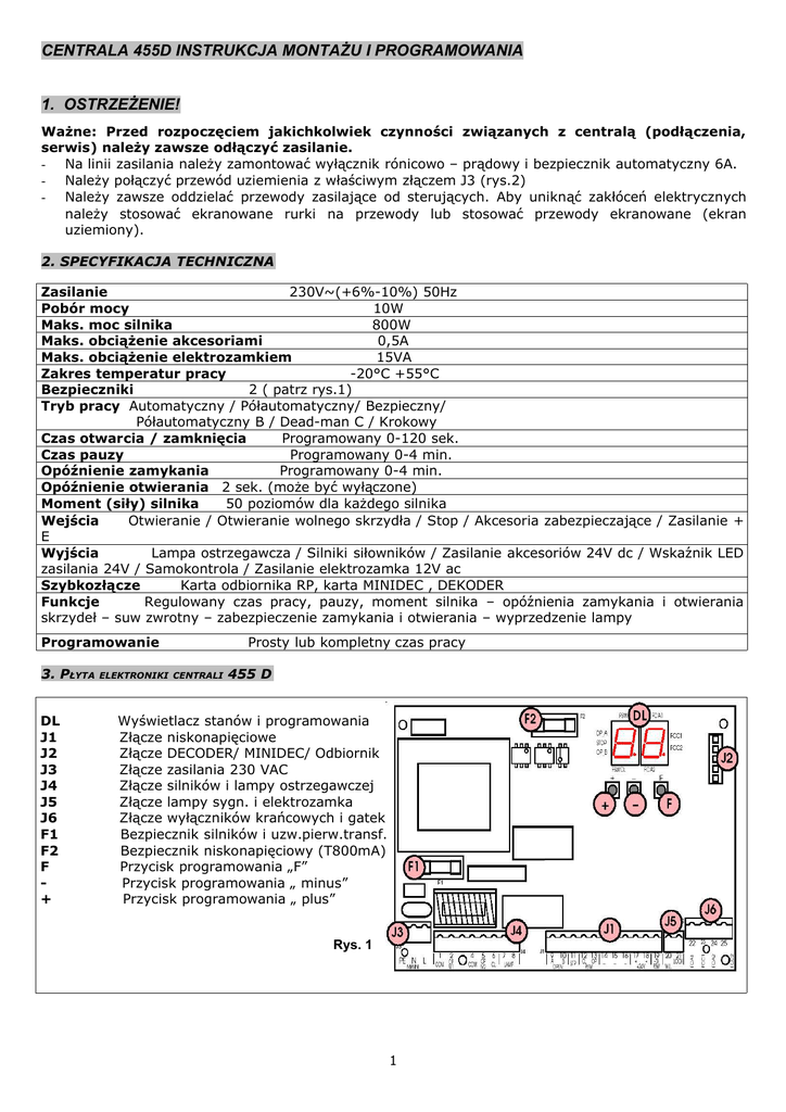 centrala 455d instrukcja montażu i programowania 1. ostrzeżenie!