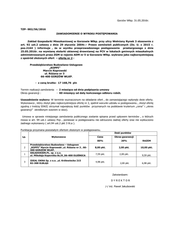 Gorzów Wlkp. 31.05.2016r. TZP- 002/56/2016 ZAWIADOMIENIE O WYNIKU POSTĘPOWANIA Zakład Gospodarki Mieszkaniowej w Gorzowie Wlkp. przy ulicy Wełniany Rynek 3 stosownie z art. 92 ust.2 ustawy z dnia 29 stycznia 2004r.– Prawo zamówień publicznych (Dz. U. z 2015 r. poz.2164 ) informuje , że w wyniku przeprowadzonego postępowania przetargowego z dnia 25.05.2016r. na wymianę stolarki okiennej drewnianej na PCV w lokalach gminnych mieszkalnych administrowanych przez ZGM w rejonie ADM nr 5 w Gorzowie Wlkp. wybrano jako najkorzystniejszą z spośród złożonych ofert – ofertę nr 2 : Przedsiębiorstwo Budowlano-Usługowe „KOPPI” Marcin Koprowski ul. Różana nr 3 66-400 GORZÓW WLKP. - z ceną brutto: 17 168,76 pln Termin realizacji zamówienia - 2 miesiące od dnia podpisania umowy Okres gwarancji : - 60 miesięcy od daty końcowego odbioru robót. Uzasadnienie wyboru: W terminie wyznaczonym na składanie ofert , do zamawiającego wpłynęły dwie oferty. Wykonawca , który złożył jako najkorzystniejsza ofertę nr 2, spełnił warunki udziału w postępowaniu , złożył ofertę zgodną z treścią SIWZ( otrzymał największą ilość punktów przyznanych na podstawie kryterium „cena” i „okres gwarancji” określonym wzorem w siwz). Umowa w sprawie niniejszego zamówienia publicznego zostanie spisana przed upływem terminów , o których mowa w art. 94 ust.1 ustawy Pzp , ponieważ w postępowaniu nie odrzucono żadnej oferty oraz nie wykluczono żadnego wykonawcy ( art.94 ust.2 pkt 3 lit.a ). Punktacja przyznana pozostałym ofertom złożonym w postępowaniu. Ilość punktów Lp. 2 1 3 Wykonawca Przedsiębiorstwo Budowlano – Usługowe „KOPPI” Marcin Koprowski ,ul. Różana nr 3 , 66400 GORZÓW WLKP. SKŁADOKIEN.PL. sp. z o.o. ul. Mikołaja Kopernika 8c/8 ,56-400 OLEŚNICA IDEAL OKNA Sp. z o.o. ,ul. Królewiecka 215 82-300 ELBLĄG Cena Okres gwarancji 80% 20% RAZEM 8,00 pkt. 2,00 pkt. 10,00 pkt. 7,59 pkt. 2,00 pkt. 4,98 pkt. 2,00 pkt. Zatwierdzam: DYREKTOR /-/ inż. Paweł Jakubowski 9,59 pkt. 6,98 pkt.