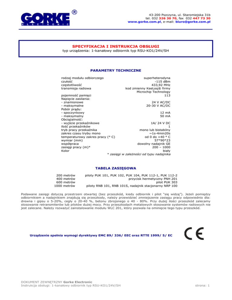 43-200 Pszczyna, ul. Staromiejska 31b tel. 032 326 30 70, fax 032 447 73 30 www.gorke.com.pl, e-mail: [email protected] SPECYFIKACJA I INSTRUKCJA OBSŁUGI typ urządzenia: 1-kanałowy odbiornik typ RSU-KO1/24V/SH PARAMETRY TECHNICZNE rodzaj modułu odbiorczego czułość częstotliwość transmisja radiowa superheterodyna -115 dBm 433,92 MHz kod zmienny KeeLoq® firmy Microchip Technology 113 pojemność pamięci Napięcie zasilania: - znamionowe 24 V AC/DC - maksymalne 20-30 V AC/DC Pobór prądu: - spoczynkowy 12 mA - maksymalny 50 mA Obciążalność: - wyjście przekaźnikowe 1A/ 24 V DC ilość przekaźników 1 tryb pracy przekaźnika mono lub bistabilny zakres czasu trybu mono ~1s-4min20s temperaturowy zakres pracy (° C) od 0 do +40 ° C wymiar (mm) 57*90*23 współpraca dowolny nadajnik GE zasięgi pracy (m)* 200 – 1000 Kolor biały * zasięgi w zależności od typu nadajnika TABELA ZASIĘGOWA 200 metrów 400 metrów 600 metrów 1000 metrów piloty PUK 101, PUK 102, PUK 104, PUK 112-1, PUK 112-2 przycisk hermetyczny PNH 201 pilot PUK 303 piloty RNB 101, RNB 101S, nadajnik stacjonarny NRP 100 Podawane zasięgi dotyczą przestrzeni otwartej (bez przeszkód, kiedy odbiornik i pilot “się widzą”). Jeżeli pomiędzy odbiornikiem a nadajnikiem znajdują się przeszkody, należy przewidzieć zmniejszenie zasięgu pracy odpowiednio dla: drewna i gipsu o 5-20%, cegły o 20-40 %, betonu zbrojonego o 40 - 80%. Przy dużej ilości przeszkód zalecamy stosowanie retransmiterów lub pilotów dużej mocy. Przy przeszkodach metalowych stosowanie systemów radiowych nie jest zalecane. Należy rozważyć zainstalowanie modułu WLC 201, który pozwala na ominięcie tego typu przeszkód. Urządzenie spełnia wymogi dyrektywy EMC 89/ 336/ EEC oraz RTTE 1999/ 5/ EC DOKUMENT ZEWNĘTRZNY Gorke Electronic Instrukcja obsługi: 1-kanałowy odbiornik typ RSU-KO1/24V/SH strona: 1 PRZEZNACZENIE ELEMENTÓW Dioda kontrola KANAŁU 1 (czerwona K1) - sygnalizuje stan załączenia przekaźnika 1 Dioda K2 (czerwona) - sygnalizuje czynności programowania Przycisk NAUKA - uruchamia procedury programowania Jumper PRACA/SERWIS - umożliwia odłączenie cewek przekaźników np. podczas czynności programowania urządzenia Warunki instalacji odbiornika. Odbiornik RSU-KO1/24V/SR wymaga dla instalacji miejsc suchych i zamkniętych. Może być instalowany w warunkach zakłóceń elektromagnetycznych, superheterodynowy moduł odbiorczy wykazuje znaczną odporność na te zakłócenia. Kod transmisji. Oparta na kodzie zmiennym (KeeLoq ® firmy Microchip Technology Inc. USA) transmisja radiowa zapewnia wysokie bezpieczeństwo użytkowania. Każda transmisja jest inna od poprzedniej. Warunkiem podstawowym zadziałania odbiornika jest wpisanie pilota do jego pamięci. Pilot może być zaprogramowany do nieograniczonej ilości odbiorników. „Zgubienie” 15 kolejnych transmisji (użycie pilota poza zasięgiem odbiornika) wymaga dwukrotnego przesłania sygnału (2x nacisnąć klawisz pilota). Zastosowanie. Odbiornik stosowany jest we wszelkiego typu zdalnym sterowaniu gdzie dostępne jest zasilanie 24V, najczęściej sterowanie pracą takich urządzeń jak bramy i szlabany. Częstotliwość. Odbiornik pracuje w oparciu o częstotliwość 433,92 MHz. Pasmo to w większości państw UE (i tu w Polsce) nie wymaga specjalnych zezwoleń i koncesji na użytkowanie. DOKUMENT ZEWNĘTRZNY Gorke Electronic Instrukcja obsługi: 1-kanałowy odbiornik typ RSU-KO1/24V/SH strona: 2 INSTRUKCJA OBSŁUGI UWAGA ! Wejście do trybu programowania jest możliwe TYLKO przy wyłączonym przekaźniku (dioda K1 nie świeci). Aby wyłączyć przekaźnik należy nacisnąć klawisz pilota lub chwilowo odłączyć napięcie zasilania odbiornika. 1. REJESTRACJA NOWEGO PILOTA a) naciśnij przycisk NAUKA na więcej niż 0,5s lecz mniej niż 4s - dioda K2 zaświeci się b) naciśnij klawisz pilota - dioda K2 zgaśnie c) naciśnij ponownie klawisz pilota - dioda K2 zaświeci się na 3s, po czym będzie pulsować i zgaśnie d) koniec rejestracji nowego pilota Gdy próba wpisania nowego pilota przebiegnie niepomyślnie dioda K2 mignie 1 raz i zgaśnie. Należy rozpocząć rejestrację od początku. Jeżeli pamięć odbiornika jest pełna (wpisano 113 pilotów) to wpisanie kolejnego, nowego pilota powoduje wykasowanie pilota wpisanego jako pierwszy. W przypadku większej jak 113 liczby użytkowników należy konfigurację modułu odbiorczego WLC 201 z odpowiednią ilością odbiorników wersji LC (dwóch dla 226 użytkowników, trzech dla 339 itd.) 2. USTAWIENIE TRYBU PRACY ODBIORNIKA Do ustawienia trybu pracy odbiornika potrzebny jest pilot, który został wcześniej wpisany do pamięci odbiornika - patrz pkt.1. Ustawienie fabryczne odbiornika – tryb bistabilny. tryb monostabilny (czasowy) - po wysłaniu transmisji z pilota przekaźnik odbiornika załączy się na ustawiony programowo czas Naciśnij przycisk NAUKA (dioda K2 zaświeci się) i trzymaj tak długo aż dioda K2 zacznie pulsować - wtedy należy zwolnić przycisk NAUKA. Po zwolnieniu przycisku NAUKA dioda K2 będzie świecić światłem ciągłym przez ok. 2s, a następnie wolno pulsować. Każde mrugnięcie diody odpowiada czasowi ~1s. Aby ustawić na przykład czas 20s należy odliczyć 20 mrugnięć diody K2 i nacisnąć klawisz pilota zatwierdzając długość czasu. Maksymalnie można ustawić czas na 260s (4min 20s). Jeżeli w trakcie pulsowania diody K2 (odliczania czasu) nie zostanie naciśnięty klawisz pilota, to po odliczeniu 260s dioda K2 będzie przez 1min świecić światłem ciągłym. Jeżeli w tym czasie (ciągłe świecenie diody) zostanie naciśnięty klawisz pilota (akceptacja) to odbiornik ustawi czas maksymalny tj. około 260s. Natomiast jeżeli w tym czasie klawisz pilota NIE zostanie naciśniety to odbiornik wyjdzie z trybu programowania i zachowa poprzednie ustawienie. tryb bistabilny (załącz -wyłącz) – odebranie transmisji z pilota zmienia stan przekaźnika na prz