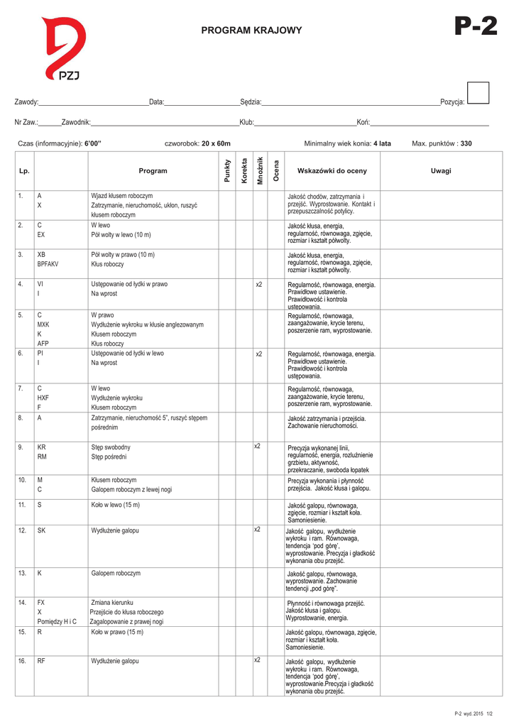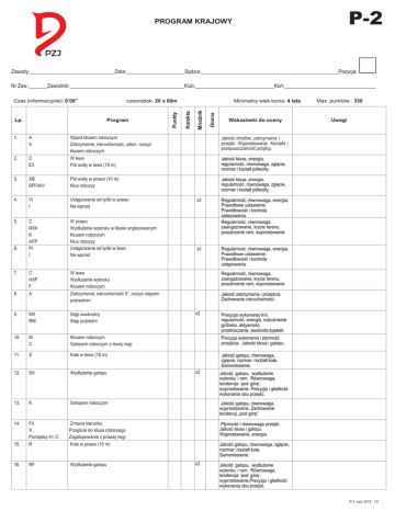 P-2 PROGRAM KRAJOWY Zawody: Sędzia: Zawodnik: A X 2. Ocena Program Minimalny wiek konia: 4 lata Mnożnik Lp. Koń: czworobok: 20 x 60m Korekta Czas (informacyjnie): 6’00” 1. Pozycja: Klub: Punkty Nr Zaw.: Data: Wskazówki do oceny Jakość chodów, zatrzymania i przejść. Wyprostowanie. Kontakt i przepuszczalność potylicy. C EX Wjazd kłusem roboczym Zatrzymanie, nieruchomość, ukłon, ruszyć kłusem roboczym W lewo Pół wolty w lewo (10 m) 3. XB BPFAKV Pół wolty w prawo (10 m) Kłus roboczy Jakość kłusa, energia, regularność, równowaga, zgięcie, rozmiar i kształt półwolty. 4. VI I Ustępowanie od łydki w prawo Na wprost 5. C MXK K AFP PI I W prawo Wydłużenie wykroku w kłusie anglezowanym Kłusem roboczym Kłus roboczy Ustępowanie od łydki w lewo Na wprost C HXF F A W lewo Wydłużenie wykroku Kłusem roboczym Zatrzymanie, nieruchomość 5”, ruszyć stępem pośrednim 9. KR RM Stęp swobodny Stęp pośredni 10. M C Kłusem roboczym Galopem roboczym z lewej nogi Precyzja wykonania i płynność przejścia. Jakość kłusa i galopu. 11. S Koło w lewo (15 m) Jakość galopu, równowaga, zgięcie, rozmiar i kształt koła. Samoniesienie. 12. SK Wydłużenie galopu 13. K Galopem roboczym Jakość galopu, równowaga, wyprostowanie. Zachowanie tendencji „pod górę”. 14. Zmiana kierunku Przejście do kłusa roboczego Zagalopowanie z prawej nogi Koło w prawo (15 m) Płynność i równowaga przejść. Jakość kłusa i galopu. Wyprostowanie, energia. 15. FX X Pomiędzy H i C R 16. RF Wydłużenie galopu 6. 7. 8. Max. punktów : 330 Uwagi Jakość kłusa, energia, regularność, równowaga, zgięcie, rozmiar i kształt półwolty. x2 Regularność, równowaga, energia. Prawidłowe ustawienie. Prawidłowość i kontrola ustępowania. Regularność, równowaga, zaangażowanie, krycie terenu, poszerzenie ram, wyprostowanie. x2 Regularność, równowaga, energia. Prawidłowe ustawienie. Prawidłowość i kontrola ustępowania. Regularność, równowaga, zaangażowanie, krycie terenu, poszerzenie ram, wyprostowanie. Jakość zatrzymania i przejścia. Zachowanie nieruchomości. x2 x2 Precyzja wykonanej linii, regularność, energia, rozluźnienie grzbietu, aktywność, przekraczanie, swoboda łopatek Jakość galopu, wydłużenie wykroku i ram. Równowaga, tendencja ‘pod górę’, wyprostowanie. Precyzja i gładkość wykonania obu przejść. Jakość galopu, równowaga, zgięcie, rozmiar i kształt koła. Samoniesienie. x2 Jakość galopu, wydłużenie wykroku i ram. Równowaga, tendencja ‘pod górę’, wyprostowanie.Precyzja i gładkość wykonania obu przejść. P-2 wyd. 2015 1/2 17. F Galopem roboczym Jakość galopu, równowaga, wyprostowanie. Zachowanie tendencji „pod górę”. 18. KXM Przed M Zmiana kierunku Przejście do kłusa Płynność i równowaga przejścia. Jakość kłusa i galopu. Wyprostowanie, energia. 19 MCE Kłus roboczy Jakość kłusa, energia, równowaga, wyprostowanie. 20. E Przed E E Koło w lewo kłusem anglezowanym, stopniowe obniżenie i wydłużenie szyi (tzw. żucie z ręki) Stopniowe nabranie wodzy Kłusem roboczym na wprost A X Na linię środkową Zatrzymanie, nieruchomość, ukłon 21. x2 Zgięcie, rozmiar i kształt koła, równowaga, rozluźnienie. Podążanie za wędzidłem. Stopniowe rozciągnięcie szyi do przodu i w dół. Nabranie wodzy bez oporu. Jakość kłusa, wyprostowanie i równowaga w zatrzymaniu, kontakt i przepuszczalność potylicy. Opuścić czworobok stępem na długiej wodzy w A Oceny Ogólne Chody (swoboda i regularność) Impuls (dążność do ruchu naprzód, elastyczność kroków, rozluźnienie grzbietu, zaangażowanie zadu) Posłuszeństwo (uwaga i zaufanie, harmonia, lekkość i łatwość wykonania, wyprostowanie, przyjęcie kiełzna i lekkość przodu) x2 Postawa i dosiad jeźdźca; poprawność i skuteczność pomocy x2 Błędy w przebiegu lub wykonaniu programu: 1-sza pomyłka - 2 pkt. 2-ga pomyłka - 4 pkt. 3-cia pomyłka - eliminacja Ogólne uwagi: Inne błędy (2 pkt): - wjazd z batem w obszar wokół czworoboku lub - wjazd z batem na czworobok lub - nie wjechanie na czworobok w ciągu 45 sekund po sygnale lub - wjazd na czworobok przed sygnałem Wynik końcowy [%] Organizator (adres) Podpis Sędziego: WYDANIE PZJ 2015 P-2 wyd. 2015 2/2