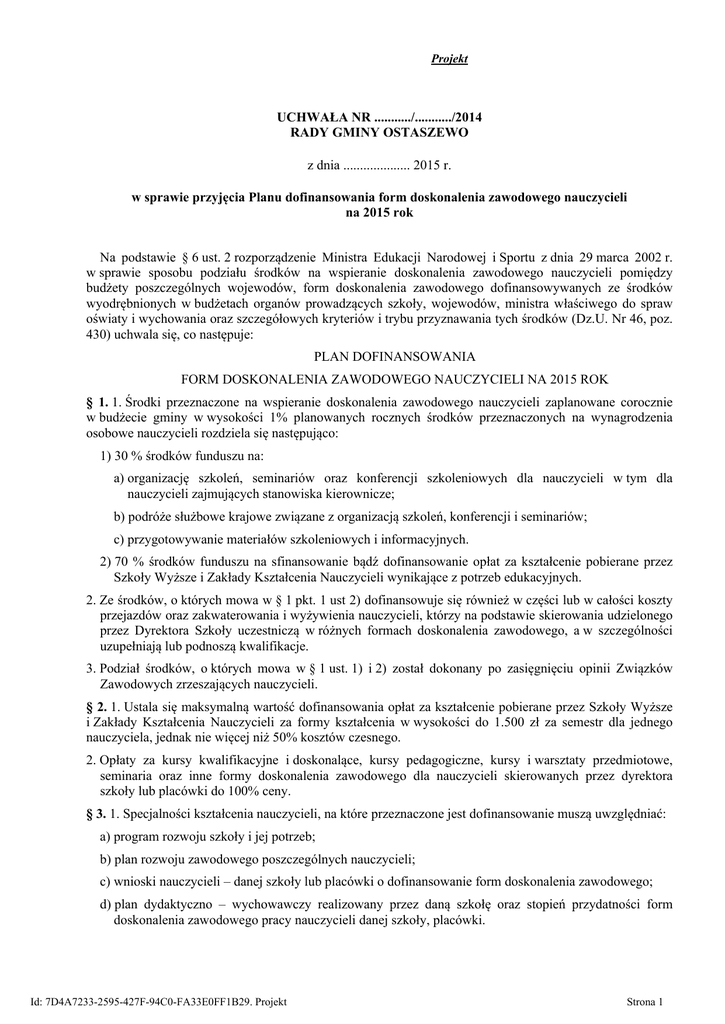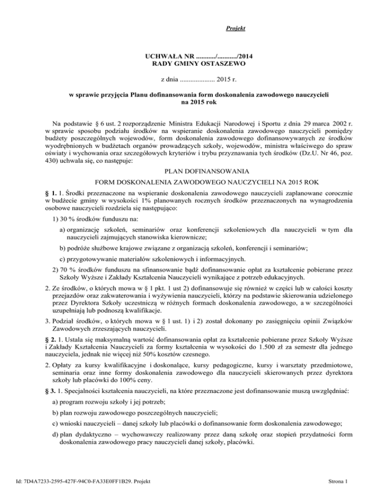 Projekt UCHWAŁA NR .........../.........../2014 RADY GMINY OSTASZEWO z dnia .................... 2015 r. w sprawie przyjęcia Planu dofinansowania form doskonalenia zawodowego nauczycieli na 2015 rok Na podstawie § 6 ust. 2 rozporządzenie Ministra Edukacji Narodowej i Sportu z dnia 29 marca 2002 r. w sprawie sposobu podziału środków na wspieranie doskonalenia zawodowego nauczycieli pomiędzy budżety poszczególnych wojewodów, form doskonalenia zawodowego dofinansowywanych ze środków wyodrębnionych w budżetach organów prowadzących szkoły, wojewodów, ministra właściwego do spraw oświaty i wychowania oraz szczegółowych kryteriów i trybu przyznawania tych środków (Dz.U. Nr 46, poz. 430) uchwala się, co następuje: PLAN DOFINANSOWANIA FORM DOSKONALENIA ZAWODOWEGO NAUCZYCIELI NA 2015 ROK § 1. 1. Środki przeznaczone na wspieranie doskonalenia zawodowego nauczycieli zaplanowane corocznie w budżecie gminy w wysokości 1% planowanych rocznych środków przeznaczonych na wynagrodzenia osobowe nauczycieli rozdziela się następująco: 1) 30 % środków funduszu na: a) organizację szkoleń, seminariów oraz konferencji szkoleniowych dla nauczycieli w tym dla nauczycieli zajmujących stanowiska kierownicze; b) podróże służbowe krajowe związane z organizacją szkoleń, konferencji i seminariów; c) przygotowywanie materiałów szkoleniowych i informacyjnych. 2) 70 % środków funduszu na sfinansowanie bądź dofinansowanie opłat za kształcenie pobierane przez Szkoły Wyższe i Zakłady Kształcenia Nauczycieli wynikające z potrzeb edukacyjnych. 2. Ze środków, o których mowa w § 1 pkt. 1 ust 2) dofinansowuje się również w części lub w całości koszty przejazdów oraz zakwaterowania i wyżywienia nauczycieli, którzy na podstawie skierowania udzielonego przez Dyrektora Szkoły uczestniczą w różnych formach doskonalenia zawodowego, a w szczególności uzupełniają lub podnoszą kwalifikacje. 3. Podział środków, o których mowa w § 1 ust. 1) i 2) został dokonany po zasięgnięciu opinii Związków Zawodowych zrzeszających nauczycieli. § 2. 1. Ustala się maksymalną wartość dofinansowania opłat za kształcenie pobierane przez Szkoły Wyższe i Zakłady Kształcenia Nauczycieli za formy kształcenia w wysokości do 1.500 zł za semestr dla jednego nauczyciela, jednak nie więcej niż 50% kosztów czesnego. 2. Opłaty za kursy kwalifikacyjne i doskonalące, kursy pedagogiczne, kursy i warsztaty przedmiotowe, seminaria oraz inne formy doskonalenia zawodowego dla nauczycieli skierowanych przez dyrektora szkoły lub placówki do 100% ceny. § 3. 1. Specjalności kształcenia nauczycieli, na które przeznaczone jest dofinansowanie muszą uwzględniać: a) program rozwoju szkoły i jej potrzeb; b) plan rozwoju zawodowego poszczególnych nauczycieli; c) wnioski nauczycieli – danej szkoły lub placówki o dofinansowanie form doskonalenia zawodowego; d) plan dydaktyczno – wychowawczy realizowany przez daną szkołę oraz stopień przydatności form doskonalenia zawodowego pracy nauczycieli danej szkoły, placówki. Id: 7D4A7233-2595-427F-94C0-FA33E0FF1B29. Projekt Strona 1 2. Specjalności na które przeznaczone jest dofinansowanie to: a) biologia; b) chemia; c) matematyka; d) technika; e) plastyka; f) bibliotekoznawstwo; g) psychologia; h) edukacja dla bezpieczeństwa; i) pedagogika; j) oligofrenopedagogika; k) muzyka; l) logopedia; m) filologia germańska; n) fizyka o) informatyka 3. Formy kształcenia, na które przeznaczone jest dofinansowanie to: a) studia wyższe zawodowe (licencjat); b) studia magisterskie uzupełniające; c) studia magisterskie; d) studia podyplomowe; e) kursy kwalifikacyjne; f) kursy doskonalące; g) seminaria i warsztaty. § 4. 1. Wnioski nauczycieli o dofinansowanie form doskonalenia zawodowego wraz z niezbędnymi dokumentami składane są do Dyrektora Zespołu Szkół w Ostaszewie. 2. Termin składania wniosków oraz tryb ich rozpatrywania ustala Dyrektor Zespołu Szkół w odrębnym regulaminie. § 5. Uchwała wchodzi w życie z dniem podjęcia1. Przewodniczący Rady Wojciech Wycichowski 1] Niniejsza uchwała była poprzedzona uchwałą nr XXXIV/198/2014 Rady Gminy Ostaszewo z dnia 26 lutego 2014 r. w sprawie przyjęcia Planu dofinansowania form doskonalenia zawodowego nauczycieli na 2014 rok. Id: 7D4A7233-2595-427F-94C0-FA33E0FF1B29. Projekt Strona 2 UZASADNIENIE Zgodnie z zapisem art. 70 a ust. 1 ustawy Karta Nauczyciela (Dz.U. z 2006 r., Nr 97 poz. 674 z późniejszymi zmianami) w budżetach organów prowadzących szkoły wyodrębnia się środki na dofinansowanie doskonalenia zawodowego nauczycieli z uwzględnieniem doradztwa metodycznego – w wysokości 1 % planowanych rocznych środków przeznaczonych na wynagrodzenia osobowe nauczycieli. W myśl § 6 ust.2 rozporządzenia Ministra Edukacji Narodowej i Sportu z dnia 29 marca 2002 r. w sprawie podziału środków na wspieranie doskonalenia zawodowego nauczycieli pomiędzy budżety poszczególnych wojewodów, form doskonalenia zawodowego dofinansowywanych ze środków wyodrębnionych w budżetach organów prowadzących szkoły, wojewodów, ministra właściwego do spraw oświaty i wychowania oraz szczegółowych kryteriów i trybu przyznawania tych środków organ prowadzący opracowuje na każdy rok budżetowy plan dofinansowania form doskonalenia nauczycieli biorąc pod uwagę wnioski dyrektorów szkół i placówek przygotowane z uwzględnieniem wieloletnich planów doskonalenia nauczycieli, opracowanych przez dyrektorów szkół i placówek. Kompetencje organu prowadzącego w tym zakresie wykonuje Rada Gminy Ostaszewo, stąd zachodzi konieczność podjęcia uchwały w brzmieniu j.w. Id: 7D4A7233-2595-427F-94C0-FA33E0FF1B29. Projekt Strona 1
