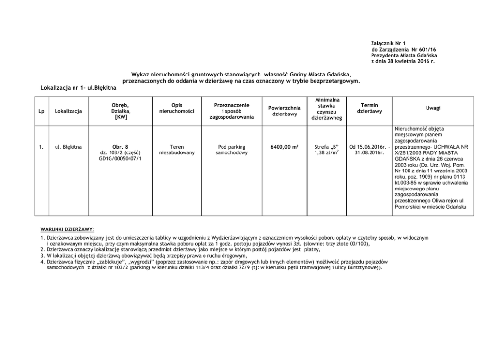 Załącznik Nr 1 do Zarządzenia Nr 601/16 Prezydenta Miasta Gdańska z dnia 28 kwietnia 2016 r. Wykaz nieruchomości gruntowych stanowiących własność Gminy Miasta Gdańska, przeznaczonych do oddania w dzierżawę na czas oznaczony w trybie bezprzetargowym. Lokalizacja nr 1- ul.Błękitna Lp 1. Lokalizacja ul. Błękitna WARUNKI DZIERŻAWY: Obręb, Działka, [KW] Obr. 8 dz. 103/2 (część) GD1G/00050407/1 Opis nieruchomości Teren niezabudowany Przeznaczenie i sposób zagospodarowania Pod parking samochodowy Powierzchnia dzierżawy 6400,00 m² Minimalna stawka czynszu dzierżawneg Strefa o „B” 1,38 ozł/m2 za 1 m² netto Termin dzierżawy Uwagi Nieruchomość objęta miejscowym planem zagospodarowania Od 15.06.2016r. - przestrzennego- UCHWAŁA NR 31.08.2016r. X/251/2003 RADY MIASTA GDAŃSKA z dnia 26 czerwca 2003 roku (Dz. Urz. Woj. Pom. Nr 106 z dnia 11 września 2003 roku, poz. 1909) nr planu 0113 kt.003-85 w sprawie uchwalenia miejscowego planu zagospodarowania przestrzennego Oliwa rejon ul. Pomorskiej w mieście Gdańsku w sprawie uchwalenia 1. Dzierżawca zobowiązany jest do umieszczenia tablicy w uzgodnieniu z Wydzierżawiającym z oznaczeniem wysokości poboru opłaty w czytelny sposób,miejscowego w widocznym planu zagospodarowania i oznakowanym miejscu, przy czym maksymalna stawka poboru opłat za 1 godz. postoju pojazdów wynosi 3zł. (słownie: trzy złote 00/100), przestrzennego Oliwa rejon 2. Dzierżawca oznaczy lokalizację stanowiącą przedmiot dzierżawy jako miejsce w którym postój pojazdów jest płatny, ulicy Pomorskiej w mieście 3. W lokalizacji objętej dzierżawą obowiązywać będą przepisy prawa o ruchu drogowym, 4. Dzierżawca fizycznie „zablokuje”, „wygrodzi” (poprzez zastosowanie np.: zapór drogowych lub innych elementów) możliwość przejazdu pojazdów Gdańsku samochodowych z działki nr 103/2 (parking) w kierunku działki 113/4 oraz działki 72/9 (tj: w kierunku pętli tramwajowej i ulicy Bursztynowej). Lokalizacja nr 2 – ul. Kapliczna Lp Lokalizacja Obręb, Działka, [KW] Opis nieruchomości Przeznaczenie i sposób zagospodarowania Powierzchnia dzierżawy obr. 8 Minimalna stawka czynszu dzierżawnego o za 1 m² netto dz.267 (część) GD1G/00046653/9 1. ul. Kapliczna obr.8 dz. 195/4 (część) GD1G/00046653/9 Teren niezabudowany Pod parking samochodowy Łącznie powierzchnia : 1420,00 m² Strefa Turystyczna 1,81 zł/m2 Termin dzierżawy Uwagi Nieruchomość objęta miejscowym planem zagospodarowania przestrzennego-uchwała nr VIII/178/2003 z 24.04.2003 DZ.U. woj. pomorskiego nr 88 poz.1526 z 16.07.2003r. nr planu 0108 kt 018-85 dla działki 267 w sprawie Od 15.06.2016r. - uchwalenia miejscowego planu uchwała nr VIII/178/2003 z 31.08.2016r. zagospodarowania 24.04.2003 DZ.U. woj. przestrzennego rejon pomorskiego 88 poz.1526 z ul.Bałtyckiej nr w mieście 16.07.2003r. nr planu 0108 kt 019-81 dla działki 195/4 w sprawie uchwalenia miejscowego planu zagospodarowania przestrzennego rejon rejon ul.Bałtyckiej w mieście Gdańsku WARUNKI DZIERŻAWY: 1. Dzierżawca zobowiązany jest do umieszczenia tablicy w uzgodnieniu z Wydzierżawiającym z oznaczeniem wysokości poboru opłaty w czytelny sposób w widocznym i oznakowanym miejscu, przy czym maksymalna stawka poboru opłat za 1 godz. postoju pojazdów wynosi 3zł. (słownie: trzy złote 00/100), 2. Dzierżawca oznaczy lokalizację stanowiącą przedmiot dzierżawy jako miejsce w którym postój pojazdów jest płatny, zagospodarowania 3. W lokalizacji objętej dzierżawą obowiązywać będą przepisy prawa o ruchu drogowym, zagospodarowania zagospodarowania przestrzennego zagospodarowania przestrzennego rejon Lokalizacja nr 3 – ul. Czarny Dwór Lp Lokalizacja Obręb, Działka, [KW] Opis nieruchomości Przeznaczenie i sposób zagospodarowania Powierzchnia dzierżawy obr. 22 dz.26/5 (część) GD1G/00052394/0 ul. Czarny Dwór 1. obr.22 dz. 29/1 (część) GD1G/00050174/8 Teren niezabudowany Pod parking samochodowy Łącznie powierzchnia : 7400 m2 Minimalna stawka czynszu dzierżawnego o za 1 m² netto Strefa Turystyczna 1,81 zł/m2 Termin dzierżawy Uwagi Nieruchomość objęta miejscowym planem zagospodarowania przestrzennego-uchwała nr LVI/1905/2006 z 26.10.2006 DZ.U. woj. pomorskiego nr 35 poz.505 z 09.02.2007r. nr planu 0125 kt 003-KS (dla działki nr 26/5) w sprawie uchwalenia miejscowego planu zagospodarowania przestrzennego Pasa Nadmorskiego rejon ulic Czarny Dwór, Hallera w mieście Gdańsku Od 15.06.2016r. dla działki 29/1 –uchwała Nr 31.08.2016r. XXXIX/865/13 z 25.06.2013r. DZ.U. woj. pomorskiego z 30.07.2013r. poz.3051 nr planu 0126 kt. 017-KS w sprawie uchwalenia miejscowego planu zagospodarowania przestrzennego pas nadmorski rejon ciągu pieszego na przedłużeniu Al. Jana Pawła II w mieście Gdańsku, WARUNKI DZIERŻAWY: 1. Dzierżawca zobowiązany jest do umieszczenia tablicy w uzgodnieniu z Wydzierżawiającym z oznaczeniem wysokości poboru opłaty w czytelny sposób w widocznym i oznakowanym miejscu, przy czym maksymalna stawka poboru opłat za 1 godz. postoju pojazdów wynosi 3zł. (słownie: trzy złote 00/100), 2. Dzierżawca oznaczy lokalizację stanowiącą przedmiot dzierżawy jako miejsce w którym postój pojazdów jest płatny, 3. W lokalizacji objętej dzierżawą obowiązywać będą przepisy prawa o ruchu drogowym, 4. Wyklucza się możliwość poboru opłat i postoju pojazdów z terenu dróg manewrowych położonych w obrębie parkingu oraz nakazuje się utrzymanie komunikacji kołowej (dla pojazdów o gabarytach pojazdu dostawczego) pomiędzy terenem parkingu a ciągiem pieszo - jezdnym prowadzącym w kierunku mola. 5. Wyklucza się możliwość poboru opłat dla pojazdów korzystających z parkingu w terminie organizowanej staraniem MOSiR imprezy sportowej pod nazwą Triatlonu Gdańsk tj. w dniach 15-17.07.2016r. 6. Dzierżawca zobowiązany będzie do umieszczenia dwóch toalet typu TOY, TOY wraz z ponoszeniem kosztów ich obsługi, Lokalizacj