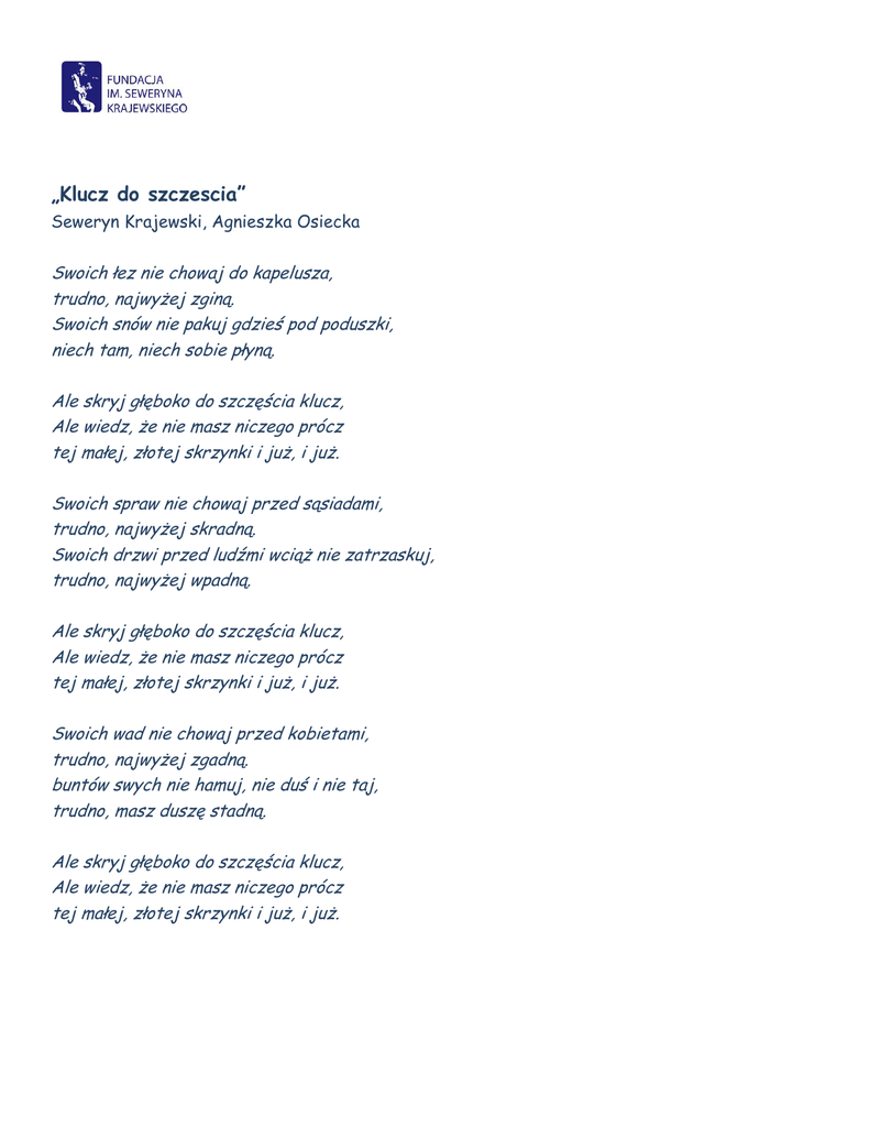„Klucz do szczescia” Seweryn Krajewski, Agnieszka Osiecka Swoich łez nie chowaj do kapelusza, trudno, najwyżej zginą. Swoich snów nie pakuj gdzieś pod poduszki, niech tam, niech sobie płyną. Ale skryj głęboko do szczęścia klucz, Ale wiedz, że nie masz niczego prócz tej małej, złotej skrzynki i już, i już. Swoich spraw nie chowaj przed sąsiadami, trudno, najwyżej skradną. Swoich drzwi przed ludźmi wciąż nie zatrzaskuj, trudno, najwyżej wpadną. Ale skryj głęboko do szczęścia klucz, Ale wiedz, że nie masz niczego prócz tej małej, złotej skrzynki i już, i już. Swoich wad nie chowaj przed kobietami, trudno, najwyżej zgadną. buntów swych nie hamuj, nie duś i nie taj, trudno, masz duszę stadną. Ale skryj głęboko do szczęścia klucz, Ale wiedz, że nie masz niczego prócz tej małej, złotej skrzynki i już, i już.