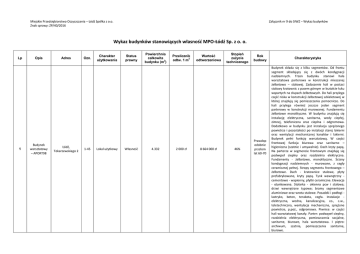 Miejskie Przedsiębiorstwo Oczyszczania – Łódź Spółka z o.o. Znak sprawy: ZP/40/2016 Załącznik nr 9 do SIWZ – Wykaz budynków Wykaz budynków stanowiących własność MPO-Łódź Sp. z o. o. Lp 1 Opis Budynek warsztatowy – APORT98 Adres Łódź, Tokarzewskiego 2 Ozn. 1-45 Charakter użytkowania Lokal użytkowy Status prawny Własność Powierchnia całkowita budynku (m2) 4.332 Przelicznik odtw. 1 m2 2 000 zł Wartość odtworzeniowa 8 664 000 zł Stopień zużycia technicznego 46% Rok budowy Prawdop odobnie przełom lat 60-70 Charakterystyka Budynek składa się z kilku segmentów. Od frontu segment składający się z dwóch kondygnacji nadziemnych. Trzon budynku stanowi hala warsztatowa parterowa w konstrukcji mieszanej żelbetowo – stalowej. Zadaszenie hali w postaci stalowy kratownic z pasem górnym w kształcie łuku wspartych na słupach żelbetowych. Do hali przylega część niska w konstrukcji żelbetowej szkieletowej w której znajdują się pomieszczenia pomocnicze. Do hali przylega również jeszcze jeden segment parterowy w konstrukcji murowanej. Fundamentu żelbetowe monolityczne. W budynku znajdują się instalację elektryczna, sanitarna, wody ciepłej, zimnej, telefoniczna oraz cieplna i odgromowa. Dodatkowo w budynku jest instalacja sprężonego powietrza i pozostałości po instalacji starej lakierni oraz wentylacji mechanicznej kanałów i lakierni. Budynek pełni funkcję warsztatową. W części frontowej funkcja biurowa oraz sanitarno – higieniczna (szatnie i umywalnie). Dach kryty papą. Na parterze w segmencie frontowym znajduję się podwęzeł cieplny oraz rozdzielnia elektryczna. Fundamenty - żelbetowe, monolityczne. Ściany kondygnacji nadziemnych - murowane, z cegły ceramicznej pełnej. Stropy segmentu frontowego – żelbetowe. Dach - kratownice stalowe, płyty prefabrykowane, kryty papą. Tynk wewnętrzny cementowo - wapienny, płytki ceramiczne. Elewacja - otynkowana. Stolarka - okienna pcw i stalowa; drzwi wewnętrzne typowe; bramy segmentowe aluminiowe oraz wrota stalowe. Posadzki i podłogi lastryko, beton, terakota, cegła. Instalacje elektryczna, wodna, kanalizacyjna, co., c.w., teletechniczna, wentylacja mechaniczna, sprężone powietrze, p.poż., odgromowa. Piwnice: w części hali warsztatowej kanały. Parter: podwęzeł cieplny, rozdzielnia elektryczna, pomieszczenia socjalne, sanitarne, biurowe, hala warsztatowa. I piętro: archiwum, szatnia, pomieszczenia sanitarne, biurowe. Miejskie Przedsiębiorstwo Oczyszczania – Łódź Spółka z o.o. Znak sprawy: ZP/40/2016 2 3 Budynek warsztatowy APORT98 Budynek socjalnodyspozytorski - APORT98 Łódź, Tokarzewskiego 2 Łódź, Tokarzewskiego 2 1-47 Garaż 1-48 Administracyjno -Biurowy Załącznik nr 9 do SIWZ – Wykaz budynków Własność Własność 6.444 1.155 700 zł 3 600 zł 4 510 800 zł 4 158 000 zł 45% 40% Prawdop odobnie przełom lat 60-70 Prawdop odobnie przełom lat 60-70 Budynek składa się z kilku segmentów. Od frontu segment składający się z dwóch kondygnacji nadziemnych. Trzon budynku stanowi hala warsztatowa parterowa w konstrukcji mieszanej żelbetowo – stalowej. Zadaszenie hali w postaci stalowy kratownic z pasem górnym w kształcie łuku wspartych na słupach żelbetowych. Do hali przylega część niska w konstrukcji żelbetowej szkieletowej w której znajdują się pomieszczenia pomocnicze. Do hali przylega również jeszcze jeden segment parterowy w konstrukcji murowanej. Fundamentu żelbetowe monolityczne. W budynku znajdują się instalację elektryczna, sanitarna, wody ciepłej, zimnej, telefoniczna oraz cieplna i odgromowa. Dodatkowo w budynku jest instalacja sprężonego powietrza i pozostałości po instalacji starej lakierni oraz wentylacji mechanicznej kanałów i lakierni. Budynek pełni funkcję warsztatową. W części frontowej funkcja biurowa oraz sanitarno – higieniczna (szatnie i umywalnie). Dach kryty papą. Na parterze w segmencie frontowym znajduję się podwęzeł cieplny oraz rozdzielnia elektryczna. Fundamenty - żelbetowe, monolityczne. Ściany kondygnacji nadziemnych - murowane, z cegły ceramicznej pełnej. Stropy segmentu frontowego – żelbetowe. Dach - kratownice stalowe, płyty prefabrykowane, kryty papą. Tynk wewnętrzny cementowo - wapienny, płytki ceramiczne. Elewacja - otynkowana. Stolarka - okienna pcw i stalowa; drzwi wewnętrzne typowe; bramy segmentowe aluminiowe oraz wrota stalowe. Posadzki i podłogi lastryko, beton, terakota, cegła. Instalacje elektryczna, wodna, kanalizacyjna, co., c.w., teletechniczna, wentylacja mechaniczna, sprężone powietrze, p.poż., odgromowa. Piwnice: w części hali warsztatowej kanały. Parter: podwęzeł cieplny, rozdzielnia elektryczna, pomieszczenia socjalne, sanitarne, biurowe, hala warsztatowa. I piętro: archiwum, szatnia, pomieszczenia sanitarne, biurowe. Budynek niepodpiwniczony z dwoma kondygnacjami nadziemnymi. Fundament betonowe i żelbetowe. Stropy gęstożebrowe, stropodach płaski gęstożebrowy kryty papą. Budynek pełni funkcję sanitarno – higieniczną oraz biurową. W budynku znajdują się instalację Miejskie Przedsiębiorstwo Oczyszczania – Łódź Spółka z o.o. Znak sprawy: ZP/40/2016 4 5 Zadaszenie dystrybutoró w - APORT98 Magazyn części zamiennych APORT98 Łódź, Tokarzewskiego 2 Łódź, Tokarzewskiego 2 1-49 1-5 Lokal użytkowy Lokal użytkowy Załącznik nr 9 do SIWZ – Wykaz budynków Własność Własność 67,5 924 700 zł 1 400 zł 47 250 zł 1 293 600 zł 46% 46% Prawdop odobnie przełom lat 60-70 Prawdop odobnie w latach 20. elektryczna, sanitarna, wody ciepłej, zimnej, telefoniczna oraz cieplna. Na parterze zlokalizowany jest podwęzeł cieplny. W części gdzie jest szatnia dodatkowo znajduję się instalacja wentylacji mechanicznej. Fundamenty - betonowe i żelbetowe. Ściany kondygnacji nadziemnych - murowane, z cegły ceramicznej pełnej. Strop - gęstożebrowy DZ-3 Schody - żelbetowe, monolityczne. Dach stropodach gęstoże