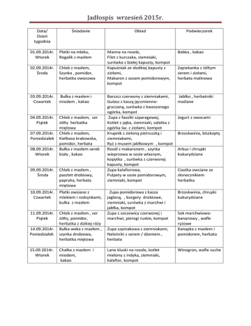 Jadłospis wrzesień 2015r. Data/ Dzień tygodnia Śniadanie 01.09.2014r. Wtorek Płatki na mleku, Rogalik z masłem 02.09.2014r. Środa Chleb z masłem, Szynka , pomidor, herbatka owocowa 03.09.2014r. Czwartek Bułka z masłem i miodem , kakao 04.09.2014r. Piątek Chleb z masłem, ser żółty herbatka miętowa Chleb z masłem, Kiełbasa krakowska, pomidor, herbata Bułka z masłem serek biały , kakao 07.09.2014r. Poniedziałek 08.09.2014r. Wtorek 09.09.2014r. Środa Chleb z masłem , pasztet drobiowy, papryka, herbata miętowa 10.09.2014r. Czwartek Płatki owsiane z mlekiem i rodzynkami, bułka z masłem 11.09.2014r. Piątek Chleb z masłem , ser żółty, pomidor, herbatka z dzikiej róży Bułka weka z masłem , szynka drobiowa, herbatka miętowa 14.09.2014r. Poniedziałek 15.09.2014r. Wtorek Chałka z masłem i miodem, kakao Obiad Podwieczorek Manna na rosole, Filet z kurczaka, ziemniaki, surówka z białej kapusty, kompot Kapuśniak ze słodkiej kapusty z ziołami, Makaron z sosem pomidorowym, kompot Babka , kakao Barszcz czerwony z ziemniakami, Gulasz z kaszą jęczmiennogryczaną, surówka z kwaszonego ogórka, kompot Zupa z fasolki szparagowej, Kotlet z jajka, ziemniaki, sałatka z ogórka św. z ziołami, kompot Krupnik z zieloną pietruszką i ziemniakami, Ryż z musem jabłkowym , kompot Rosół z makaronem , szynka wieprzowa w sosie własnym, kopytka , surówka z czerwonej kapusty, kompot Zupa kalafiorowa, Pulpety w sosie pomidorowym, ziemniaki, kompot Jabłko , herbatniki maślane Zupa pomidorowa z kasza jaglaną, , burgery drobiowe, ziemniaki, surówka z marchwi i jabłka, kompot Zupa z soczewicy czerwonej i marchwi, pierogi ruskie, kompot Brzoskwinia, chrupki kukurydziane Zupa szpinakowa z ziemniakami, Naleśniki z serem / dżemem , herbata Lane kluski na rosole, kotlet mielony z indyka, ziemniaki, kalafior, kompot Zapiekanka z żółtym serem i ziołami, herbata malinowa Jogurt z owocami Brzoskwinia, biszkopty Arbuz i chrupki kukurydziane Ciastka owsiane ze słonecznikiem herbatka Sok marchwiowobananowy , wafle ryżowe Kanapka z masłem i pomidorem, herbata Winogron, wafle suche Jadłospis wrzesień 2015r. 16.09.2014r. Chleb z masłem parówka Środa drobiowa z keczupem, herbatka Barszcz biały z jajkiem , Makaron z serem Placek drożdżowy ze śliwkami, kakao 17.09.2014r. Płatki zbożowe z mlekiem, Czwartek Bułka z masłem Manna na rosole, kapusta z mięsem i pomidorami, ziemniaki , kompot Barszcz czerwony, ryba w warzywnej pierzynce , ziemniaki , kompot Zupa jarzynowa, parowane kluski z sosem truskawkowym Budyń z musem truskawkowym Zupa pomidorowa z ryżem, Filet drobiowy w sosie śmietanowym,, ziemniaki, surówka z białej rzodkwi, kompot Zupa koperkowa z ryżem Łazanki z kapusta , ziemniaki, kompot Rosół makaronem, bitki wieprzowe w sosie własnym , ziemniaki, kapusta zasmażana, kompot Barszcz ukraiński, Knedle ze śliwkami, kompot Babka jogurtowa , kawa zbożowa Zupa ogórkowa Prażuchy z maślanką, surówka z pekińskiej i marchewki Zupa brokułowa, Kotlety pieczarkowodrobiowe, buraczki, ziemniaki, i kompot Zupa wiejska z ziemniakami, mięsem i natką pietruszki, Racuchy z otrębami pszennymi i z jabłkiem Pizza, herbata 18.09.2014r. Chleb z masłem , pasta piątek jajeczna ze szczypiorkiem herbatka owocowa 21.09.2014r. Chleb z masłem, Poniedziałek Polędwica z indyka, Herbatka z cytryną 22.09.2014r. Zupa mleczna z Wtorek zacierkami Rogalik z masłem 23.09.2014r. Bułka , ser żółty, Środa Pomidor, herbata mięta 24.09.2014r. Kasza jaglana z mlekiem z Czwartek mlekiem, Bułka z masłem 25.09.2014r. Chleb wieloziarnisty z Piątek masłem pasta rybna, herbata 28.09.2014r. Chleb z masłem, szynka , Poniedziałek papryka, herbatka Kasza Kus-kus na mleku, 29.09.2014r. chałka z masłem Wtorek 30.09.2014 Środa Bułka z masłem Twarożek ze szczypiorkiem,. herbatka Murzynek, Kawa zbożowa z mlekiem Banan, paluszki Kruche ciastka ze słonecznikiem Kisiel, biszkopty Kubuś, paluszki Nektarynka, Chrupki kukurydziane Zapiekanka z serem żółtym i bazylią św., herbatka