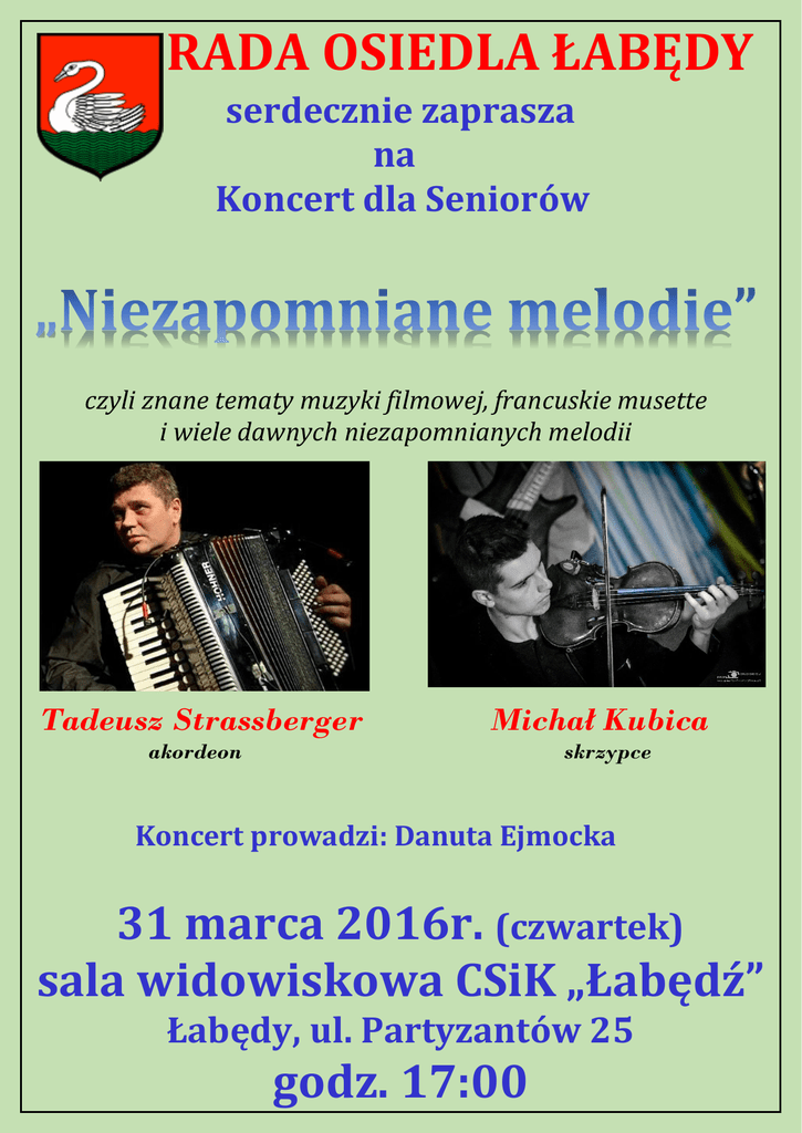 RADA OSIEDLA ŁABĘDY serdecznie zaprasza na Koncert dla Seniorów czyli znane tematy muzyki filmowej, francuskie musette i wiele dawnych niezapomnianych melodii Tadeusz Strassberger Michał Kubica akordeon skrzypce Koncert prowadzi: Danuta Ejmocka 31 marca 2016r. (czwartek) sala widowiskowa CSiK „Łabędź” Łabędy, ul. Partyzantów 25 godz. 17:00