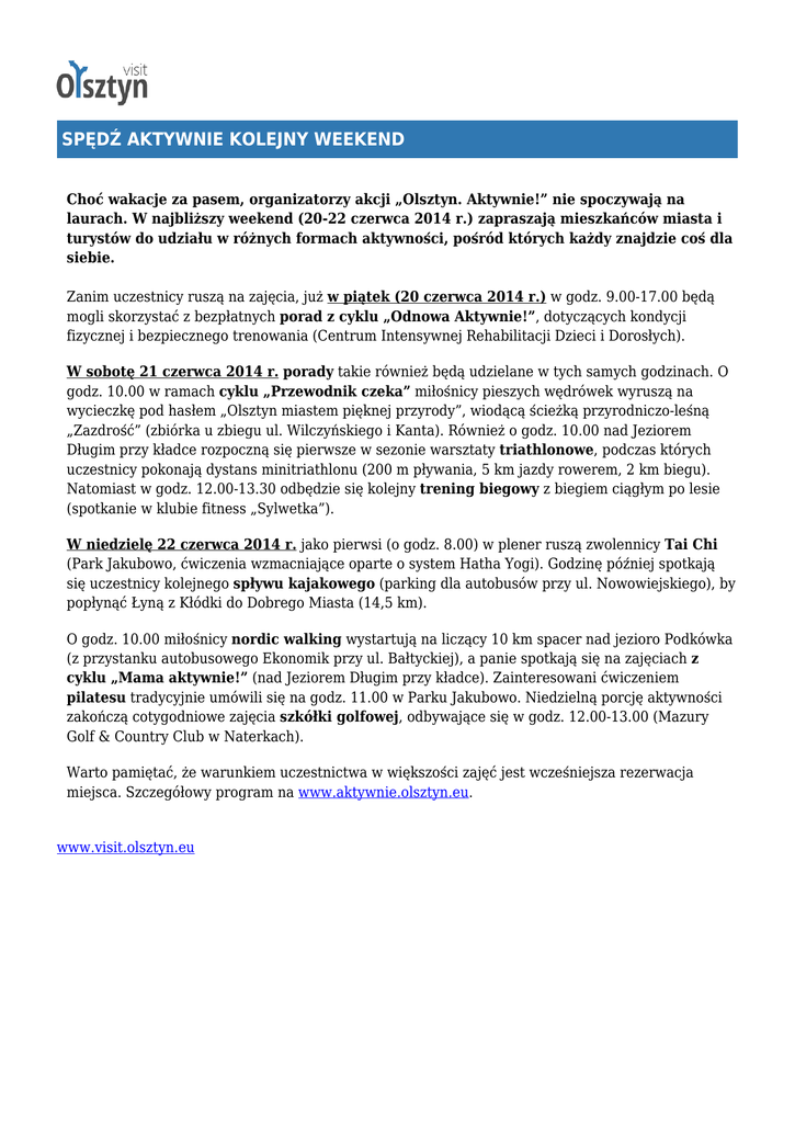 SPĘDŹ AKTYWNIE KOLEJNY WEEKEND Choć wakacje za pasem, organizatorzy akcji „Olsztyn. Aktywnie!” nie spoczywają na laurach. W najbliższy weekend (20-22 czerwca 2014 r.) zapraszają mieszkańców miasta i turystów do udziału w różnych formach aktywności, pośród których każdy znajdzie coś dla siebie. Zanim uczestnicy ruszą na zajęcia, już w piątek (20 czerwca 2014 r.) w godz. 9.00-17.00 będą mogli skorzystać z bezpłatnych porad z cyklu „Odnowa Aktywnie!”, dotyczących kondycji fizycznej i bezpiecznego trenowania (Centrum Intensywnej Rehabilitacji Dzieci i Dorosłych). W sobotę 21 czerwca 2014 r. porady takie również będą udzielane w tych samych godzinach. O godz. 10.00 w ramach cyklu „Przewodnik czeka” miłośnicy pieszych wędrówek wyruszą na wycieczkę pod hasłem „Olsztyn miastem pięknej przyrody”, wiodącą ścieżką przyrodniczo-leśną „Zazdrość” (zbiórka u zbiegu ul. Wilczyńskiego i Kanta). Również o godz. 10.00 nad Jeziorem Długim przy kładce rozpoczną się pierwsze w sezonie warsztaty triathlonowe, podczas których uczestnicy pokonają dystans minitriathlonu (200 m pływania, 5 km jazdy rowerem, 2 km biegu). Natomiast w godz. 12.00-13.30 odbędzie się kolejny trening biegowy z biegiem ciągłym po lesie (spotkanie w klubie fitness „Sylwetka”). W niedzielę 22 czerwca 2014 r. jako pierwsi (o godz. 8.00) w plener ruszą zwolennicy Tai Chi (Park Jakubowo, ćwiczenia wzmacniające oparte o system Hatha Yogi). Godzinę później spotkają się uczestnicy kolejnego spływu kajakowego (parking dla autobusów przy ul. Nowowiejskiego), by popłynąć Łyną z Kłódki do Dobrego Miasta (14,5 km). O godz. 10.00 miłośnicy nordic walking wystartują na liczący 10 km spacer nad jezioro Podkówka (z przystanku autobusowego Ekonomik przy ul. Bałtyckiej), a panie spotkają się na zajęciach z cyklu „Mama aktywnie!” (nad Jeziorem Długim przy kładce). Zainteresowani ćwiczeniem pilatesu tradycyjnie umówili się na godz. 11.00 w Parku Jakubowo. Niedzielną porcję aktywności zakończą cotygodniowe zajęcia szkółki golfowej, odbywające się w godz. 12.00-13.00 (Mazury Golf & Country Club w Naterkach). Warto pamiętać, że warunkiem uczestnictwa w większości zajęć jest wcześniejsza rezerwacja miejsca. Szczegółowy program na www.aktywnie.olsztyn.eu. www.visit.olsztyn.eu