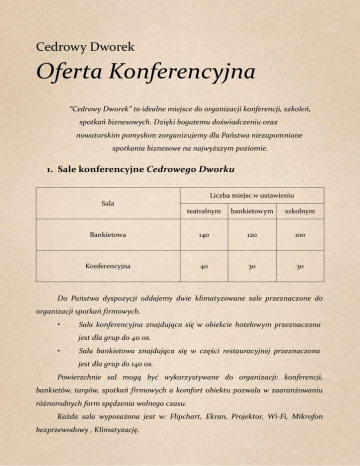 Cedrowy Dworek Oferta Konferencyjna “Cedrowy Dworek” to idealne miejsce do organizacji konferencji, szkoleń, spotkań biznesowych. Dzięki bogatemu doświadczeniu oraz nowatorskim pomysłom zorganizujemy dla Państwa niezapomniane spotkania biznesowe na najwyższym poziomie. 1. Sale konferencyjne Cedrowego Dworku Sala Liczba miejsc w ustawieniu teatralnym bankietowym szkolnym Bankietowa 140 120 100 Konferencyjna 40 30 30 Do Państwa dyspozycji oddajemy dwie klimatyzowane sale przeznaczone do organizacji spotkań firmowych. • Sala konferencyjna znajdująca się w obiekcie hotelowym przeznaczona jest dla grup do 40 os. • Sala bankietowa znajdująca się w części restauracyjnej przeznaczona jest dla grup do 140 os. Powierzchnie sal mogą być wykorzystywane do organizacji: konferencji, bankietów, targów, spotkań firmowych a komfort obiektu pozwala w zaaranżowaniu różnorodnych form spędzenia wolnego czasu. Każda sala wyposażona jest w: Flipchart, Ekran, Projektor, Wi-Fi, Mikrofon bezprzewodowy , Klimatyzację. 2. Koszt wynajęcia Sali Konferencyjnej SALA KONFERENCYJNA CENA STANDARDOWA powierzchnia ilość godzin PLN bez VAT 70 m2 do 8h 600,00 SALA KONFERENCYJNA CENA STANDARDOWA powierzchnia ilość godzin PLN bez VAT 300 m2 do 8h 1 200,00 3. Miejsca noclegowe Do Państwa dyspozycji oddajemy 80 miejsc noclegowych w pokojach dwu, trzy i czteroosobowe- wszystkie z łazienkami oraz bezprzewodowym dostępem do Internetu. Szerokie, wygodne łóżka pomogą zrelaksować się i wypocząć a serwowane w naszej restauracji śniadania zagwarantują miło zaczęty dzień. Dla wszystkich Gości zapewniamy dozorowany parking oraz Wi-Fi. 4. Propozycje przerw kawowych Przerwa kawowa Cena/osoba PLN bez VAT Wariant 1 kawa, herbata, woda, kruche ciasteczka (b/o) Wariant 2 kawa, herbata, woda, soki, kruche ciasteczka, kanapki (b/o) 25,00 35,00 5. Propozycje obiadów i uroczystych kolacji Cedrowy Dworek to idealne miejsca dla osób ceniących sobie cieszę, kameralną atmosferę oraz wyśmienitą kuchnię. Zachęcamy Państwa do zakończenia spotkania obiadem lub uroczystym poczęstunkiem. Z przyjemnością przygotujemy kolację, bankiet lub żuławskie biesiadowanie przy palenisku. Aby otrzymać szczegółową ofertę uprzejmie prosimy o kontakt: tel.: 885 300 332 lub e-mail.: [email protected] W 2015r. Szef Kuchni Cedrowego Dworku zdobył I miejsce w „Plebiscycie Smakosz” dla najlepszego kucharza Powiatu Gdańskiego. organizowanym przez Dziennik Bałtycki.