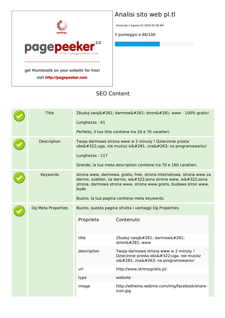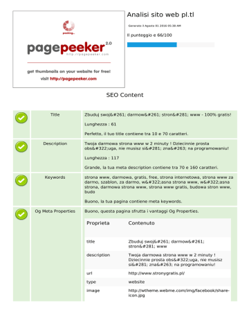 Analisi sito web pl.tl Generato il Agosto 01 2016 05:38 AM Il punteggio e 66/100 SEO Content Title Zbuduj swoją darmową stronę www - 100% gratis! Lunghezza : 61 Perfetto, il tuo title contiene tra 10 e 70 caratteri. Description Twoja darmowa strona www w 2 minuty ! Dziecinnie prosta obsługa, nie musisz się znać na programowaniu! Lunghezza : 117 Grande, la tua meta description contiene tra 70 e 160 caratteri. Keywords strona www, darmowa, gratis, free, strona internetowa, strona www za darmo, szablon, za darmo, własna strona www, własna strona, darmowa strona www, strona www gratis, budowa stron www, budo Buono, la tua pagina contiene meta keywords. Og Meta Properties Buono, questa pagina sfrutta i vantaggi Og Properties. Proprieta Contenuto title Zbuduj swoją darmową stronę www description Twoja darmowa strona www w 2 minuty ! Dziecinnie prosta obsługa, nie musisz się znać na programowaniu! url http://www.stronygratis.pl/ type website image http://wtheme.webme.com/img/facebook/shareicon.jpg SEO Content site_name Headings H1 1 Stronygratis.pl H2 5 H3 7 H4 0 H5 0 H6 0 [H1] Moja własna strona internetowa! 100% gratis i ponad 11 milionów użytkowników! [H2] Tak mogłaby wyglądać twoja strona internetowa: [H2] Najlepsze powody za Baukasten: [H2] 100% za darmo! [H2] Bez programowania! [H2] Google-Optimizer [H3] Super szablony do designu [H3] Kompatybilny z Web 2.0 [H3] Obsługuje wszystkie urządzenia [H3] Baukasten [H3] Pakiety Premium [H3] Pomoc [H3] Pozostałe Images Abbiamo trovato 26 immagini in questa pagina web. Buono, molte o tutte le tue immagini hanno attributo alt Text/HTML Ratio Ratio : 33% Ideale! Il rapporto testo/codice HTML di questa pagina e tra 25 e 70 percento. Flash Iframe Perfetto, non e stato rilevato contenuto Flash in questa pagina. Molto male, hai usato Iframes nelle tue pagine web, questo significa che in contenuto inserito negli Iframe non puo essere indicizzato. SEO Links URL Rewrite Buono. I tuoi links appaiono friendly! Underscores in the URLs Perfetto! Non sono stati rilevati underscores nei tuoi URLs. In-page links Abbiamo trovato un totale di 23 links inclusi 0 link(s) a files Statistics External Links : noFollow 0% External Links : Passing Juice 91.3% SEO Links Internal Links 8.7% In-page links Anchor Type Juice Rejestracja Interno Passing Juice login Externo Passing Juice Porady Externo Passing Juice Ulepszenie Premium Interno Passing Juice AGB Externo Passing Juice Datenschutz¬erklärung Externo Passing Juice Deutsch Externo Passing Juice English Externo Passing Juice Español Externo Passing Juice Français Externo Passing Juice Italiano Externo Passing Juice Polski Externo Passing Juice Русскиl 1; Externo Passing Juice Türkçe Externo Passing Juice Kontakt Externo Passing Juice Regulamin Externo Passing Juice Ochrona danych Externo Passing Juice Strony przykładowe Externo Passing Juice Forum Externo Passing Juice Support Externo Passing Juice Ochrona nieletnich Externo Passing Juice Organy śledcze Externo Passing Juice Nadużycie Externo Passing Juice SEO Keywords Keywords Cloud strona się internetowa stronę premium jest twoja nie aby tak Consistenza Keywords Keyword Contenuto nie 8 stronę 8 jest 6 strona 6 twoja 5 Title Keywords Description Headings Usabilita Url Dominio : pl.tl Lunghezza : 5 Favicon Grande, il tuo sito usa una favicon. Stampabilita Non abbiamo riscontrato codice CSS Print-Friendly. Lingua Buono. La tua lingua dichiarata pl. Dublin Core Questa pagina non sfrutta i vantaggi di Dublin Core. Documento Doctype HTML 5 Encoding Non hai specificato il charset per i documenti. Usa questo generatore gratuito di meta tagr per dichiarare il charset dei documenti. Documento Validita W3C Errori : 3 Avvisi : 0 Email Privacy Grande. Nessun indirizzo mail e stato trovato in plain text! Deprecated HTML Grande! Non abbiamo trovato tags HTML deprecati nel tuo codice. Suggerimenti per velocizzare Eccellente, il tuo sito web non utilizza nested tables. Molto male, il tuo sito web utilizza stili CSS inline. Grande, il tuo sito web ha pochi file CSS. Molto male, il tuo sito web ha troppi file JS (piu di 6). Perfetto, il vostro sito si avvale di gzip. Mobile Mobile Optimization Apple Icon Meta Viewport Tag Flash content Ottimizzazione XML Sitemap Grande, il vostro sito ha una sitemap XML. http://pl.tl/sitemap.xml Robots.txt http://pl.tl/robots.txt Grande, il vostro sito ha un file robots.txt. Analytics Grande, il vostro sito ha uno strumento di analisi dei dati. Google Analytics Powered by TCPDF (www.tcpdf.org)