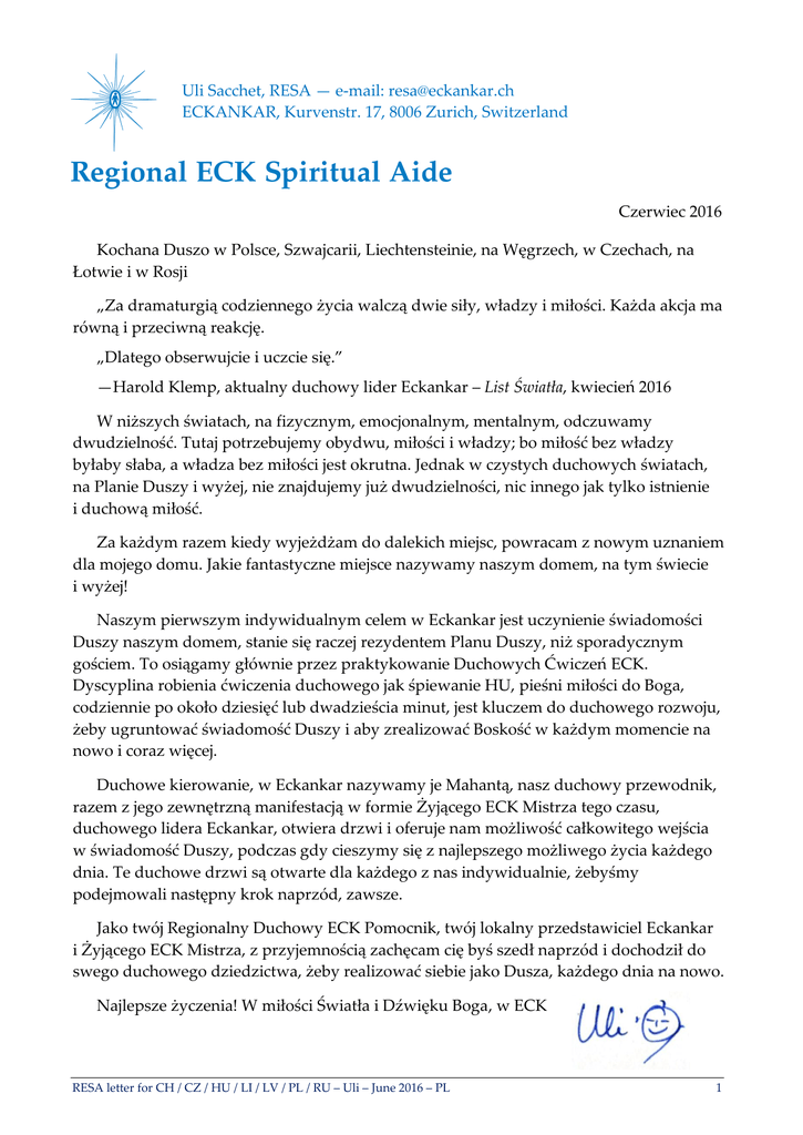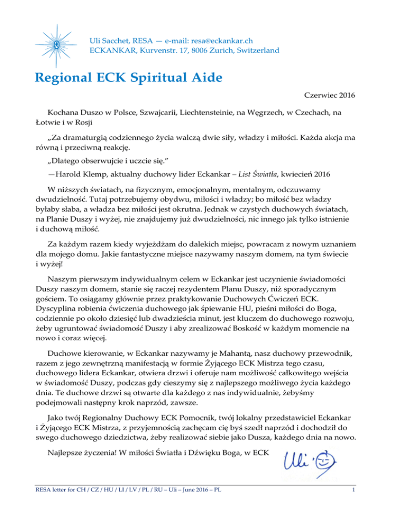 Uli Sacchet, RESA — e-mail: [email protected] ECKANKAR, Kurvenstr. 17, 8006 Zurich, Switzerland Czerwiec 2016 Kochana Duszo w Polsce, Szwajcarii, Liechtensteinie, na Węgrzech, w Czechach, na Łotwie i w Rosji „Za dramaturgią codziennego życia walczą dwie siły, władzy i miłości. Każda akcja ma równą i przeciwną reakcję. „Dlatego obserwujcie i uczcie się.” —Harold Klemp, aktualny duchowy lider Eckankar – List Światła, kwiecień 2016 W niższych światach, na fizycznym, emocjonalnym, mentalnym, odczuwamy dwudzielność. Tutaj potrzebujemy obydwu, miłości i władzy; bo miłość bez władzy byłaby słaba, a władza bez miłości jest okrutna. Jednak w czystych duchowych światach, na Planie Duszy i wyżej, nie znajdujemy już dwudzielności, nic innego jak tylko istnienie i duchową miłość. Za każdym razem kiedy wyjeżdżam do dalekich miejsc, powracam z nowym uznaniem dla mojego domu. Jakie fantastyczne miejsce nazywamy naszym domem, na tym świecie i wyżej! Naszym pierwszym indywidualnym celem w Eckankar jest uczynienie świadomości Duszy naszym domem, stanie się raczej rezydentem Planu Duszy, niż sporadycznym gościem. To osiągamy głównie przez praktykowanie Duchowych Ćwiczeń ECK. Dyscyplina robienia ćwiczenia duchowego jak śpiewanie HU, pieśni miłości do Boga, codziennie po około dziesięć lub dwadzieścia minut, jest kluczem do duchowego rozwoju, żeby ugruntować świadomość Duszy i aby zrealizować Boskość w każdym momencie na nowo i coraz więcej. Duchowe kierowanie, w Eckankar nazywamy je Mahantą, nasz duchowy przewodnik, razem z jego zewnętrzną manifestacją w formie Żyjącego ECK Mistrza tego czasu, duchowego lidera Eckankar, otwiera drzwi i oferuje nam możliwość całkowitego wejścia w świadomość Duszy, podczas gdy cieszymy się z najlepszego możliwego życia każdego dnia. Te duchowe drzwi są otwarte dla każdego z nas indywidualnie, żebyśmy podejmowali następny krok naprzód, zawsze. Jako twój Regionalny Duchowy ECK Pomocnik, twój lokalny przedstawiciel Eckankar i Żyjącego ECK Mistrza, z przyjemnością zachęcam cię byś szedł naprzód i dochodził do swego duchowego dziedzictwa, żeby realizować siebie jako Dusza, każdego dnia na nowo. Najlepsze życzenia! W miłości Światła i Dźwięku Boga, w ECK RESA letter for CH / CZ / HU / LI / LV / PL / RU – Uli – June 2016 – PL 1 Wybrane regionalne i światowe ECK wydarzenia 27–28 sierpnia — Szwajcarskie Krajowe ECK Regionalne Seminarium w Biel/Bienne – z honorowym mówcą Billem Elberty, RESA Vermontu, USA – Was ist spirituelle Freiheit? / Qu’est-ce que la liberté spirituelle? Rejestracja online na naszej odnowionej stronie www.eckankar.ch 18 sierpnia — Dwuczęściowy warsztat Eckankar w Olten, SO, Szwajcaria – z Nancy Pang i Philem Morimitsu, ko-RESA Hong Kongu, Chiny – Light and Sound, the Mahanta, Soul, Karma, Goals and Plans / Licht und Ton, der Mahanta, Seele, Karma, Ziele und Pläne 24–25 września — ECK Regionalne Seminarium w Budapeszcie, Węgry – z honorowym mówcą Philem Morimitsu, RESA Hong Kongu, Chiny – A spirituális álmodás művészete / Umění duchovního snění / Sztuka duchowego śnienia / Die Kunst, spirituell zu träumen / The Art of Spiritual Dreaming 21–23 paźdz. — Światowe ECK Seminarium w Minneapolis, USA – ze Sri Haroldem Klemp, Mahantą, Żyjącym ECK Mistrzem – Year of the ECK Missionary / Rok ECK Misjonarza 14–16 kwiet. 2017— Wiosenne ECK Seminarium w Minneapolis, USA – ze Sri Haroldem Klemp, Mahantą, Żyjącym ECK Mistrzem – Reach Your Golden Potential in Year of the ECK Missionary / Osiągnij swój złoty potencjał w Roku ECK Misjonarza 4–6 sierp. 2017 — ECK Europejskie Seminarium w Niemczech (prawdopodobnie w Mainz) Odnowiony szwajcarski internetowy serwis Eckankar Nasz szwajcarski serwis Eckankar www.eckankar.ch powraca w całkowicie zmienionym wyglądzie i dostosowuje się do różnych rozmiarów ekranów, od dużych monitorów po małe smartfony. www.eckankar.org – www.eckankar.ch – www.eckankar.cz – www.eckankar.hu – www.eckankar.pl RESA letter for CH / CZ / HU / LI / LV / PL / RU – Uli – June 2016 – PL 2