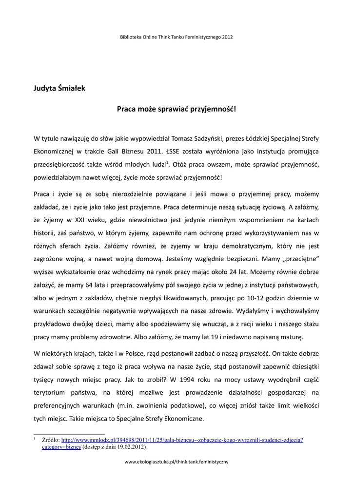 Biblioteka Online Think Tanku Feministycznego 2012 Judyta Śmiałek Praca może sprawiać przyjemność! W tytule nawiązuję do słów jakie wypowiedział Tomasz Sadzyński, prezes Łódzkiej Specjalnej Strefy Ekonomicznej w trakcie Gali Biznesu 2011. ŁSSE została wyróżniona jako instytucja promująca przedsiębiorczość także wśród młodych ludzi 1. Otóż praca owszem, może sprawiać przyjemność, powiedziałabym nawet więcej, życie może sprawiać przyjemność! Praca i życie są ze sobą nierozdzielnie powiązane i jeśli mowa o przyjemnej pracy, możemy zakładać, że i życie jako tako jest przyjemne. Praca determinuje naszą sytuację życiową. A załóżmy, że żyjemy w XXI wieku, gdzie niewolnictwo jest jedynie niemiłym wspomnieniem na kartach historii, zaś państwo, w którym żyjemy, zapewniło nam ochronę przed wykorzystywaniem nas w różnych sferach życia. Załóżmy również, że żyjemy w kraju demokratycznym, który nie jest zagrożone wojną, a nawet wojną domową. Jesteśmy względnie bezpieczni. Mamy „przeciętne” wyższe wykształcenie oraz wchodzimy na rynek pracy mając około 24 lat. Możemy równie dobrze założyć, że mamy 64 lata i przepracowałyśmy pół swojego życia w jednej z instytucji państwowych, albo w jednym z zakładów, chętnie niegdyś likwidowanych, pracując po 10-12 godzin dziennie w warunkach szczególnie negatywnie wpływających na nasze zdrowie. Wydałyśmy i wychowałyśmy przykładowo dwójkę dzieci, mamy albo spodziewamy się wnucząt, a z racji wieku i naszego stażu pracy mamy problemy zdrowotne. Albo załóżmy, że mamy lat 19 i niedawno napisaną maturę. W niektórych krajach, także i w Polsce, rząd postanowił zadbać o naszą przyszłość. On także dobrze zdawał sobie sprawę z tego iż praca wpływa na nasze życie, stąd postanowił zapewnić dziesiątki tysięcy nowych miejsc pracy. Jak to zrobił? W 1994 roku na mocy ustawy wyodrębnił część terytorium państwa, na której możliwe jest prowadzenie działalności gospodarczej na preferencyjnych warunkach (m.in. zwolnienia podatkowe), co więcej zniósł także limit wielkości tych miejsc. Takie miejsca to Specjalne Strefy Ekonomiczne. 1 Źródło: http://www.mmlodz.pl/394698/2011/11/25/gala-biznesu--zobaczcie-kogo-wyroznili-studenci-zdjecia? category=biznes (dostęp z dnia 19.02.2012) www.ekologiasztuka.pl/think.tank.feministyczny Biblioteka Online Think Tanku Feministycznego 2012 Co więc mają wspólnego poprzednie założenia z dobrodziejstwem naszego kraju? Otóż, 8 zł brutto za godzinę, czasami 6 zł brutto, umowa zlecenia na miesiąc, zatrudnienie przez Agencję Pracy Tymczasowej, obchodzenie przepisów dotyczących czasu zatrudniania takiego zleceniobiorcę/czynię, poprzez mnożenie się agencji i przerzucanie zatrudnionych do innych agencji. Nieprzestrzeganie przepisów bezpieczeństwa i higieny pracy. Niepewność pracy oraz wynagrodzenia, poprzez „pracę na telefon”. Wyobraźcie sobie teraz, że do pracy musicie przebyć godzinną przeprawę w miejsce, z którego możecie wydostać się np. w nocy tylko poprzez zamówienie taksówki (chyba, że macie własny samochód), albo pieszo. Albo, że jadąc autobusem do pracy jesteście ściśnięci jak sardynki w puszce. Nie wiecie o tym, z kim będziecie pracować, oraz co będziecie robić w trakcie ośmiu godzin pracy z dwudziestominutową przerwą. Wiecie natomiast, że przydadzą wam się plastry na powstałe odciski na dłoniach, albo najlepiej cała podręczna apteczka, ponieważ zakład pracy, w której pracujecie (oprócz was około 200 innych osób), nie zaopatrzył się w takie właśnie „urządzenia”. Zanim jednak dojedziecie do zakładu, macie świadomość tego, że będziecie musieli wrócić do domu, bo nie ma was na liście pracowników dopuszczonych do pracy tego dnia. Dlatego od całkowitego wynagrodzenia, jakie przewidujecie na koniec miesiąca, będziecie musieli odjąć te dni, w których nie będziecie pracować. Ale jest i rozwiązanie! Możecie zamiast kupienia jedzenia, zapłacić czynsz, albo nie zapłacić rachunku za prąd, zaś kupić jedzenie. A jeśli na utrzymaniu, macie jeszcze jakieś inne osoby, no to macie problem. Zanim znajdziecie się w miejscu pracy, musicie wystać swoje w różnych kolejkach, ponieważ nie macie na stałe przydzielonych akcesoriów wymaganych przy pracy. Jesteście w końcu tymczasowymi pracownikami i pracownicami! Przez cały czas musicie zmierzać się ze stereotypem panującym w zakładzie na temat pracowników tymczasowych (nieroby, z ulicy, nic nie umiecie, itp.). A skąd inni ludzie wiedzą, jakie umowy podpisywaliście? Otóż, macie na sobie koszulki poszczególnych agencji przez które jesteście zatrudnieni, łatwo was dojrzeć i łatwo was ocenić. Ale na to jest i sposób! Możecie bardzo dobrze pracować i kierownicy/czki mogą wam zaproponować umowę na stałe – zatrudnienie przez zakład pracy! Z tymże jeśli już się zdecydujecie przejść na stosunkowo bezpieczniejsze i lepsze warunki zatrudnienia, stracicie możliwość bezpłatnego dojazdu www.ekologiasztuka.pl/think.tank.feministyczny Biblioteka Online Think Tanku Feministycznego 2012 do tegoż zakładu. Praca w nocy, czy praca w dzień, w święta, wolne niewolne od pracy, nadgodziny, etc. nie wpływa na wysokość waszego wynagrodzenia, ponieważ macie umowę zlecenia. Stawki za pracę w nocy są owszem wyższe, jednak tylko dla pracowników i pracownic stałych, pomimo, że wasze organizmy oprócz płci, wieku, itp. specjalnie się nie różnią i narażone są na te same warunki zewnętrzne. W ciągu ośmiu godzin, jesteście pod bacznym nadzorem kamer i ochrony (wyjątek stanowią toalety). Nie możecie także opuszczać hali. Każde nieusprawiedliwione wyjście, może skutkować zwolnieniem. Nie możecie mieć przy sobie telefonów, nie możecie zdejmować okularów, nie możecie rozmawiać (chyba że „rączki pracują”). Moż